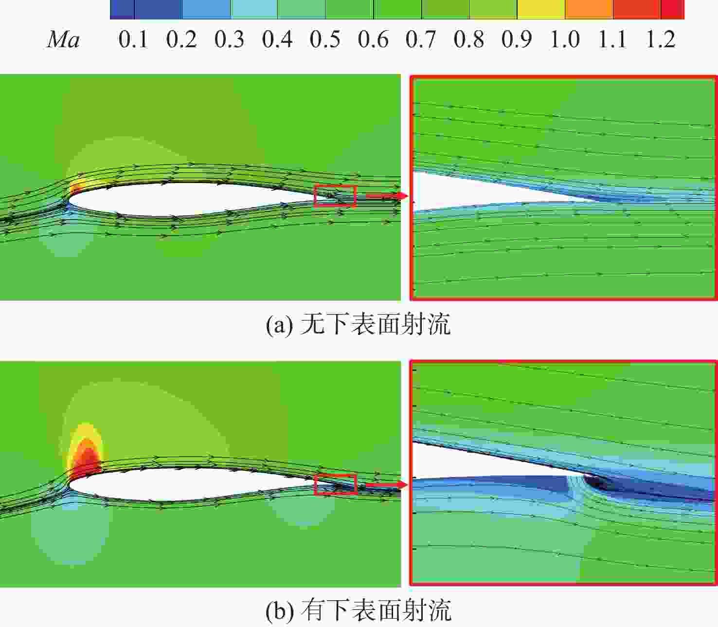 为探究下表面射流关键参数对超临界翼型气动性能的影响,采用雷诺平均Navier-Stokes (RANS)方程与Spalart-Allmaras (S-A)湍流模型进行数值模拟。通过比较基准RAE2822翼型与下表面射流翼型的流场,验证下表面射流能够在翼型后缘诱导产生逆时针分离涡,带动流线向下偏折,增加了翼型的等效弯度,同时加大前缘的吸力峰,从而提高翼型的气动性能。进一步探究射流位置、射流动量系数、射流角度、马赫数等关键参数对RAE2822翼型气动性能的影响规律。结果表明:给定状态下,下表面射流的位置越靠后,动量系数越大,翼型的气动性能越优。下表面射流在