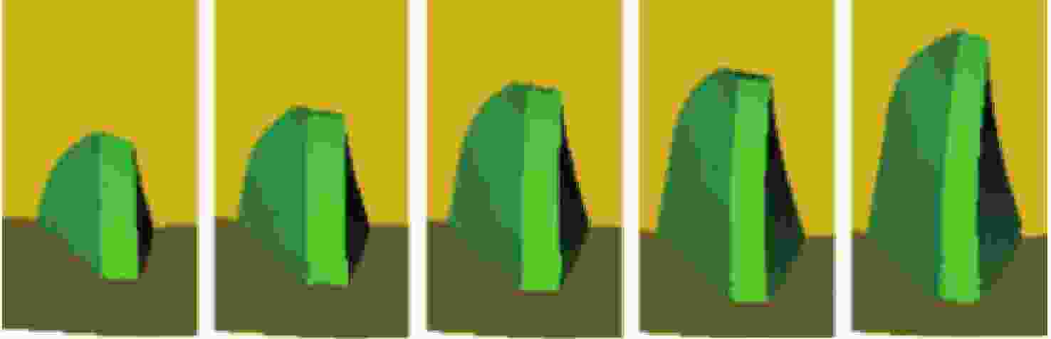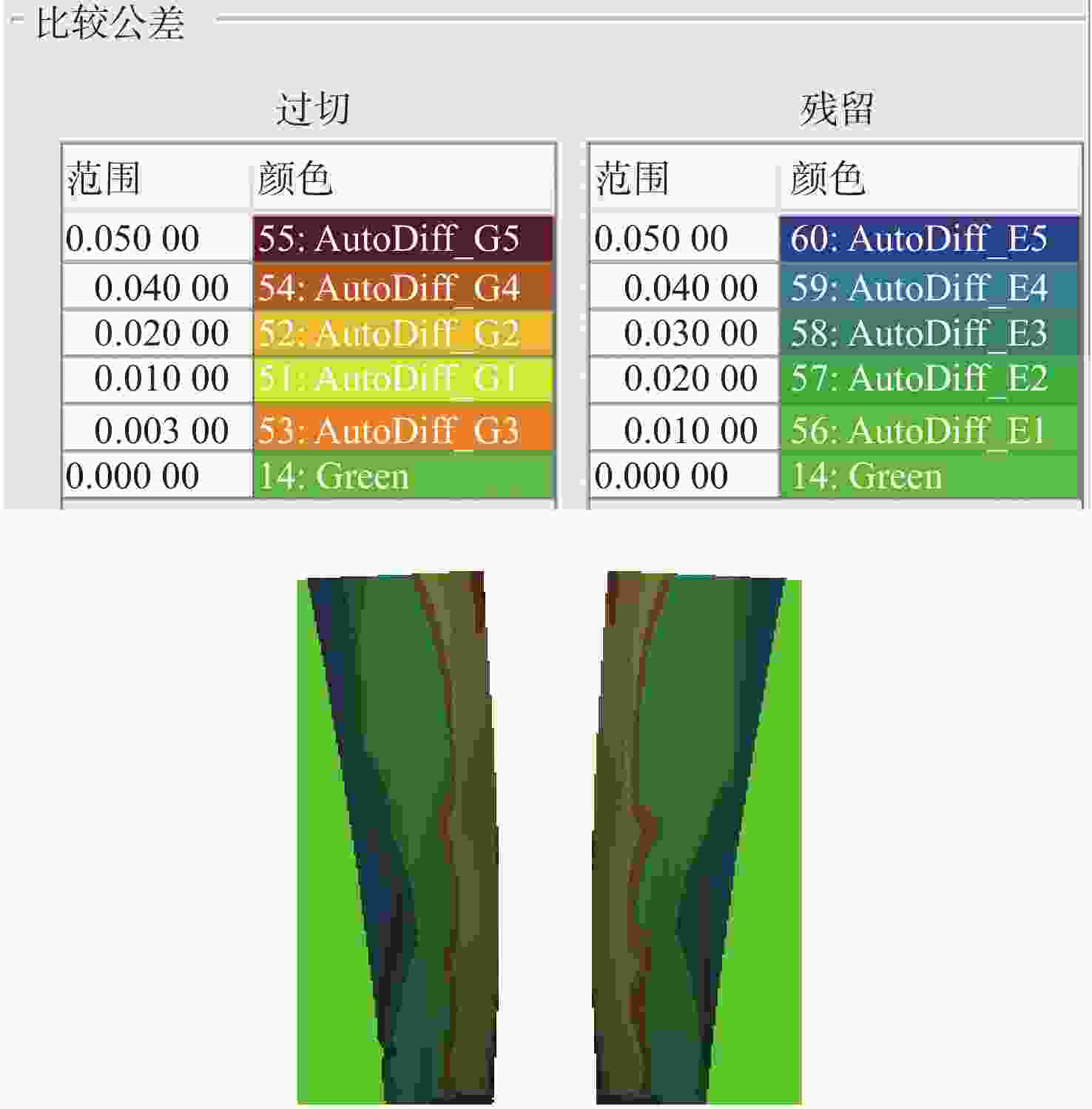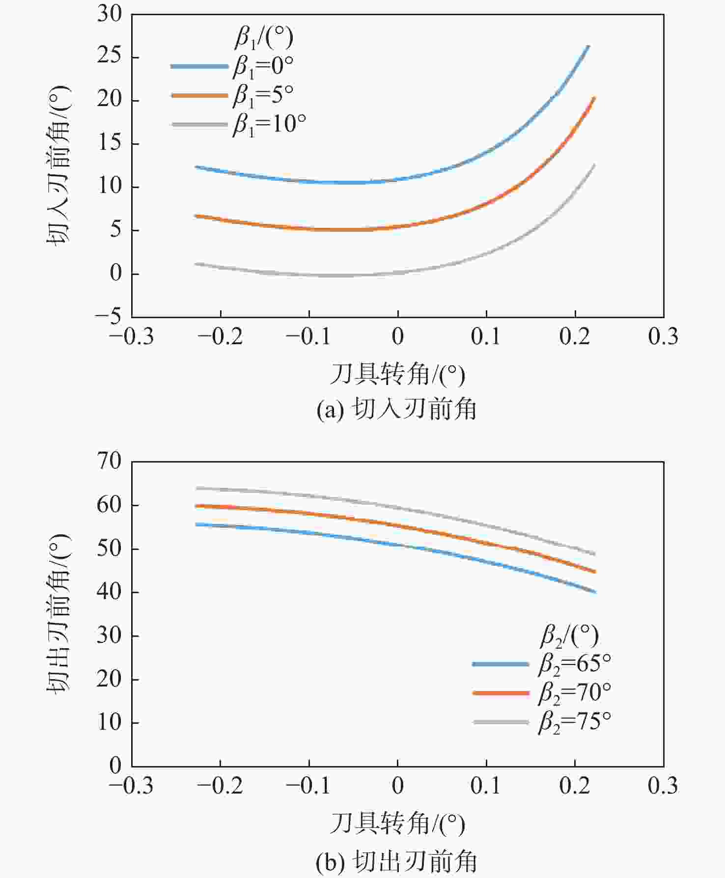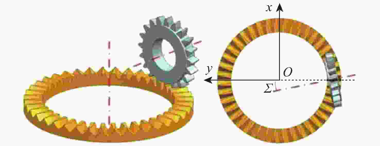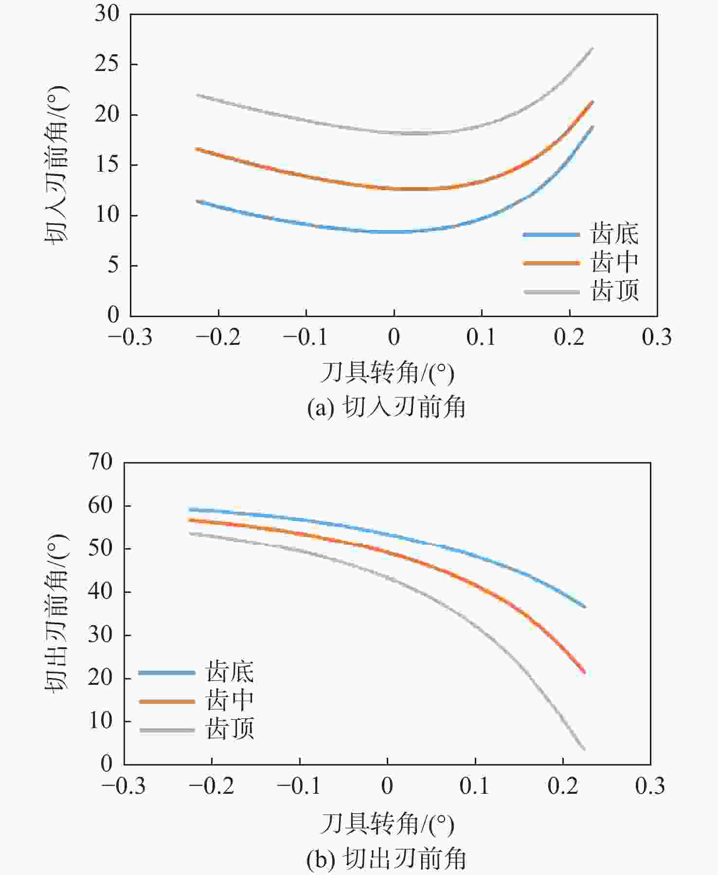 参数 数值 模数m 5 压力角$ \alpha $/(°) 20 螺旋角$ \beta $/(°) 23 安装夹角$\varSigma$/(°) 23 面齿轮齿数${Z}_{2}$ 100 车齿刀齿数${Z}_{\mathrm{s} }$ 70 面齿轮根切内半径$ {R}_{\mathrm{u}} $/mm 48.7 面齿轮变尖外半径$ {R}_{\mathrm{p}} $/mm 54.65 表 2 车齿仿真加工参数