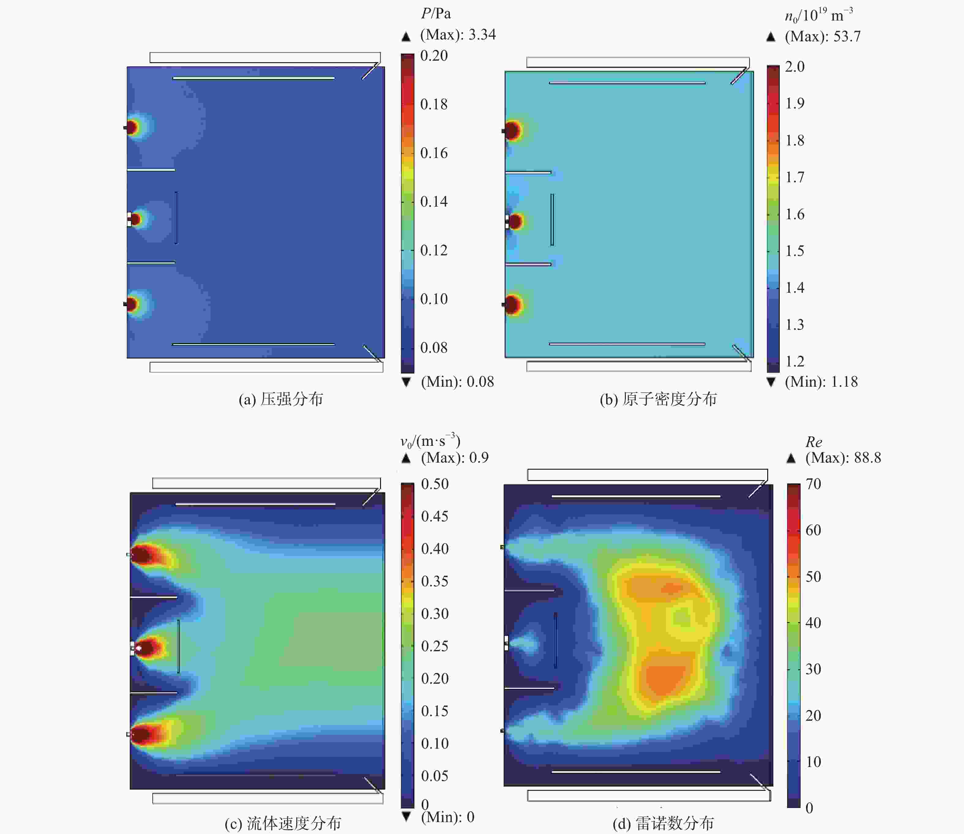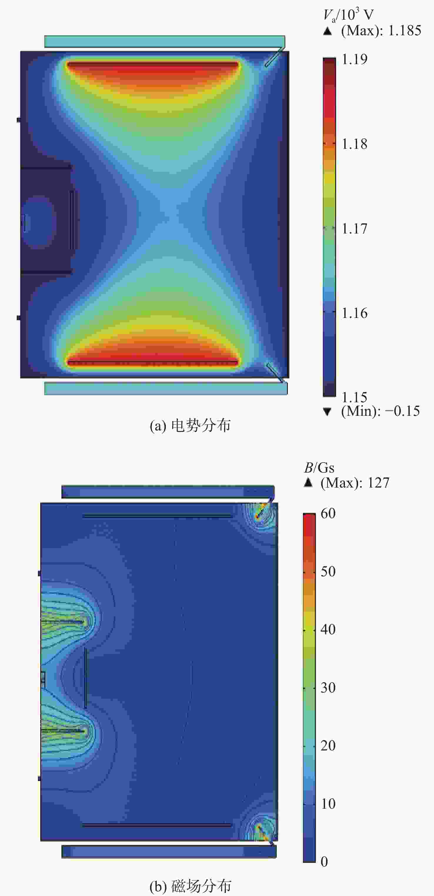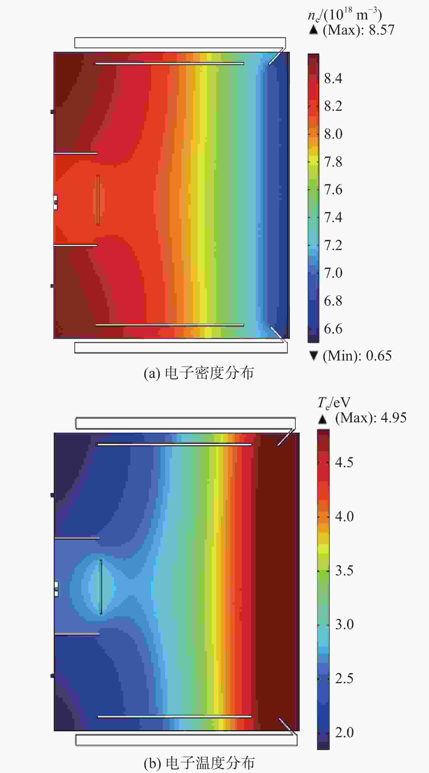 参数 数值 阴极流量/(mg·s−1) 0.08 阳极流量/(mg·s−1) 0.5 中和器流量/(mg·s−1) 0.08 屏栅电势/V 1150 加速栅电势/V −150 触持电势/V 1162 励磁电流/A 0.56 励磁电势/V 1150 挡板电势/V 1150 上磁极电势/V 1150 下磁极电势/V 1150 阳极电势/V 1185 表 2 迁移扩散模块的参数设置