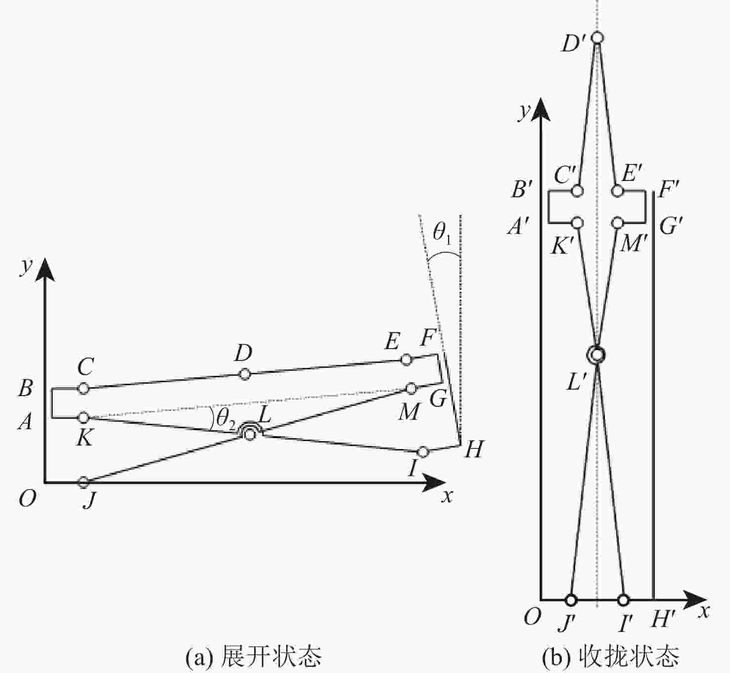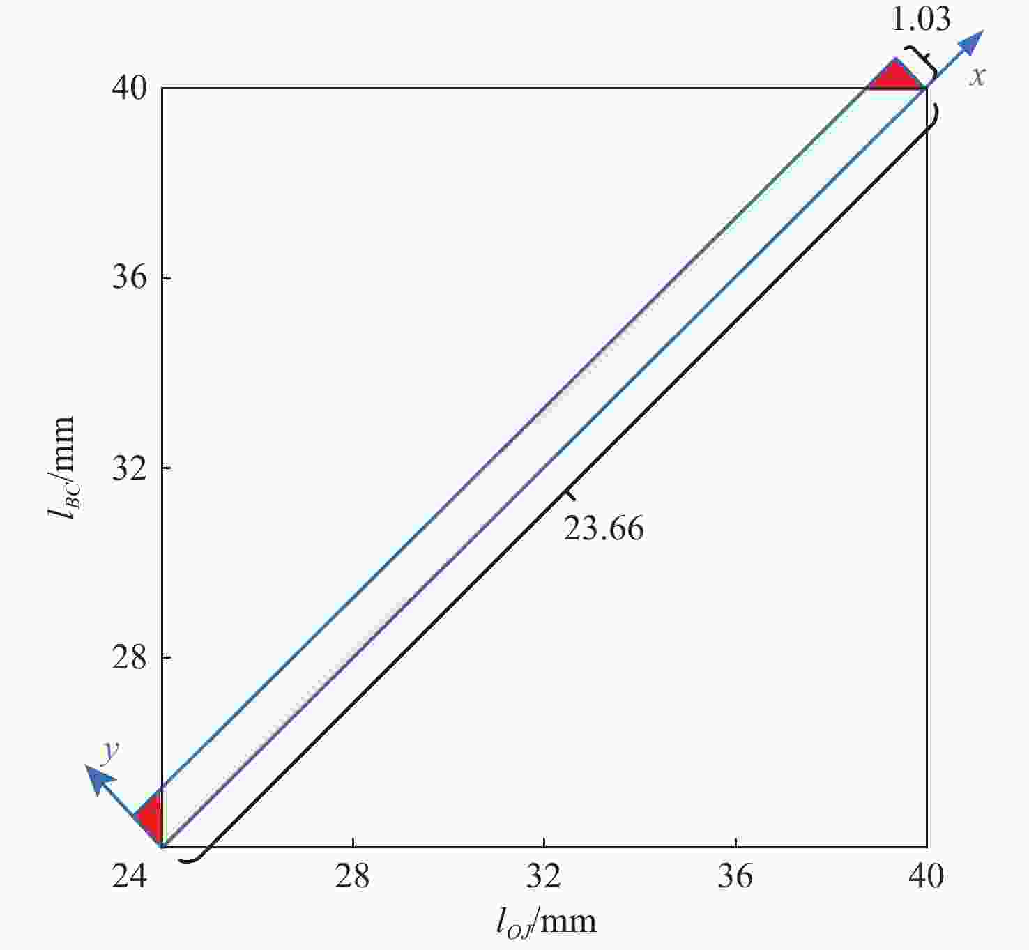类型 $ {l_{OJ}} $/mm $ {l_{BC}} $/mm $ {l_{BC}} $/mm $ {l_{BC}} $/mm $ {l_{BC}} $/mm $ {l_{BC}} $/mm 初始值 39 40 25 12.5 1.216 77.565 最优解 39.513 39.782 21.295 7.944 2.036 50.293 -