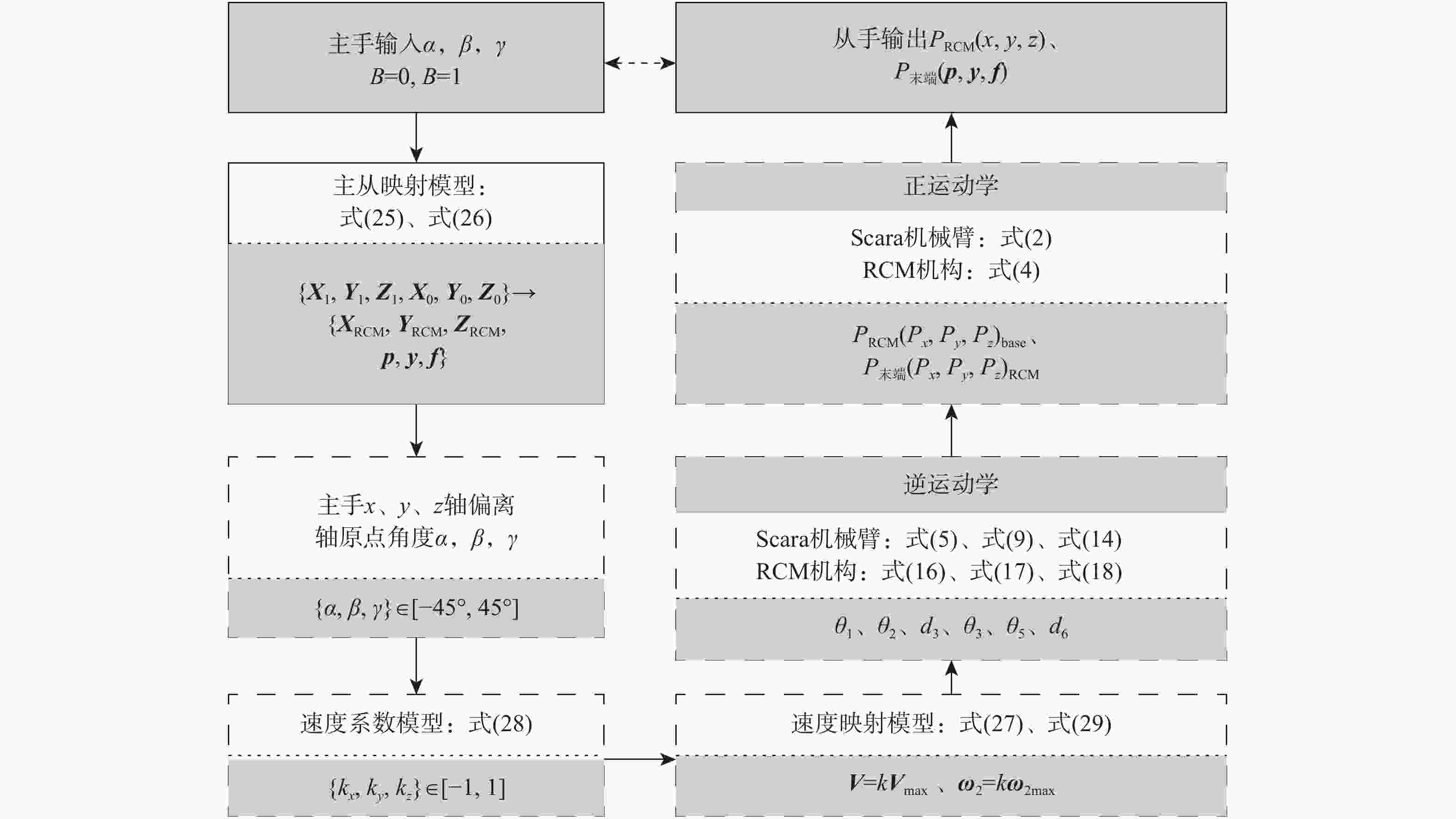 视网膜下注射人胚胎干细胞是治疗视网膜变性的一种有效术式,该术式对医生手术操作的精准性、稳定维持能力、安全性均提出了很高的要求。为此,提出一种基于主从式机器人的视网膜下注射系统,辅助医生完成视网膜下注射操作。构建从手机器人的正逆运动学模型,然后进行视网膜下注射手术运动分析,确定从手机器人的运动要求。建立主手和从手机器人之间的运动映射关系,依据运动映射关系推导建立远程运动中心(RCM)点位置调整运动、术中RCM运动的状态切换和分离过程的速度映射模型。通过离体猪眼球视网膜下穿刺注射实验对机器人的精确性和稳定维持能力进行验证,结果表明:机器人辅助操作系统末端注射针具有稳定维持能力和运动的精确性,机器人辅助操作比徒手操作对视网膜造成的创伤更小,注射更稳定。