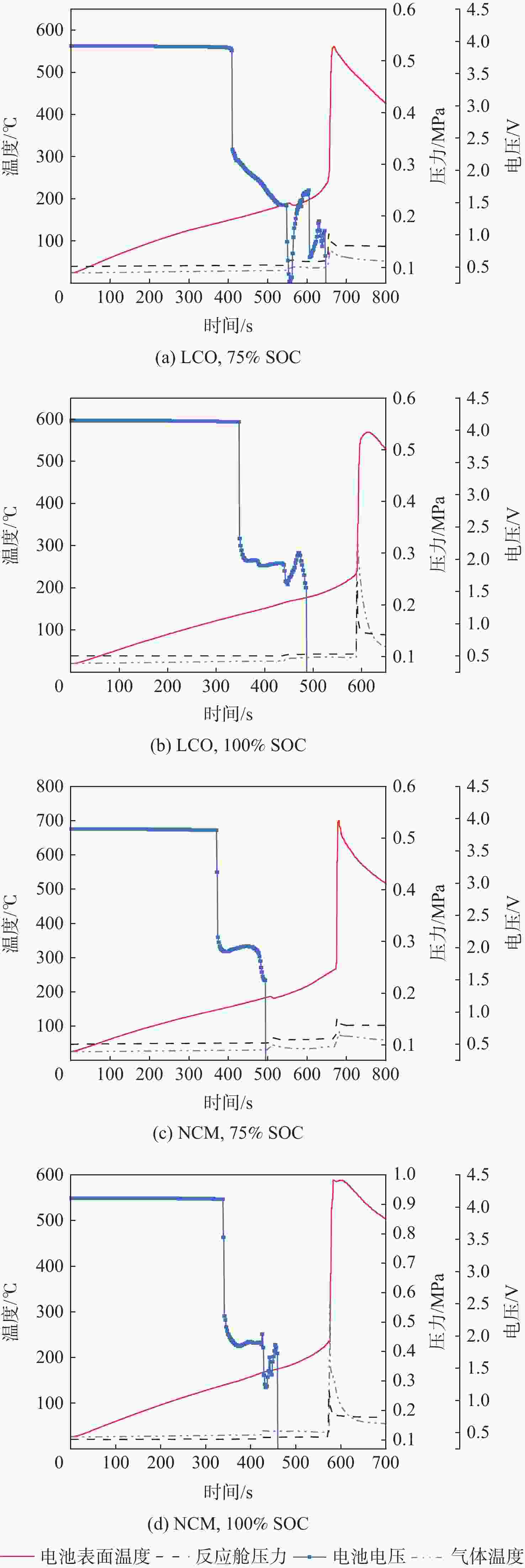 正极材料 T1/℃ T2/℃ ΔP/MPa Tgmax/℃ Tmax/℃ 75%SOC 100%SOC 75%SOC 100%SOC 75%SOC 100%SOC 75%SOC 100%SOC 75%SOC 100%SOC LCO 189.03 164.77 266.43 233.82 0.0386 0.1418 77.9 300.03 561.65 569.24 NCM 186.24 162.59 264.95 232.98 0.0515 0.1656 85.69 321.26 699.95 588.3 表 3 锂离子电池热失控气体分析结果