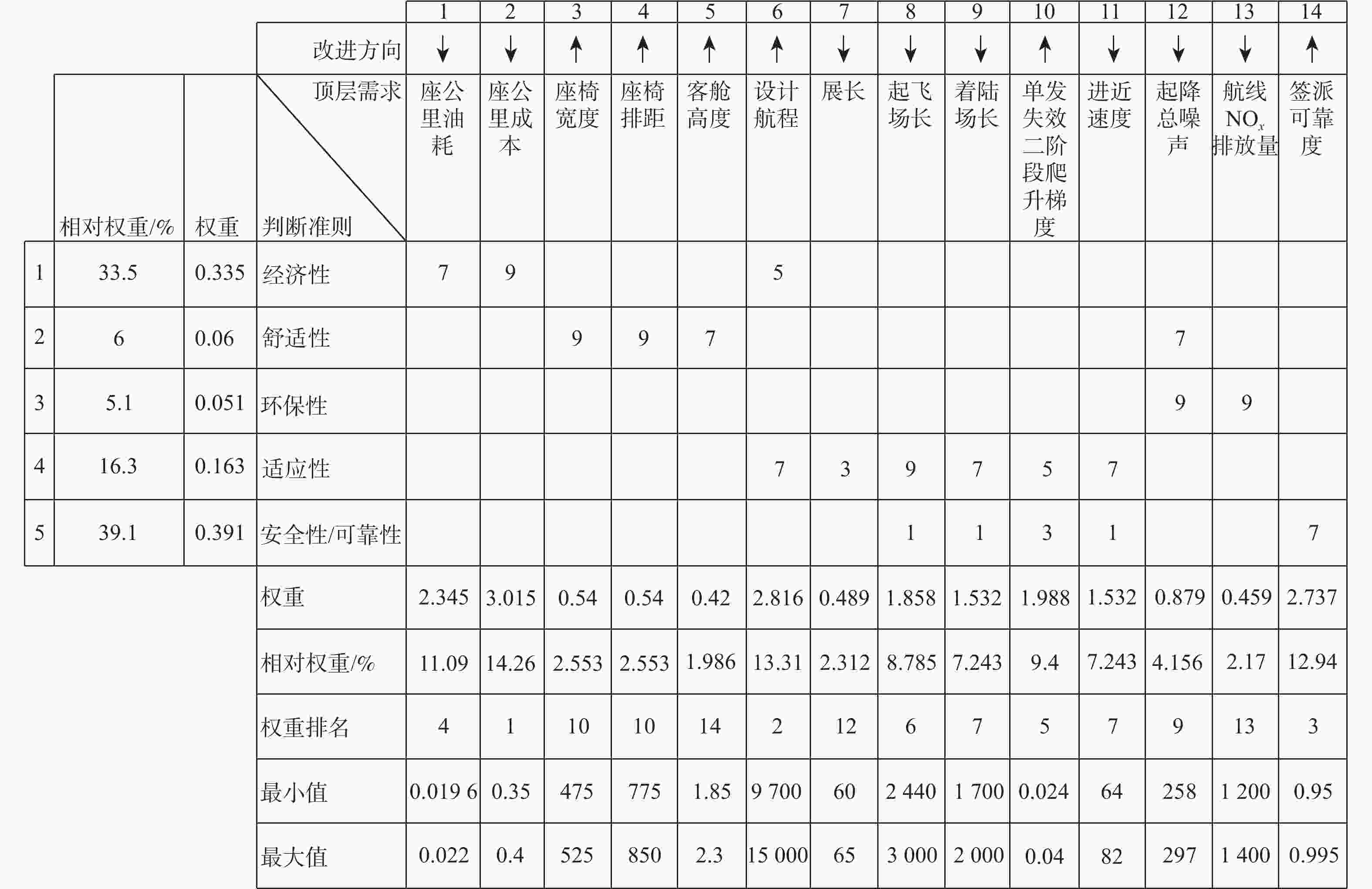 椅排距/mm客舱高度/m 下界 230 300 8.5 25 0.13 475 775 1.8 初始值 334 355 10.5 32 0.14 480 800 2 上界 400 430 11 36 0.15 525 850 2.3 表 5 顶层需求优化前后对比