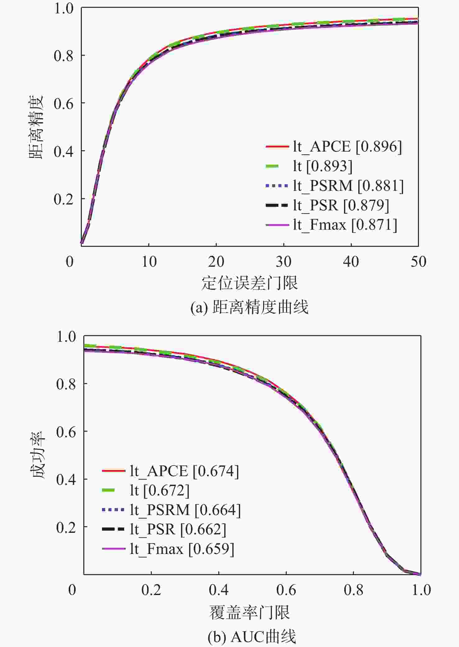 算法 IV SV OC DEF MB FM IPR OPR OV BC LR 本文 0.678 0.639 0.647 0.664 0.673 0.651 0.624 0.652 0.638 0.682 0.550 BACF 0.622 0.572 0.565 0.571 0.575 0.599 0.582 0.578 0.548 0.605 0.532 STRCF 0.652 0.631 0.614 0.605 0.652 0.628 0.602 0.626 0.583 0.647 0.538 SRDCF 0.607 0.559 0.554 0.541 0.594 0.597 0.541 0.547 0.461 0.582 0.495 Staple 0.593 0.518 0.541 0.548 0.540 0.540 0.549 0.534 0.476 0.561 0.399 ARCF 0.600 0.561 0.560 0.583 0.605 0.591 0.562 0.559 0.500 0.588 0.512 AutoTrack 0.604 0.542 0.555 0.559 0.585 0.583 0.554 0.555 0.534 0.562 0.540 ECO_HC 0.603 0.592 0.587 0.587 0.604 0.618 0.553 0.587 0.560 0.603 0.589 LCT 0.517 0.428 0.476 0.481 0.516 0.507 0.529 0.505 0.446 0.528 0.299 HCF 0.550 0.485 0.533 0.530 0.585 0.570 0.566 0.540 0.474 0.585 0.439 HDT 0.529 0.477 0.522 0.540 0.577 0.555 0.536 0.528 0.453 0.544 0.463 注:黑色加粗字体代表当前属性下的最佳跟踪值。 -