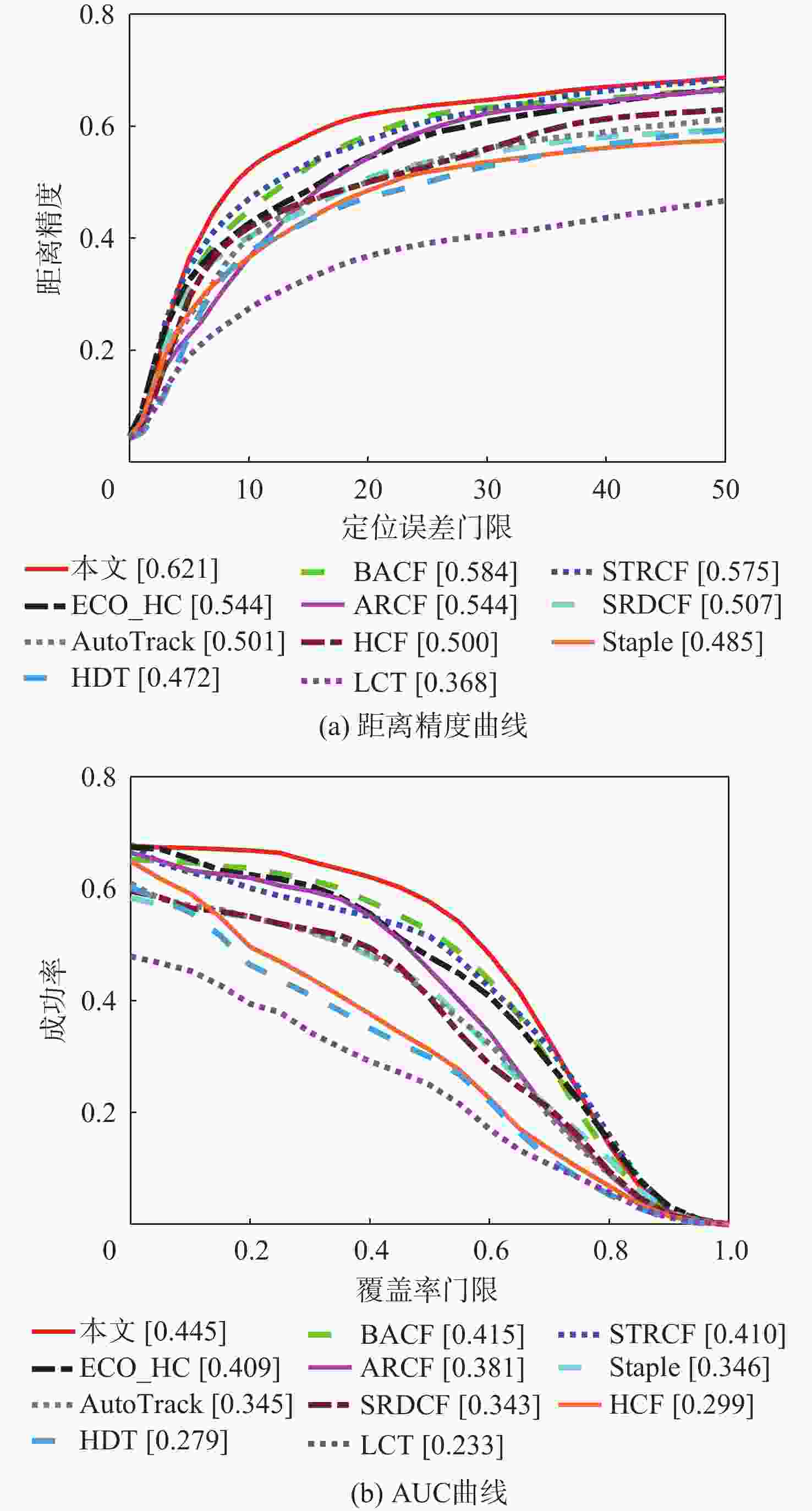 帧/s 算法 OTB2015 TempleColor128 UAV20L 本文 22.41 20.84 19.49 BACF 35.43 36.75 27.13 STRCF 24.28 21.31 19.17 SRDCF 7.60 8.42 6.04 Staple 82.80 79.16 73.71 ARCF 17.80 16.49 16.08 AutoTrack 28.44 27.52 23.46 ECO_HC 59.39 58.64 63.21 LCT 22.78 25.26 29.54 HCF 1.97 1.92 6.70 HDT 3.69 3.57 2.88 表 2 不同算法在OTB2015数据集中11个视频属性上的距离精度
