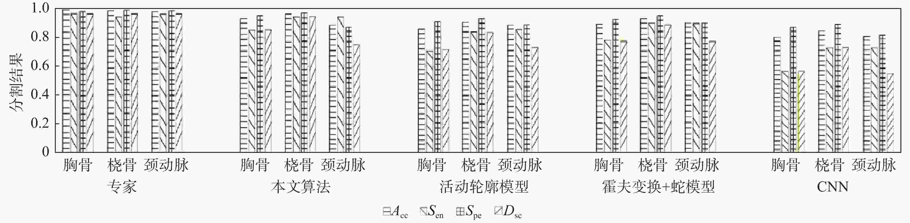 算法 Acc Sen Spe Dsc 胸骨 桡骨 颈动脉 胸骨 桡骨 颈动脉 胸骨 桡骨 颈动脉 胸骨 桡骨 颈动脉 本文 0.93 0.97 0.89 0.86 0.95 0.95 0.95 0.98 0.88 0.86 0.95 0.75 专家 0.99 0.98 0.98 0.97 0.95 0.97 0.99 0.99 0.99 0.97 0.96 0.97 表 2 各算法平均运行时间