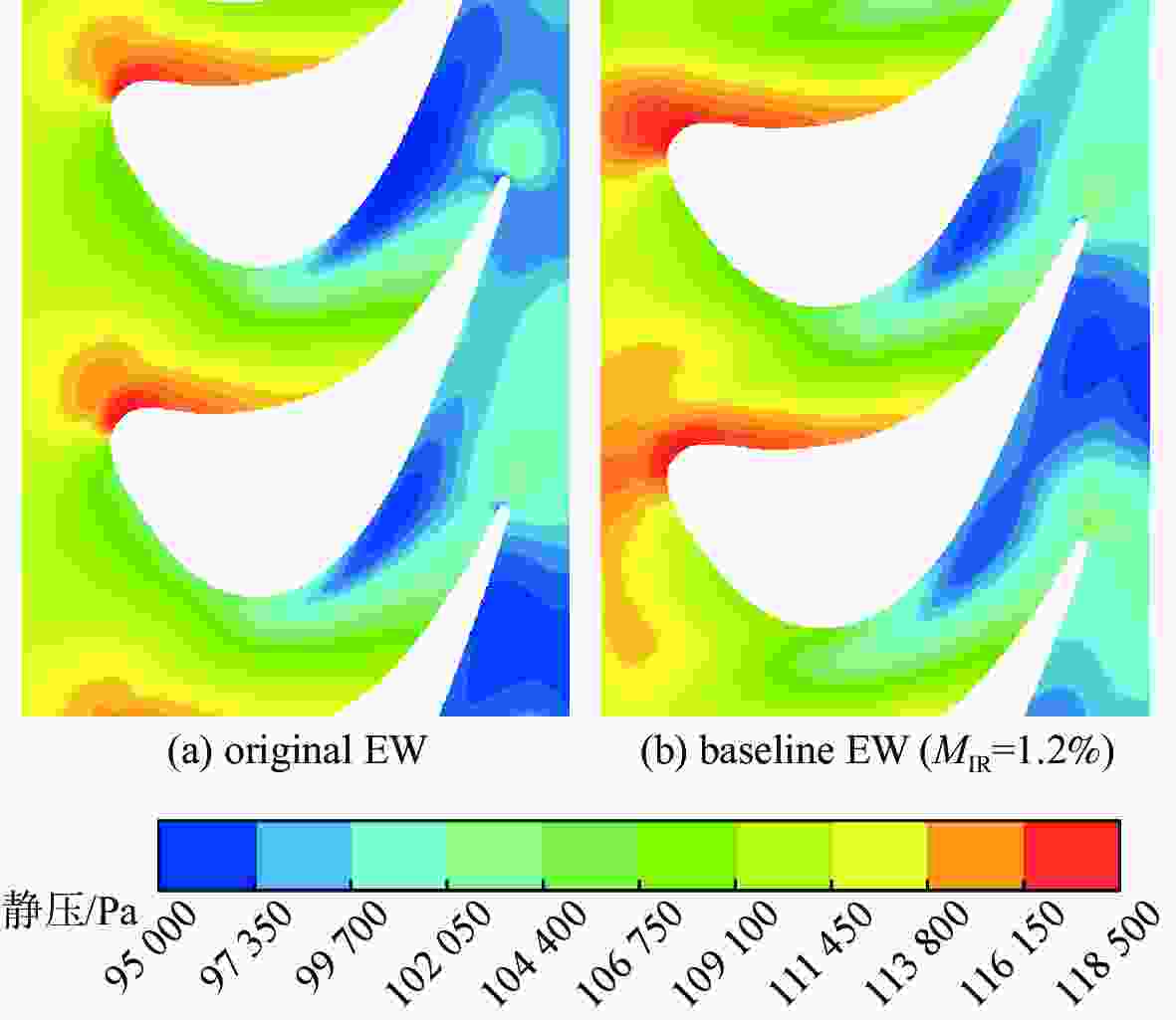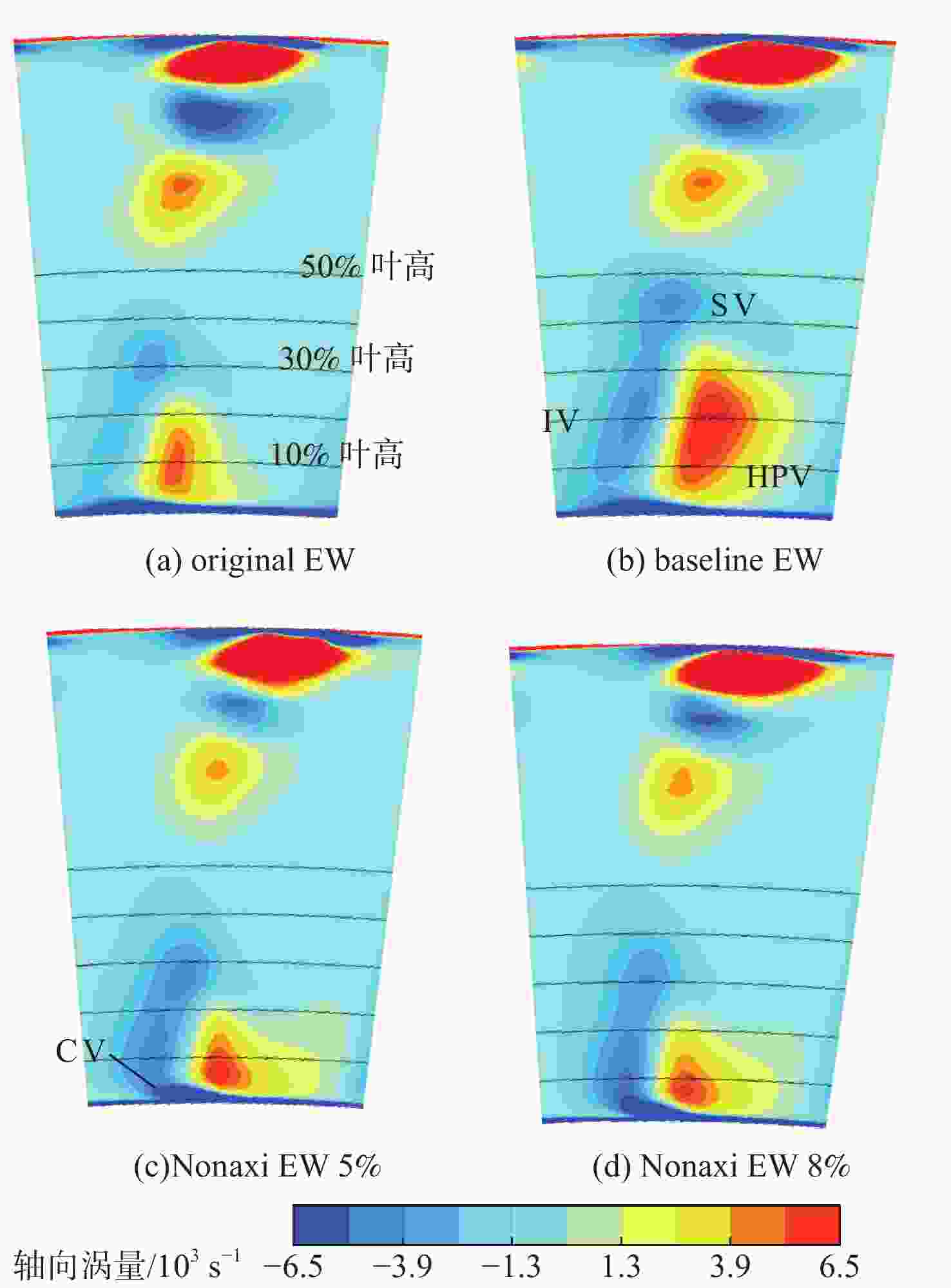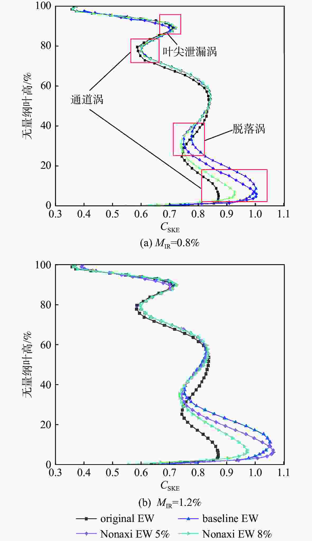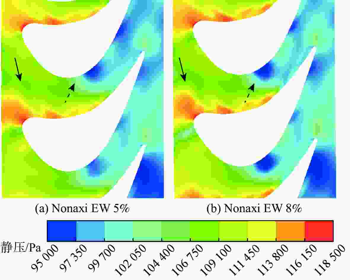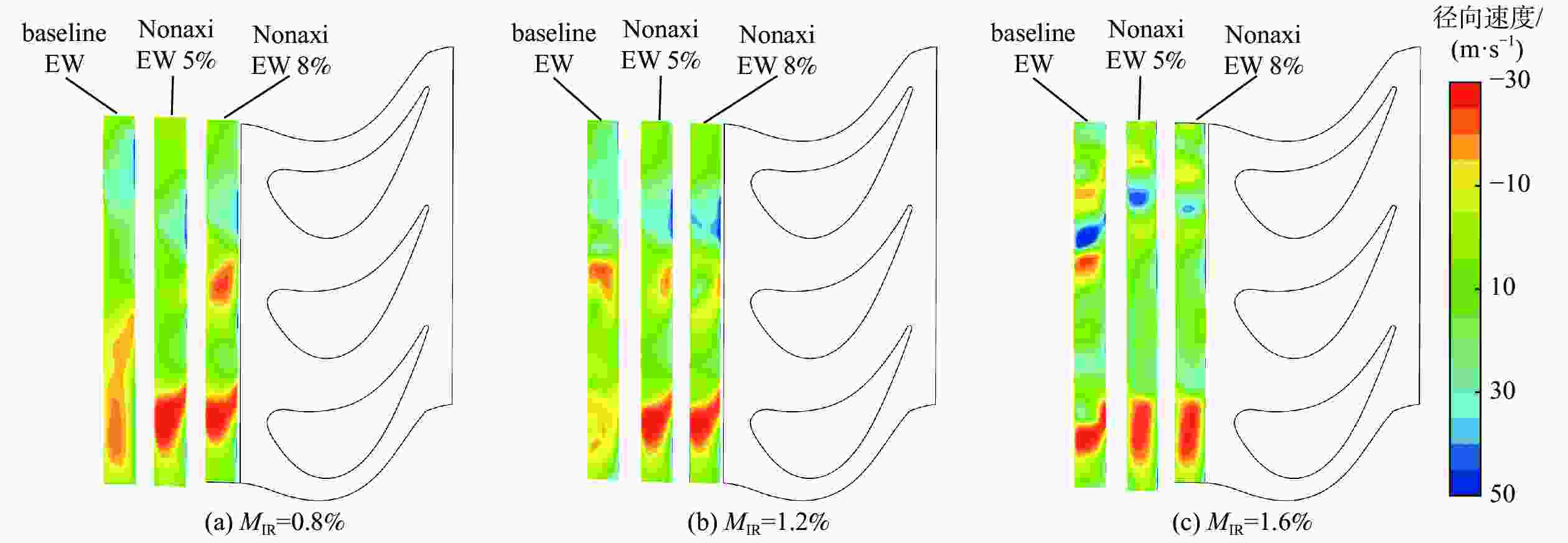 计算模型 效率/% 质量流量/(kg·s−1) original EW 90.0092 11.4605 baseline EW, MIR=0.8% 89.6876 11.3727 baseline EW, MIR=1.2% 89.6294 11.3345 baseline EW, MIR=1.6% 89.5801 11.2893 Nonaxi EW 5%, MIR=0.8% 89.6973 11.4271 Nonaxi EW 5%, MIR=1.2% 89.6551 11.3955 Nonaxi EW 5%, MIR=1.6% 89.7288 11.3593 Nonaxi EW 8%, MIR=0.8% 89.2407 11.4333 Nonaxi EW 8%, MIR=1.2% 89.2816 11.3973 Nonaxi EW 8%, MIR=1.6% 89.4151 11.3612 -