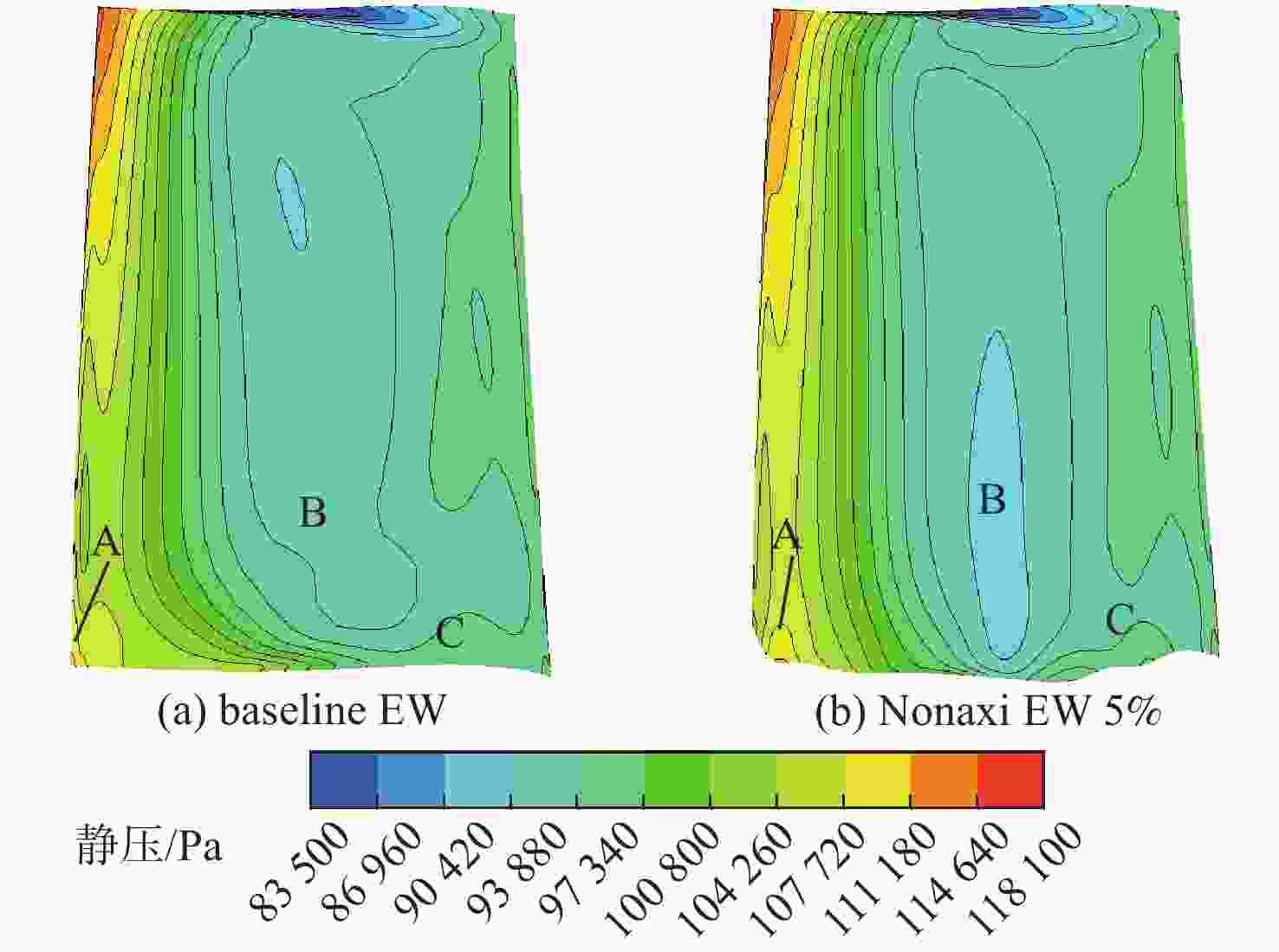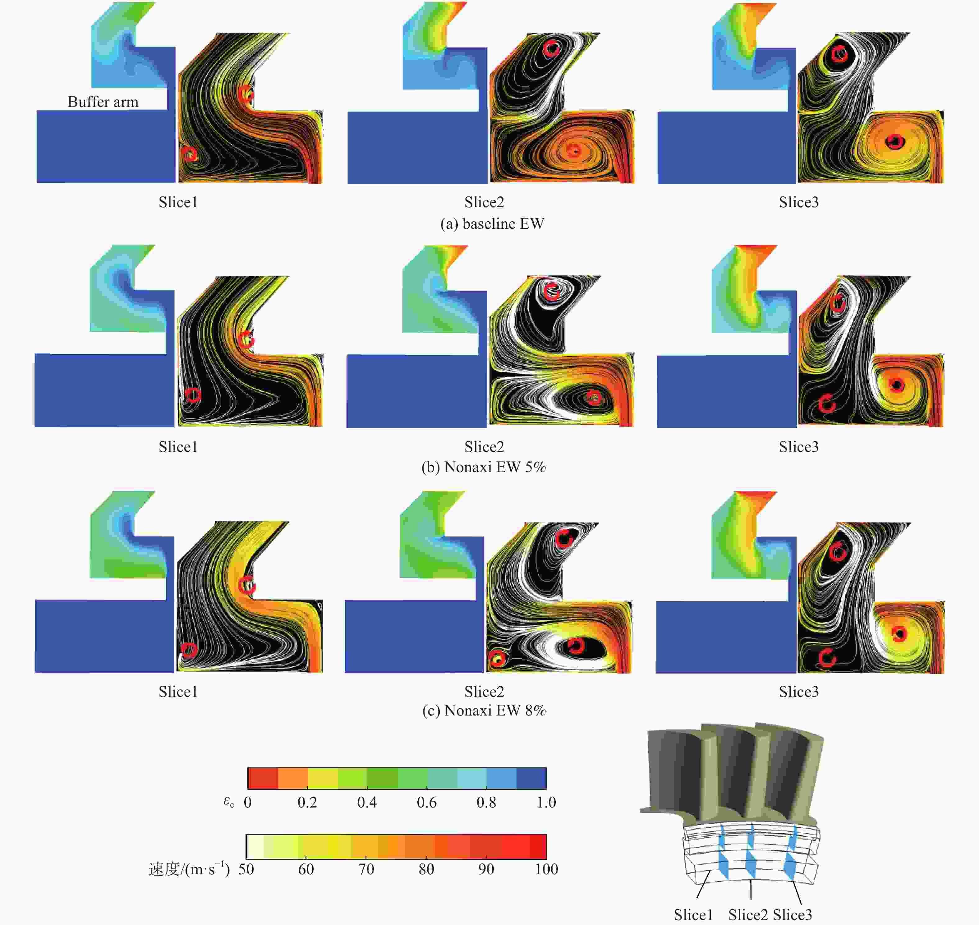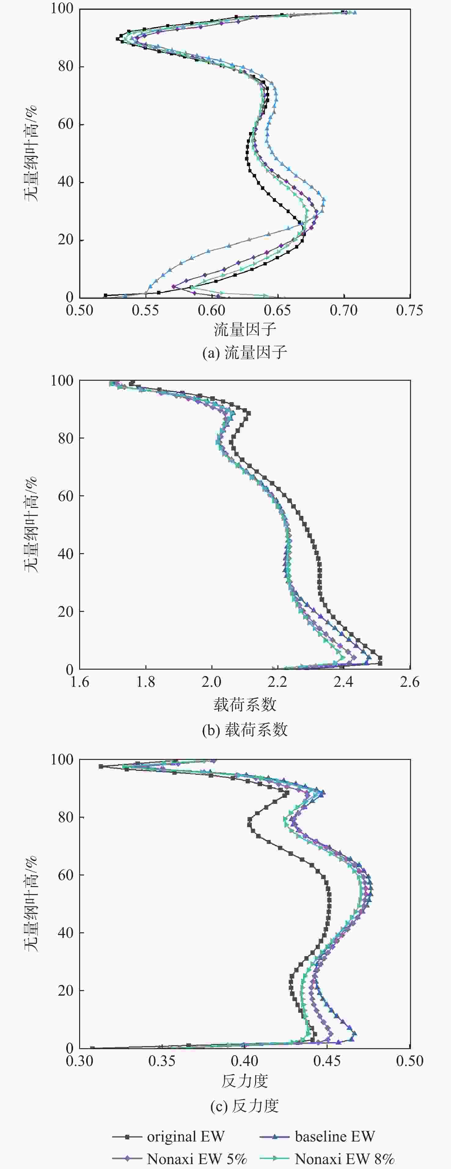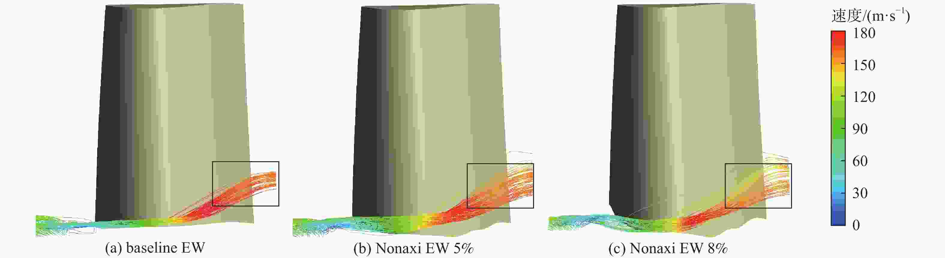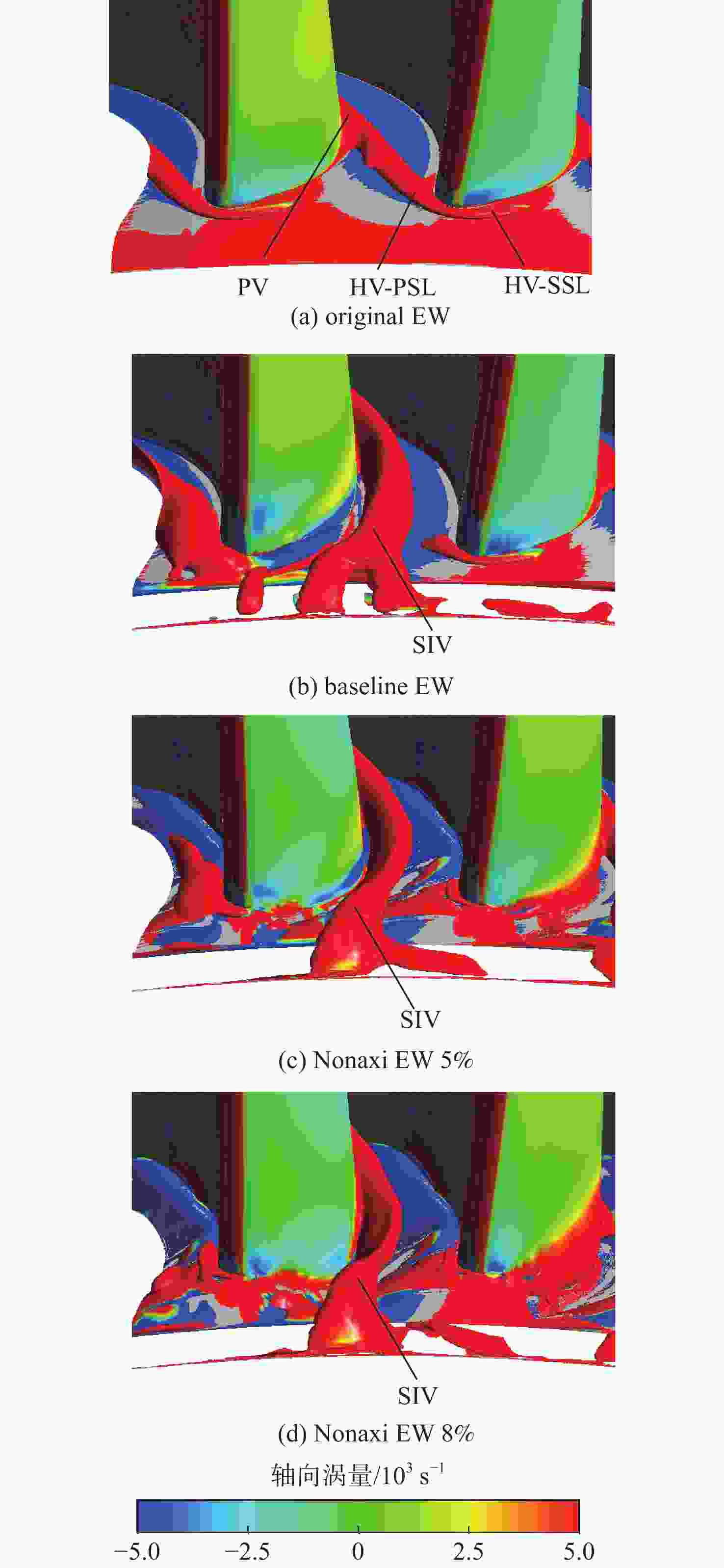 计算模型 效率/% 质量流量/(kg·s−1) original EW 90.0092 11.4605 baseline EW, MIR=0.8% 89.6876 11.3727 baseline EW, MIR=1.2% 89.6294 11.3345 baseline EW, MIR=1.6% 89.5801 11.2893 Nonaxi EW 5%, MIR=0.8% 89.6973 11.4271 Nonaxi EW 5%, MIR=1.2% 89.6551 11.3955 Nonaxi EW 5%, MIR=1.6% 89.7288 11.3593 Nonaxi EW 8%, MIR=0.8% 89.2407 11.4333 Nonaxi EW 8%, MIR=1.2% 89.2816 11.3973 Nonaxi EW 8%, MIR=1.6% 89.4151 11.3612 -