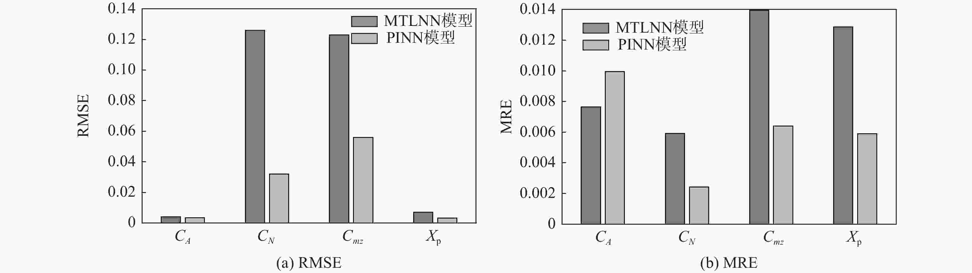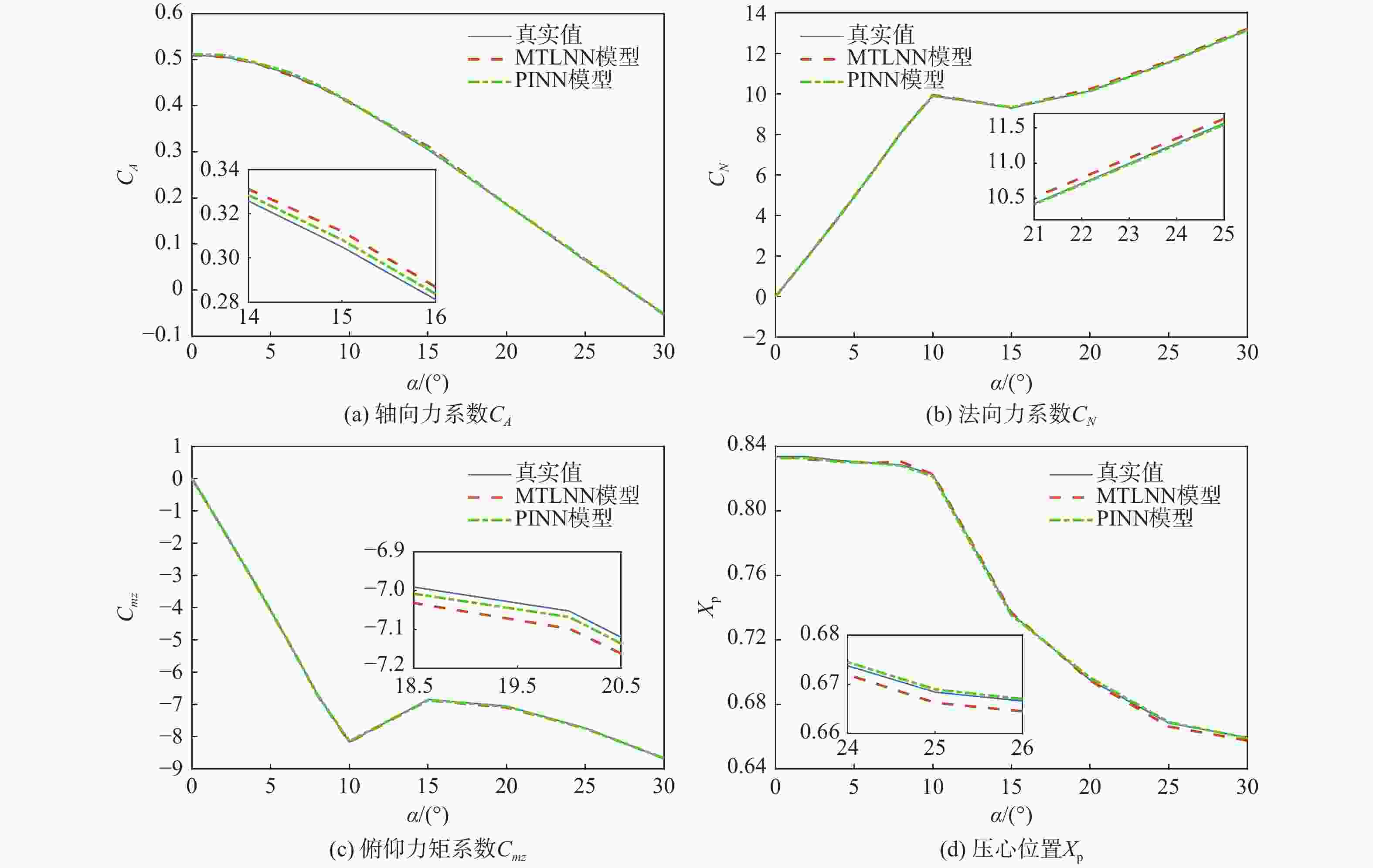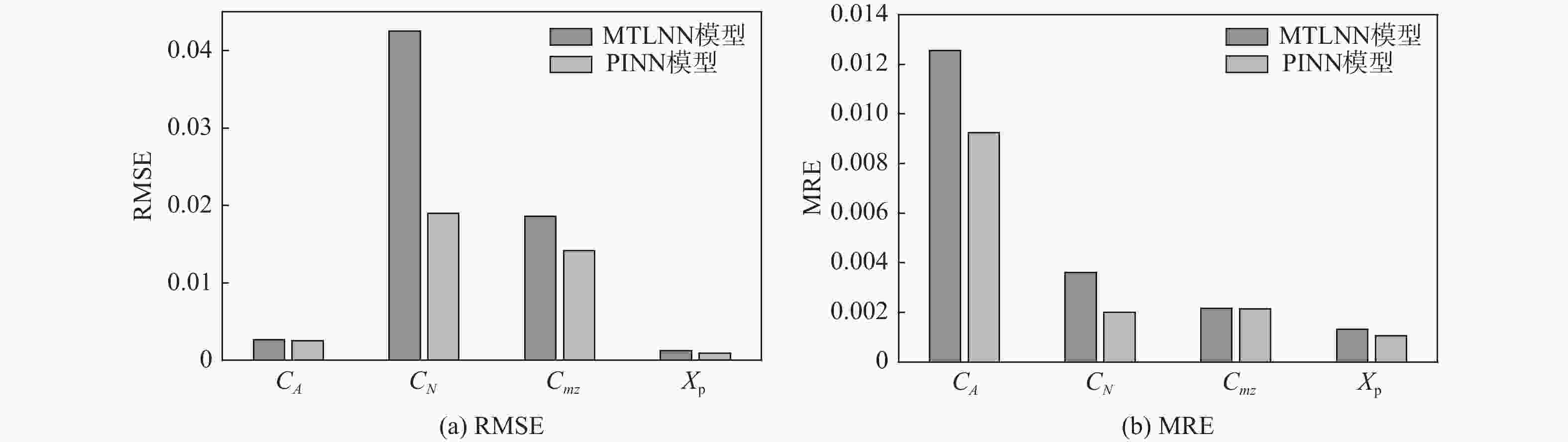测试集 气动特性参数 预测误差RMSE 误差减少/% 测试集 气动特性参数 预测误差RMSE 误差减少/% MTLNN模型 PINN模型 MTLNN模型 PINN模型 第1组 CA 0.003665 0.003758 第3组 CA 0.003337 0.003812 CN 0.102228 0.093603 8.44 CN 0.060644 0.027035 55.42 Cmz 0.119224 0.076152 36.13 Cmz 0.047269 0.043482 8.01 Xp 0.004239 0.002134 49.67 Xp 0.002280 0.003299 第2组 CA 0.004096 0.002591 36.73 第4组 CA 0.002605 0.002937 CN 0.045346 0.026937 40.60 CN 0.046499 0.038052 18.17 Cmz 0.047311 0.030314 35.93 Cmz 0.053012 0.043537 17.87 Xp 0.001888 0.001613 14.56 Xp 0.001615 0.001481 8.28 -
