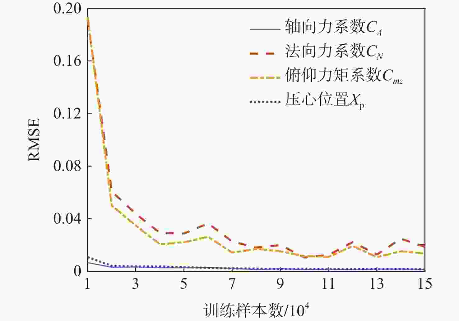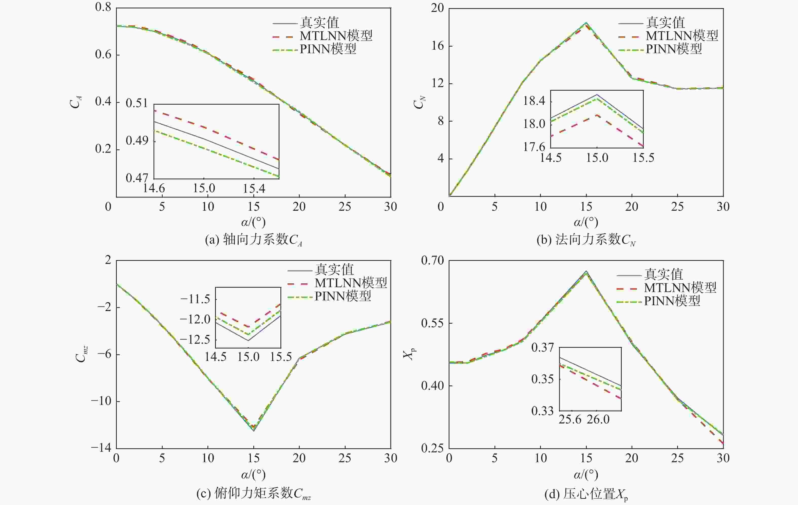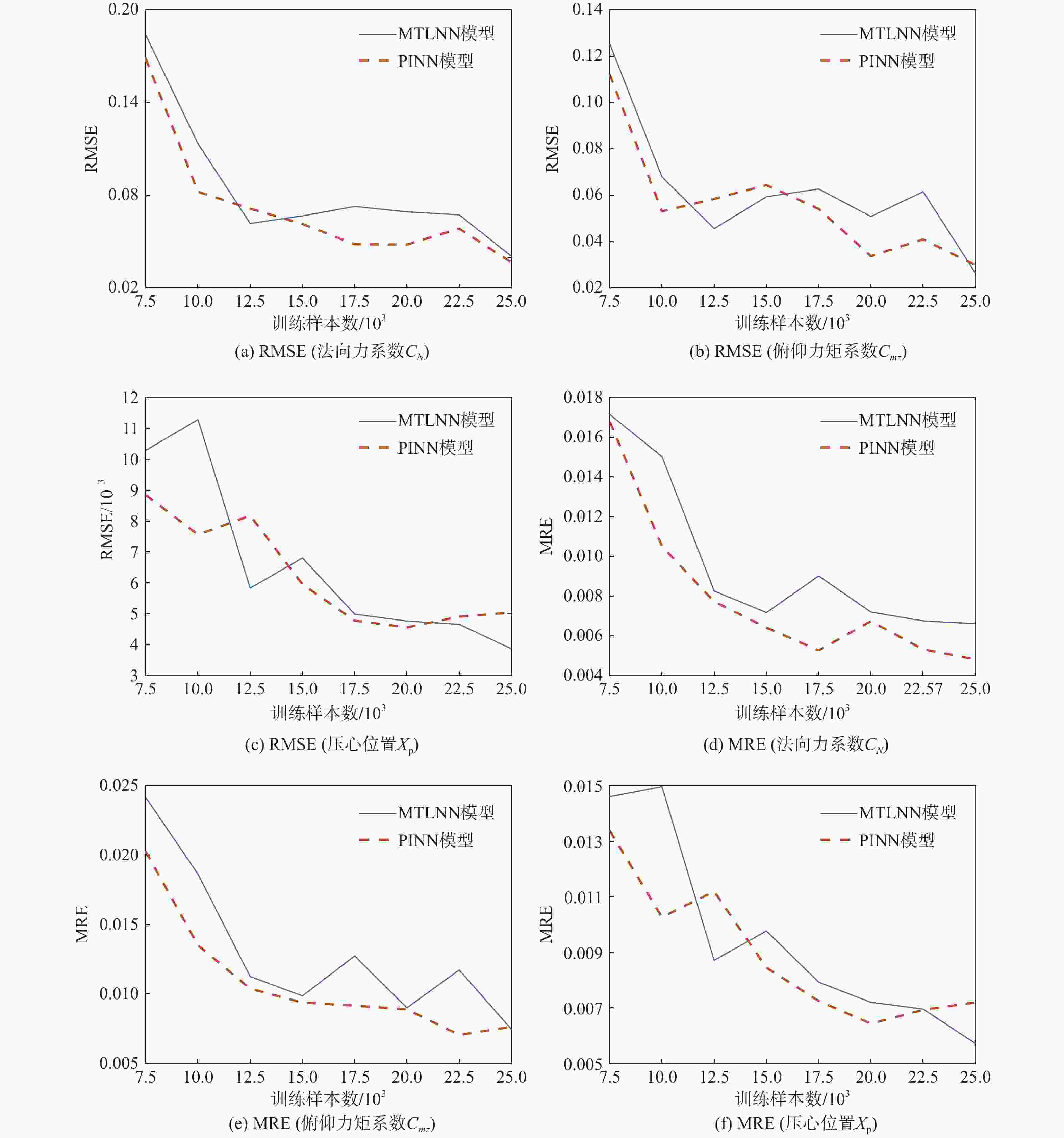 测试集 气动特性参数 预测误差RMSE 误差减少/% 测试集 气动特性参数 预测误差RMSE 误差减少/% MTLNN模型 PINN模型 MTLNN模型 PINN模型 第1组 CA 0.003665 0.003758 第3组 CA 0.003337 0.003812 CN 0.102228 0.093603 8.44 CN 0.060644 0.027035 55.42 Cmz 0.119224 0.076152 36.13 Cmz 0.047269 0.043482 8.01 Xp 0.004239 0.002134 49.67 Xp 0.002280 0.003299 第2组 CA 0.004096 0.002591 36.73 第4组 CA 0.002605 0.002937 CN 0.045346 0.026937 40.60 CN 0.046499 0.038052 18.17 Cmz 0.047311 0.030314 35.93 Cmz 0.053012 0.043537 17.87 Xp 0.001888 0.001613 14.56 Xp 0.001615 0.001481 8.28 -