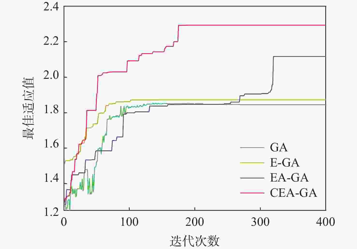 算法 最优航程/km 最差航程/km 平均值/km 标准差 GA 148.370 160.475 155.213 4.692 E-GA 146.193 158.868 151.591 5.432 EA-GA 140.822 146.967 143.584 3.585 CEA-GA 136.050 142.756 139.796 2.265 注:加黑数据表示各组实验统计中的最优结果。 表 3 适应值信息统计结果
