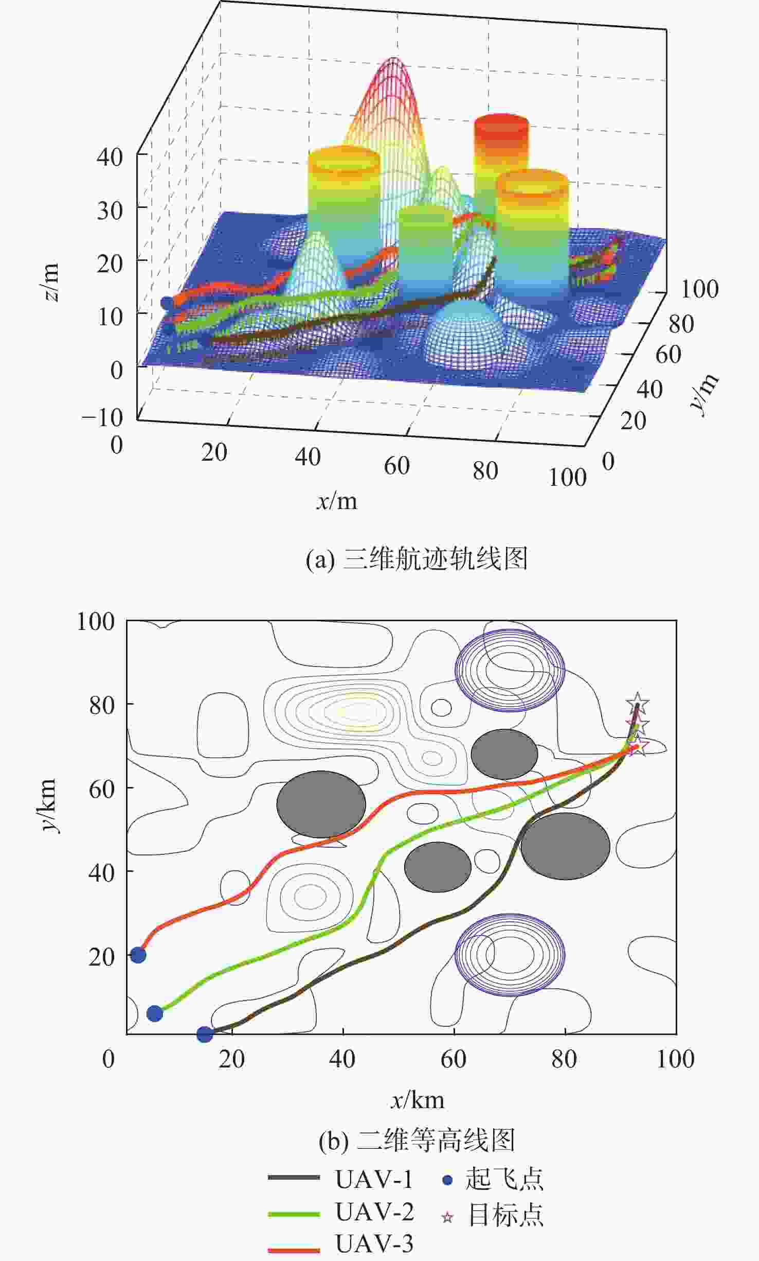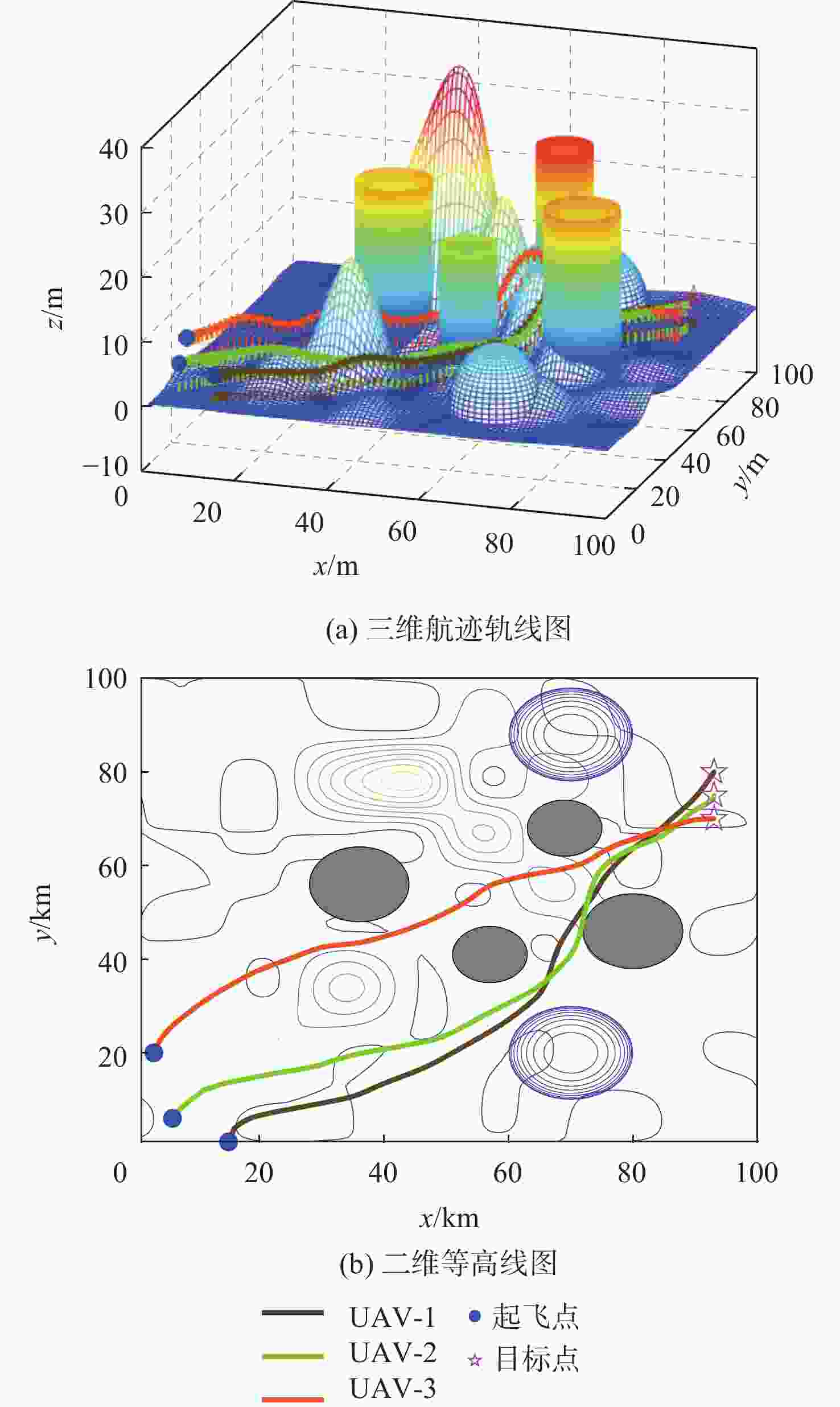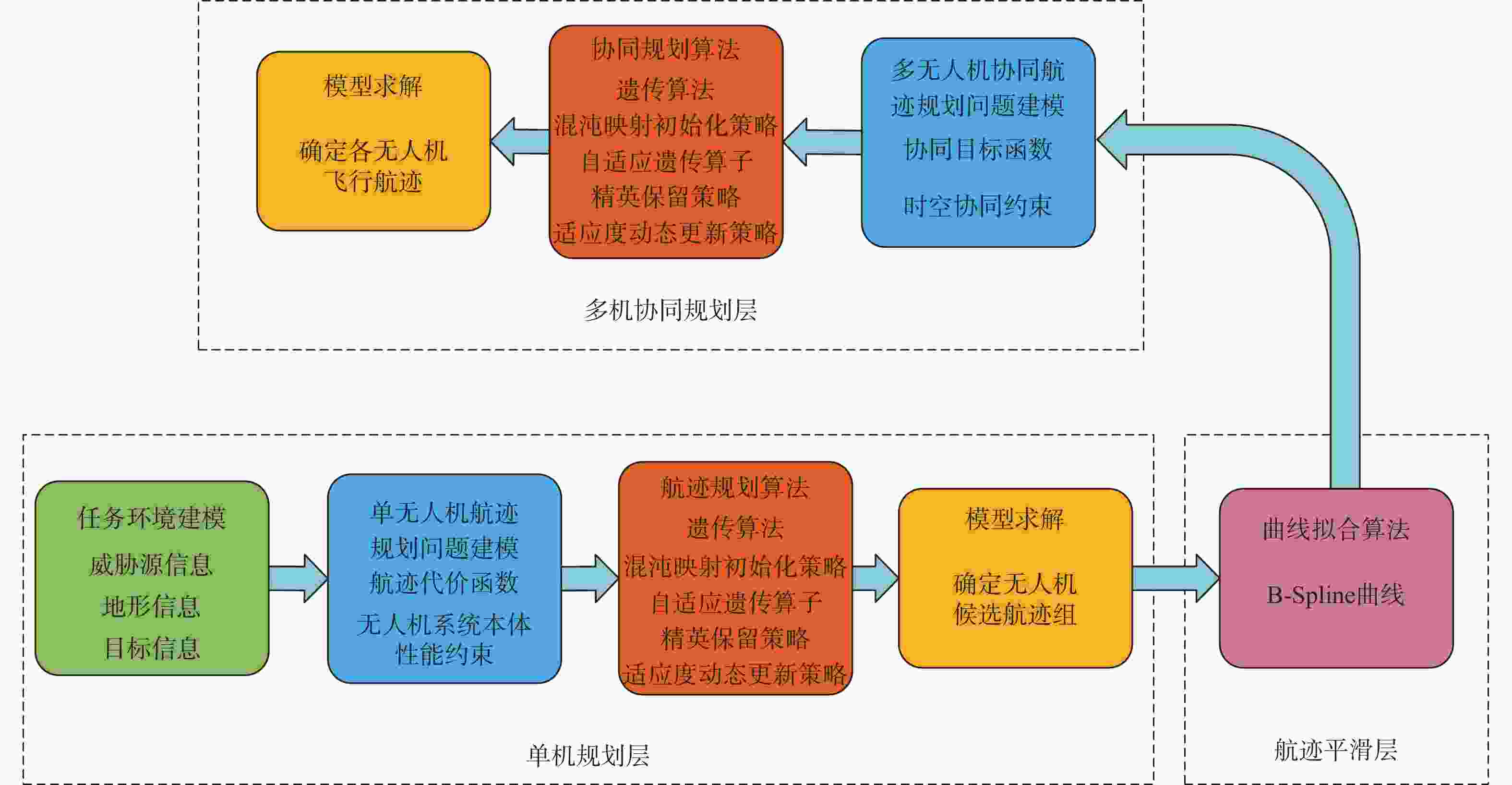 无人机 最优航程/km 最差航程/km 平均值/km 标准差 UAV-1 121.118 136.653 127.349 3.158 UAV-2 125.963 136.712 129.769 2.990 UAV-3 115.667 126.581 122.004 3.279 表 5 多机协同规划层信息