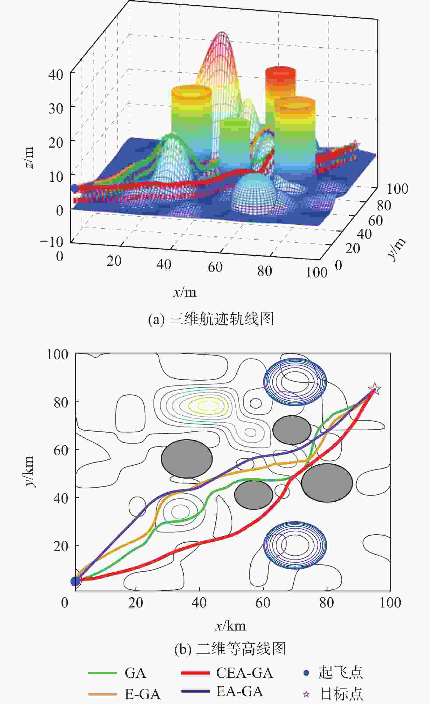 威胁类型 位置坐标/km 高度/m 威胁半径/km 地空导弹 (80,46) 26 8 探测雷达 (70,20) 0 10 地空导弹 (69,68) 30 6 防空高炮 (36,56) 25 8 禁飞区域 (57,41) 20 6 探测雷达 (70,88) 0 10 表 2 航程信息统计结果