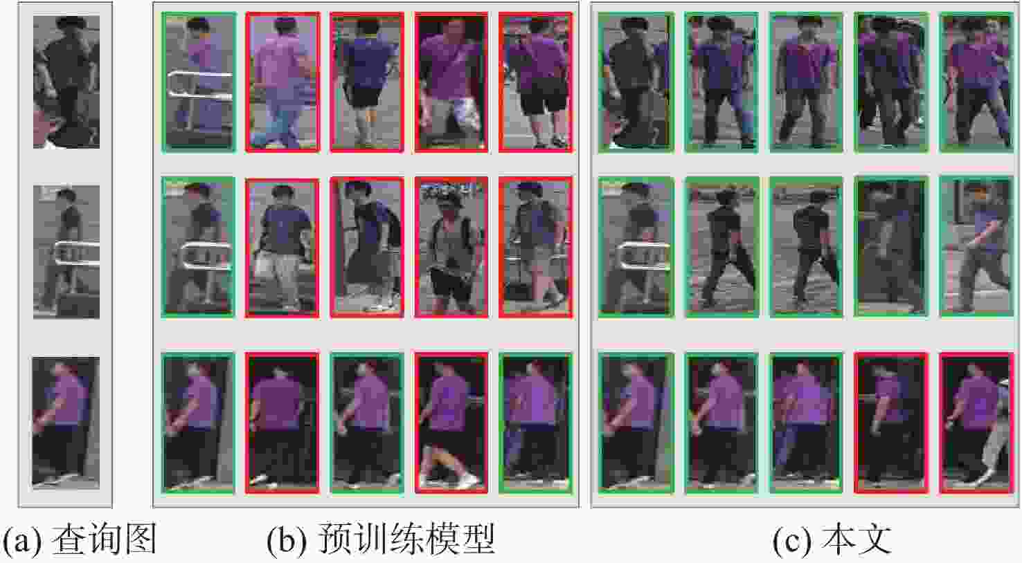 % 方法 Rank-1 mAP 数据集1 数据集2 数据集3 数据集4 数据集1 数据集2 数据集3 数据集4 QAConv[20] 54.4 62.8 72.2 73.9 33.6 31.6 53.4 46.6 PABO-QAConv 60.4 74.9 74.5 82.7 38.6 44.1 59.6 58.7 注:数据集1为训练集Market1501、测试集DukeMTMC-reID,数据集2为训练集DukeMTMC-reID、测试集Market1501,数据集3为训练集MSMT17、测试集DukeMTMC-reID,数据集4为训练集MSMT17、测试集Market1501。 表 5 本文方法与跨域行人重识别方法结果对比
