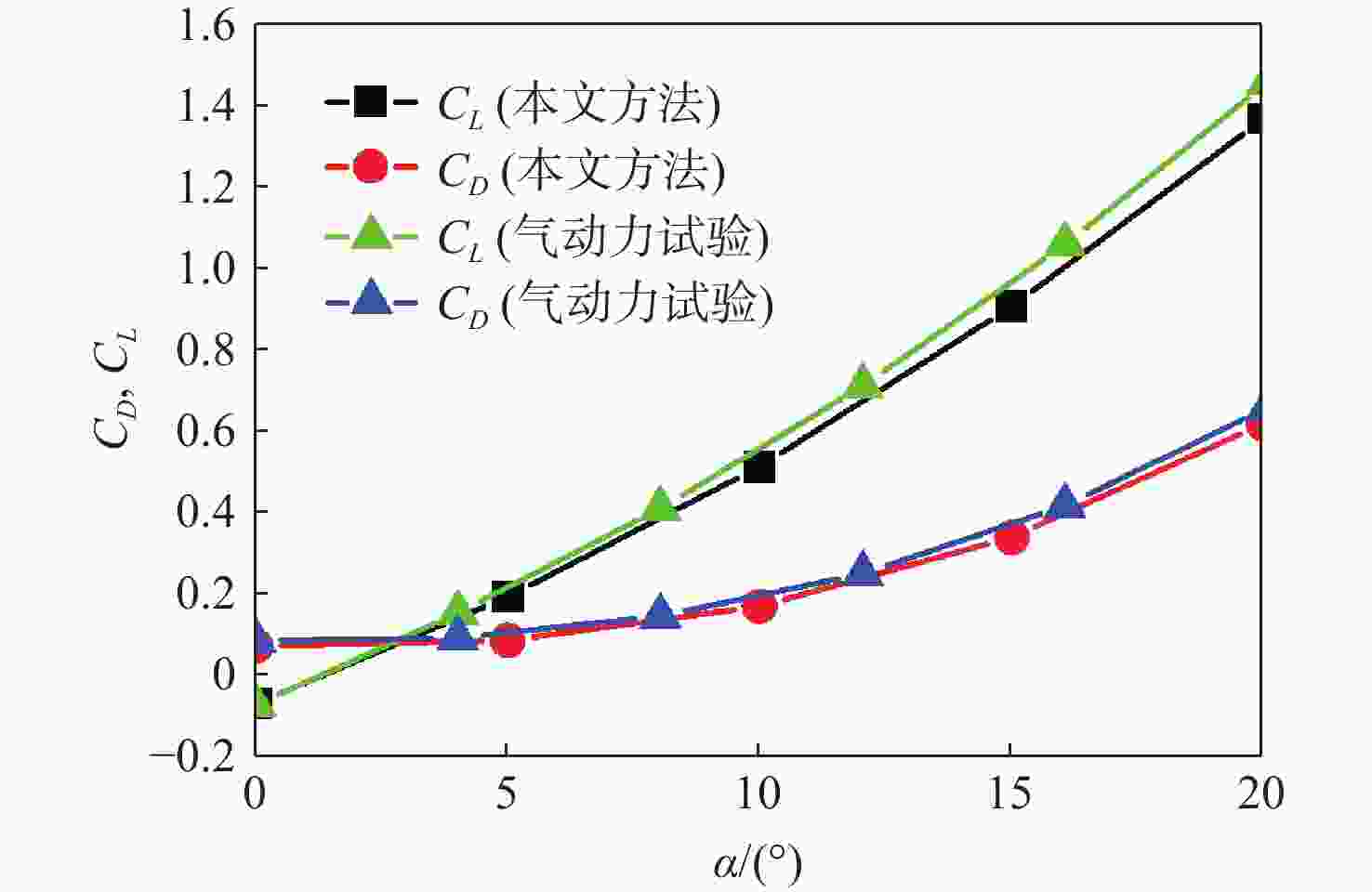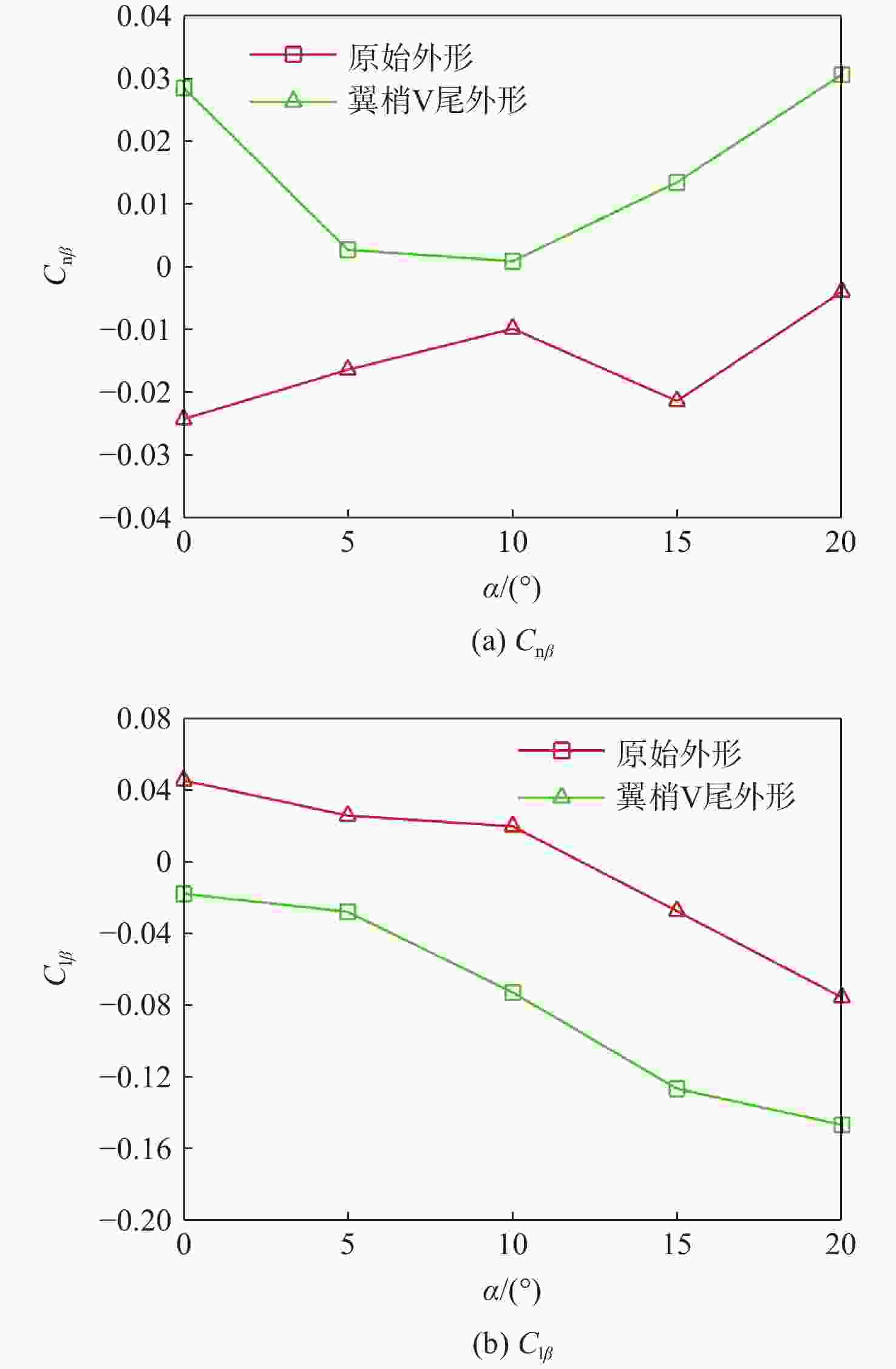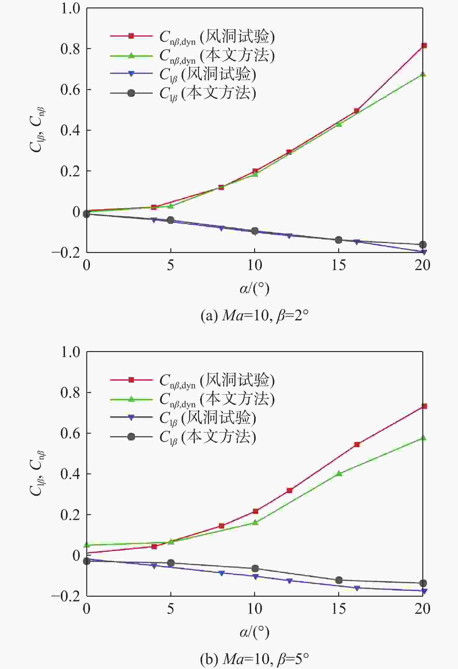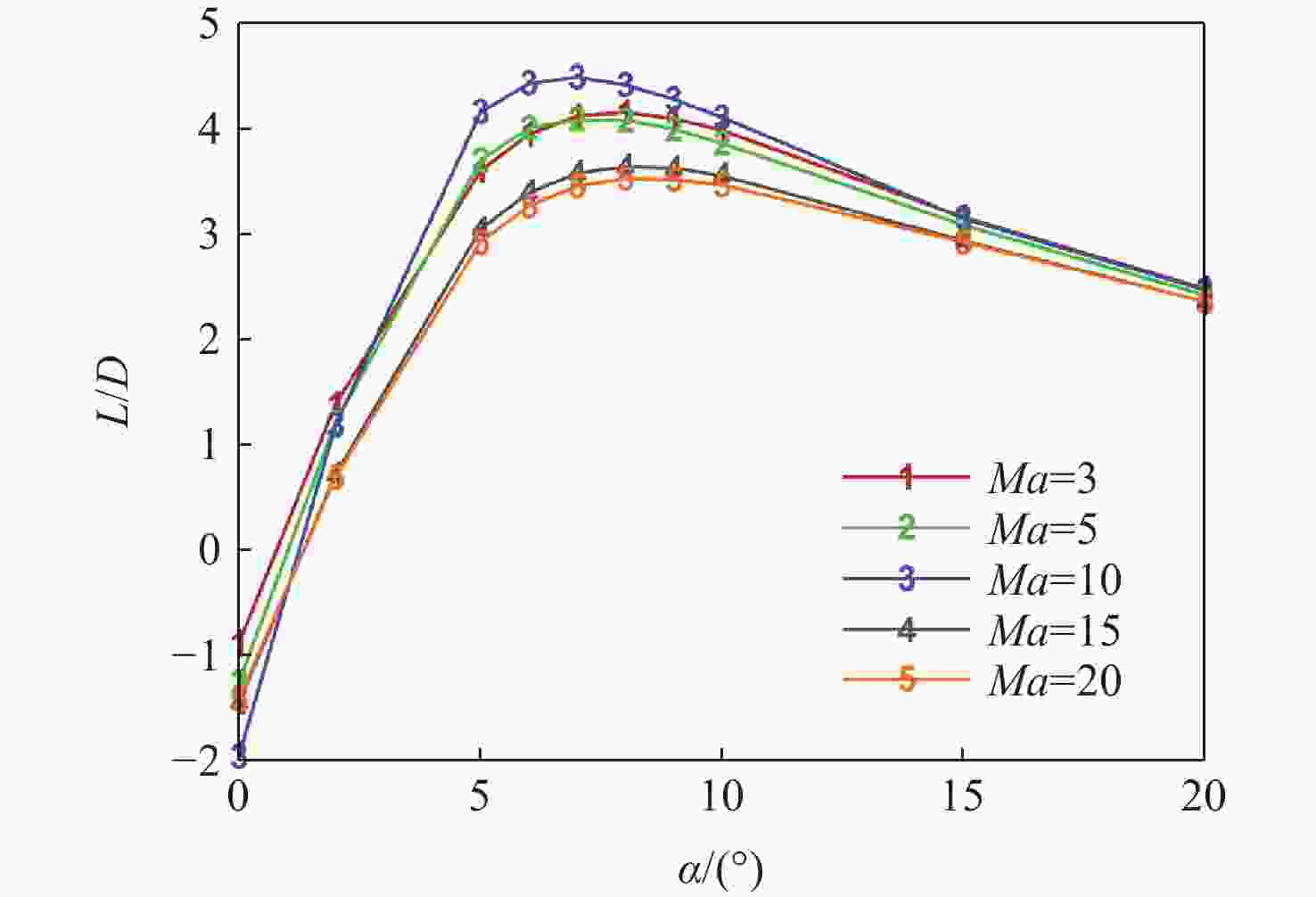 Ma =10的条件下升阻比可以达到4.48左右,在一定迎角范围内均具备很高的气动效率,验证了所提布局的有效性。同时重点针对所提布局共性的横航向稳定性问题基于数值模拟方法探讨了3种不同优化改进方案的效果及可行性,并采用风洞试验对两侧翼梢V尾的控制方案进行横航向稳定性控制效果的试验验证,结果表明:采用两侧翼梢V尾的控制方案是实现横航向稳定性控制的较优方案。Abstract:A new aerodynamic configuration concept for a hypersonic vehicle with a high lift-to-drag ratio is proposed to satisfy the constantly increasing practicability multi-constraints of high volumetric efficiency, control and stability, and acceptable thermal protection. The design principles of this practical configuration is inspired by the wave-rider design idea and momentum principle which incorporates inverted dihedral with an aft-sweeping wing, caret upper surface, and con-cavity lower surface are elaborated. A trailing edge flap and a body-fitted expansion rudder were used in place of the standard control surface's leading edge to prevent excessive heat flow during the prolonged hypersonic flight. The aerodynamic characteristics of this new configuration were obtained and discussed by applying numerical simulation with Navier-Stokes equations and wind tunnel test. The results show that the delta wing with a caret upper surface and concavity bottom surface can generate highly compressed air beneath the vehicle and reduce the loss of lifting pressure. The maximum lift-to-drag ratio achieves nearly 4.48 at