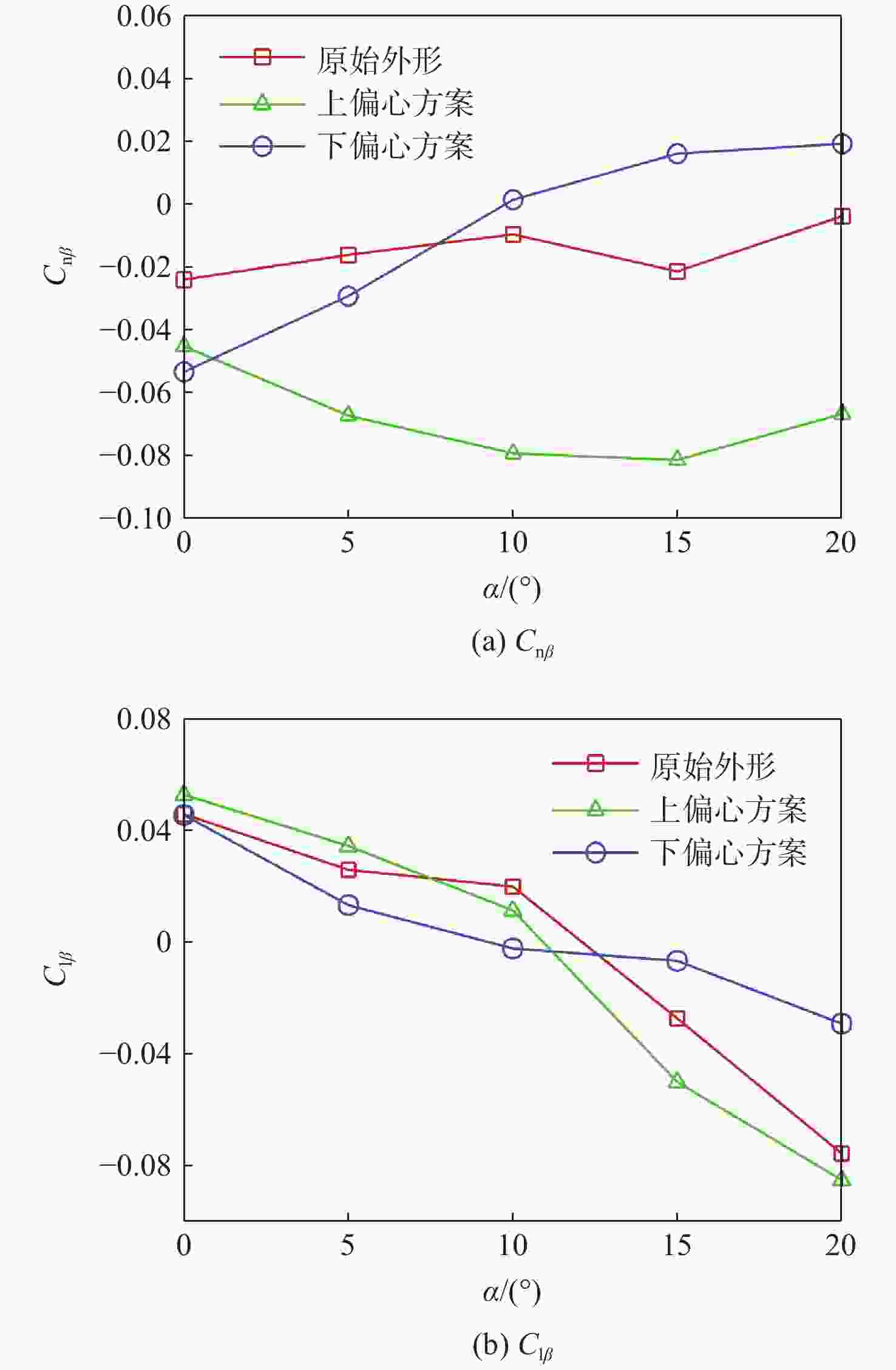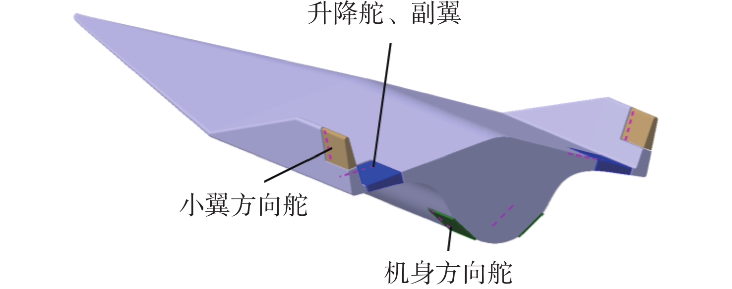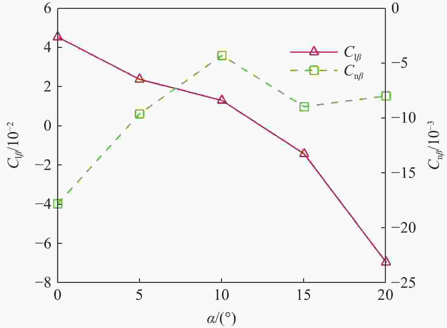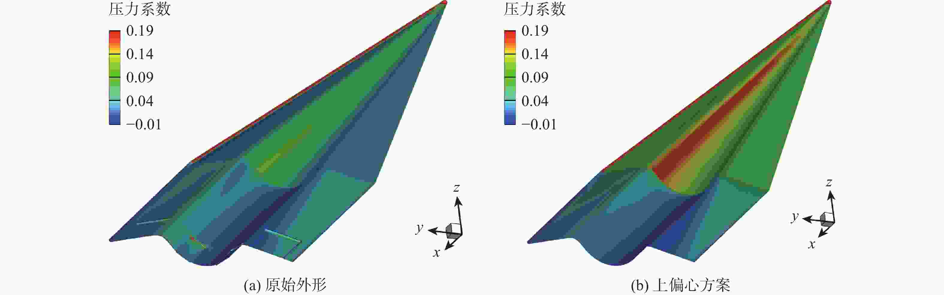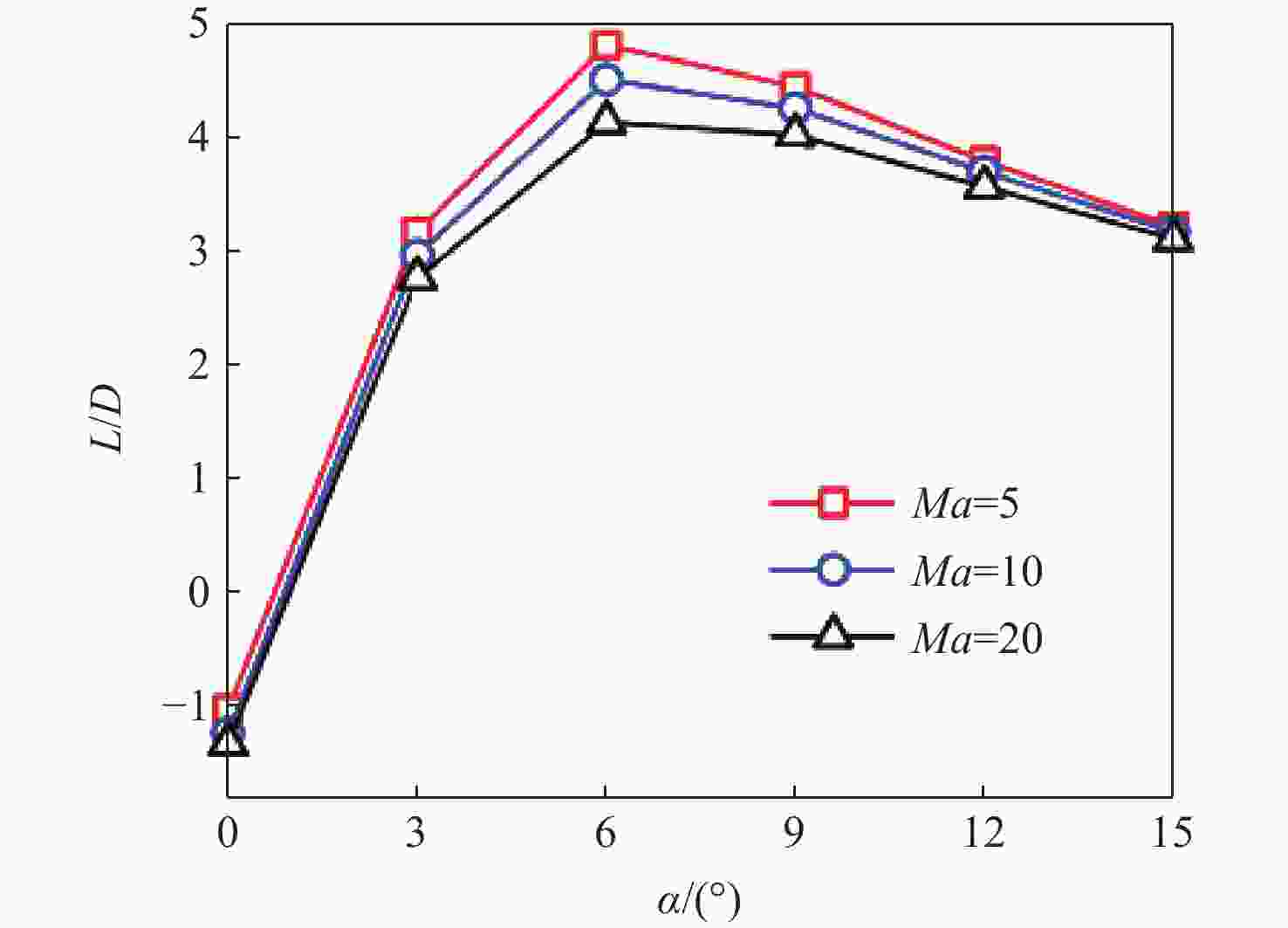 Ma =10的条件下升阻比可以达到4.48左右,在一定迎角范围内均具备很高的气动效率,验证了所提布局的有效性。同时重点针对所提布局共性的横航向稳定性问题基于数值模拟方法探讨了3种不同优化改进方案的效果及可行性,并采用风洞试验对两侧翼梢V尾的控制方案进行横航向稳定性控制效果的试验验证,结果表明:采用两侧翼梢V尾的控制方案是实现横航向稳定性控制的较优方案。Abstract:A new aerodynamic configuration concept for a hypersonic vehicle with a high lift-to-drag ratio is proposed to satisfy the constantly increasing practicability multi-constraints of high volumetric efficiency, control and stability, and acceptable thermal protection. The design principles of this practical configuration is inspired by the wave-rider design idea and momentum principle which incorporates inverted dihedral with an aft-sweeping wing, caret upper surface, and con-cavity lower surface are elaborated. A trailing edge flap and a body-fitted expansion rudder were used in place of the standard control surface's leading edge to prevent excessive heat flow during the prolonged hypersonic flight. The aerodynamic characteristics of this new configuration were obtained and discussed by applying numerical simulation with Navier-Stokes equations and wind tunnel test. The results show that the delta wing with a caret upper surface and concavity bottom surface can generate highly compressed air beneath the vehicle and reduce the loss of lifting pressure. The maximum lift-to-drag ratio achieves nearly 4.48 at