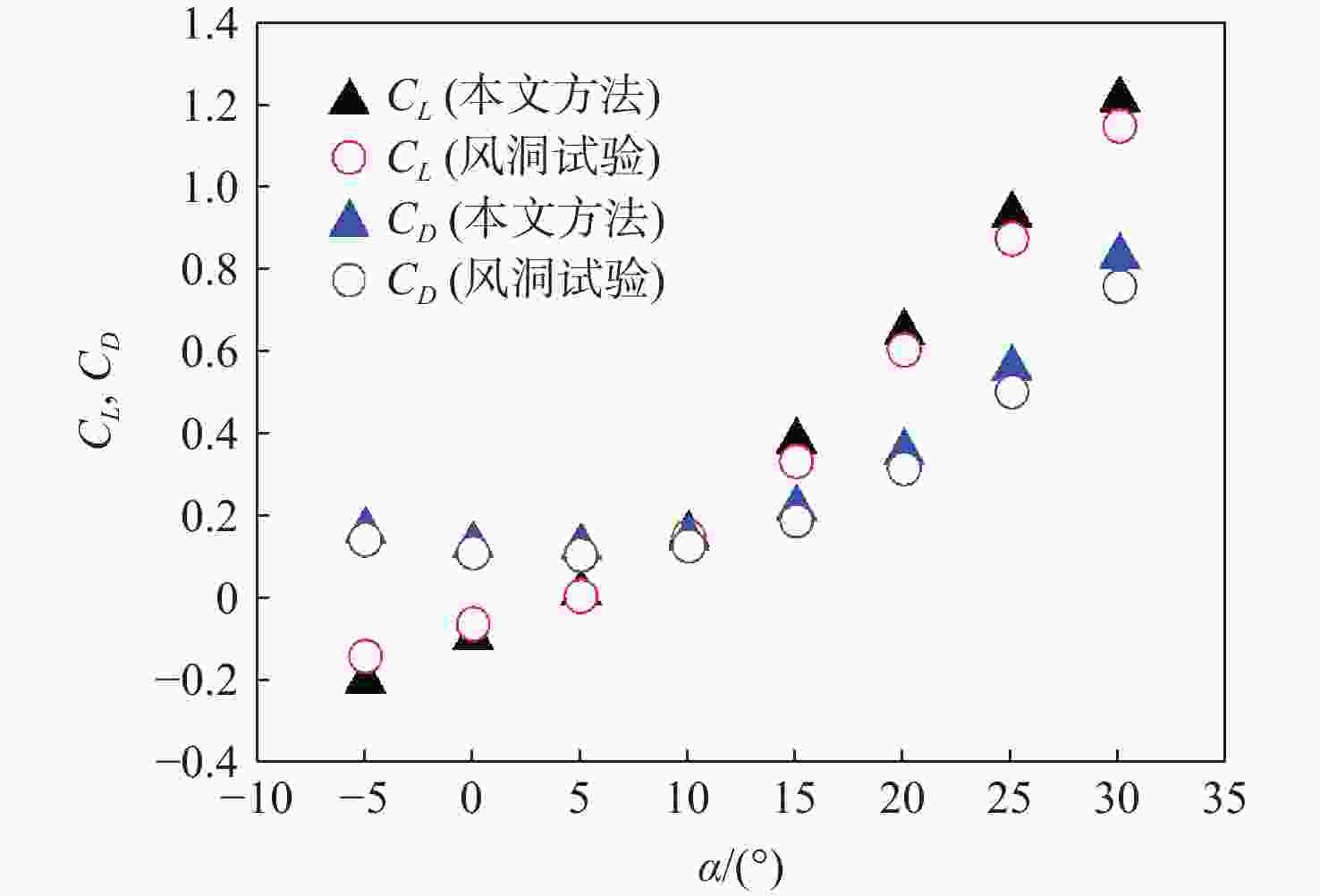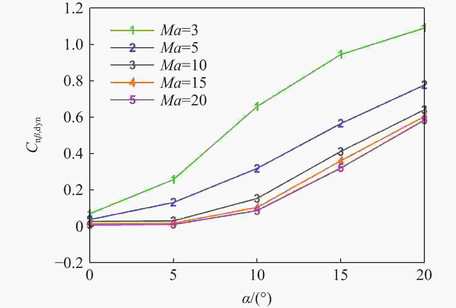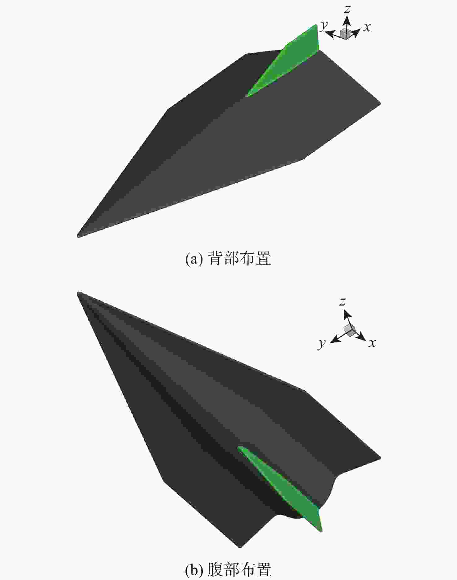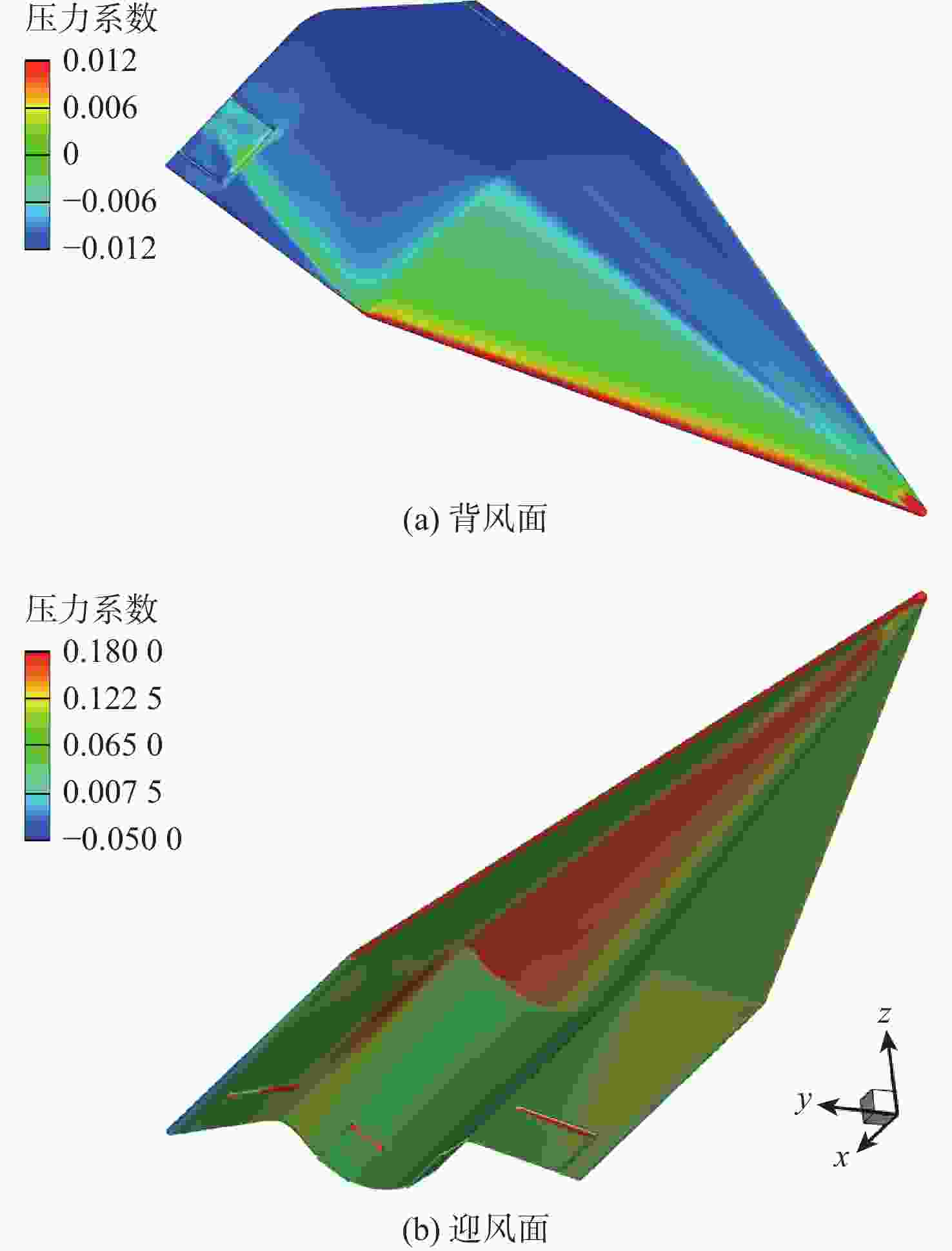 Ma =10的条件下升阻比可以达到4.48左右,在一定迎角范围内均具备很高的气动效率,验证了所提布局的有效性。同时重点针对所提布局共性的横航向稳定性问题基于数值模拟方法探讨了3种不同优化改进方案的效果及可行性,并采用风洞试验对两侧翼梢V尾的控制方案进行横航向稳定性控制效果的试验验证,结果表明:采用两侧翼梢V尾的控制方案是实现横航向稳定性控制的较优方案。Abstract:A new aerodynamic configuration concept for a hypersonic vehicle with a high lift-to-drag ratio is proposed to satisfy the constantly increasing practicability multi-constraints of high volumetric efficiency, control and stability, and acceptable thermal protection. The design principles of this practical configuration is inspired by the wave-rider design idea and momentum principle which incorporates inverted dihedral with an aft-sweeping wing, caret upper surface, and con-cavity lower surface are elaborated. A trailing edge flap and a body-fitted expansion rudder were used in place of the standard control surface's leading edge to prevent excessive heat flow during the prolonged hypersonic flight. The aerodynamic characteristics of this new configuration were obtained and discussed by applying numerical simulation with Navier-Stokes equations and wind tunnel test. The results show that the delta wing with a caret upper surface and concavity bottom surface can generate highly compressed air beneath the vehicle and reduce the loss of lifting pressure. The maximum lift-to-drag ratio achieves nearly 4.48 at