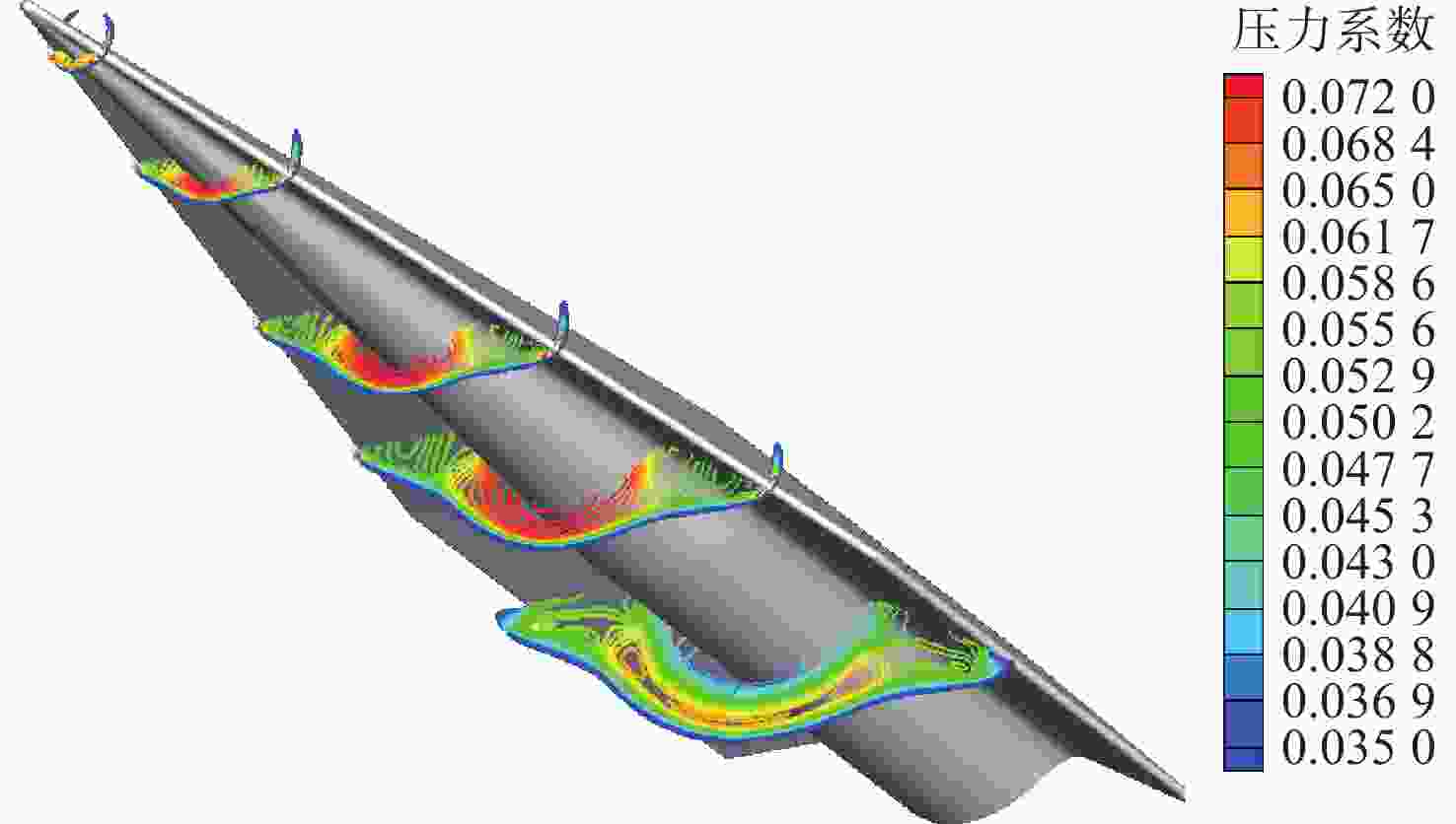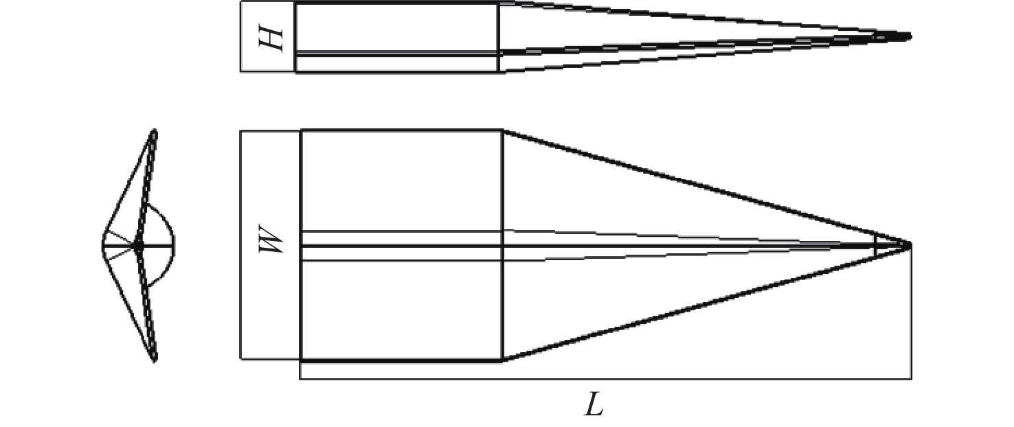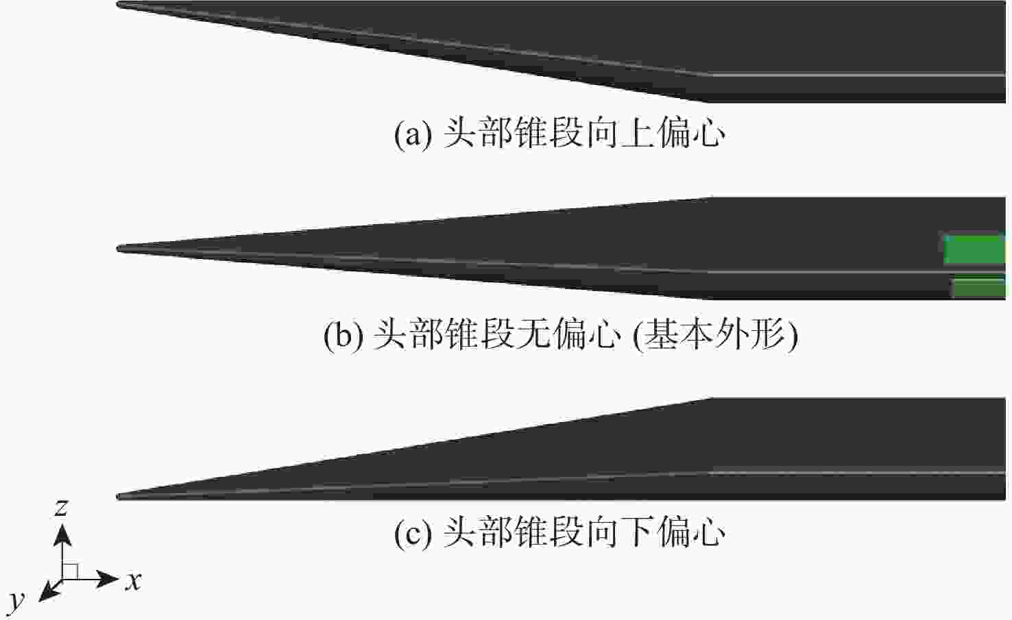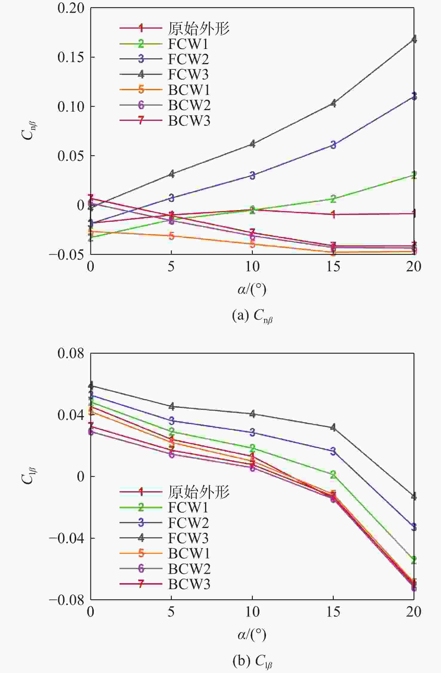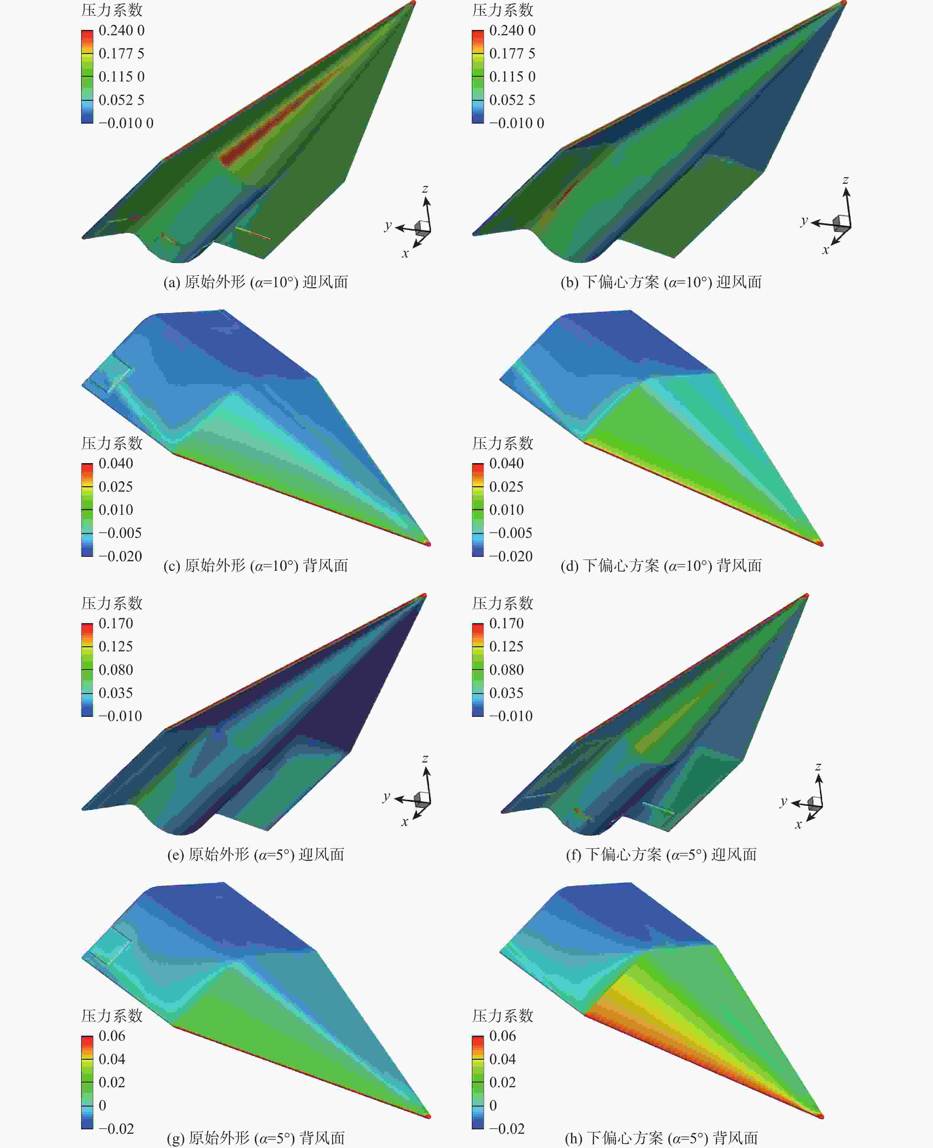 Ma =10的条件下升阻比可以达到4.48左右,在一定迎角范围内均具备很高的气动效率,验证了所提布局的有效性。同时重点针对所提布局共性的横航向稳定性问题基于数值模拟方法探讨了3种不同优化改进方案的效果及可行性,并采用风洞试验对两侧翼梢V尾的控制方案进行横航向稳定性控制效果的试验验证,结果表明:采用两侧翼梢V尾的控制方案是实现横航向稳定性控制的较优方案。Abstract:A new aerodynamic configuration concept for a hypersonic vehicle with a high lift-to-drag ratio is proposed to satisfy the constantly increasing practicability multi-constraints of high volumetric efficiency, control and stability, and acceptable thermal protection. The design principles of this practical configuration is inspired by the wave-rider design idea and momentum principle which incorporates inverted dihedral with an aft-sweeping wing, caret upper surface, and con-cavity lower surface are elaborated. A trailing edge flap and a body-fitted expansion rudder were used in place of the standard control surface's leading edge to prevent excessive heat flow during the prolonged hypersonic flight. The aerodynamic characteristics of this new configuration were obtained and discussed by applying numerical simulation with Navier-Stokes equations and wind tunnel test. The results show that the delta wing with a caret upper surface and concavity bottom surface can generate highly compressed air beneath the vehicle and reduce the loss of lifting pressure. The maximum lift-to-drag ratio achieves nearly 4.48 at