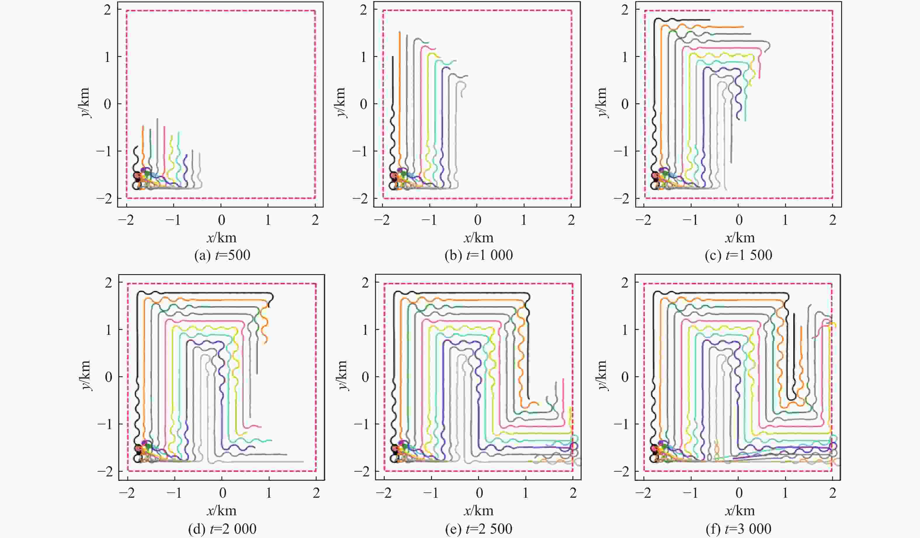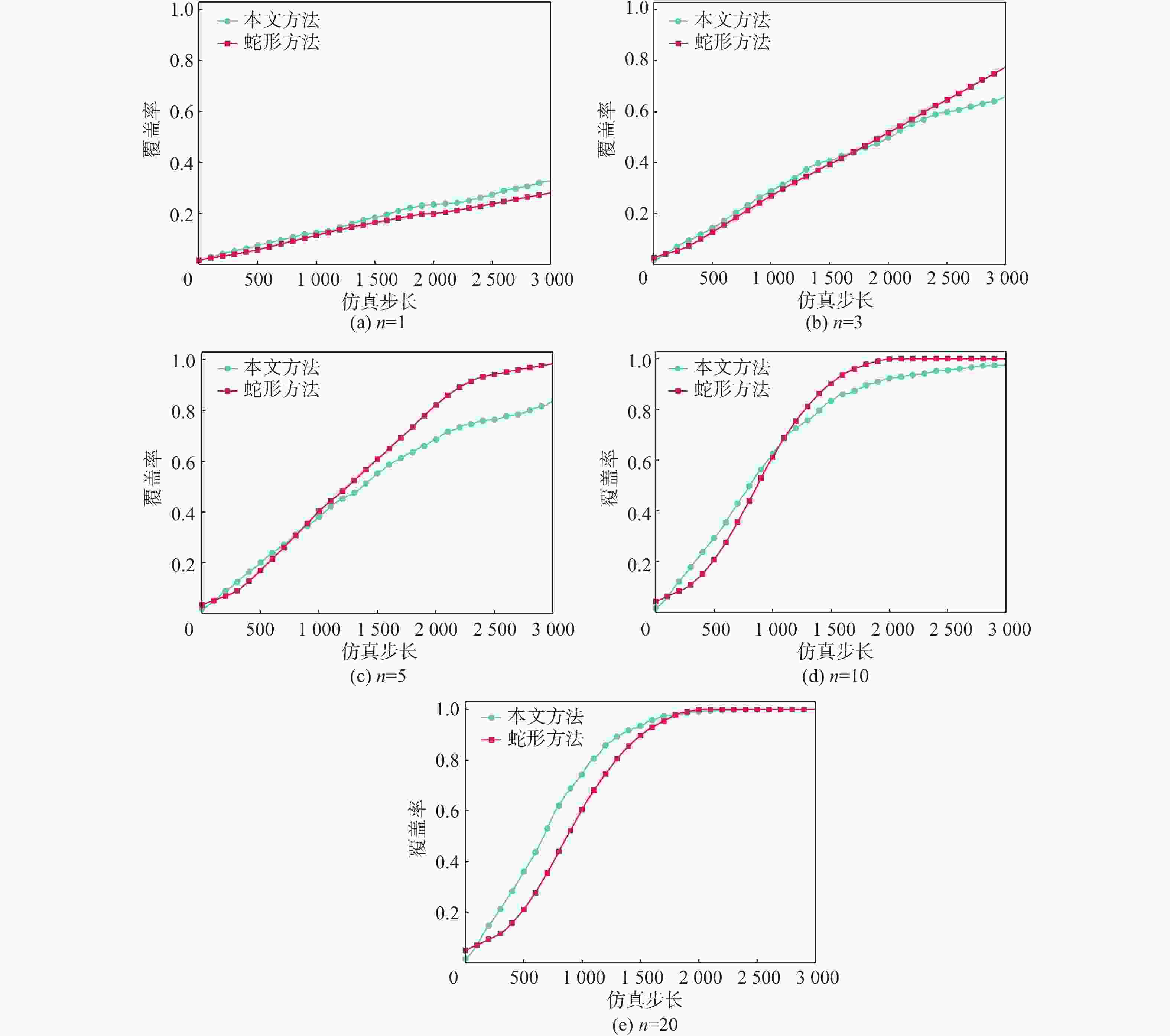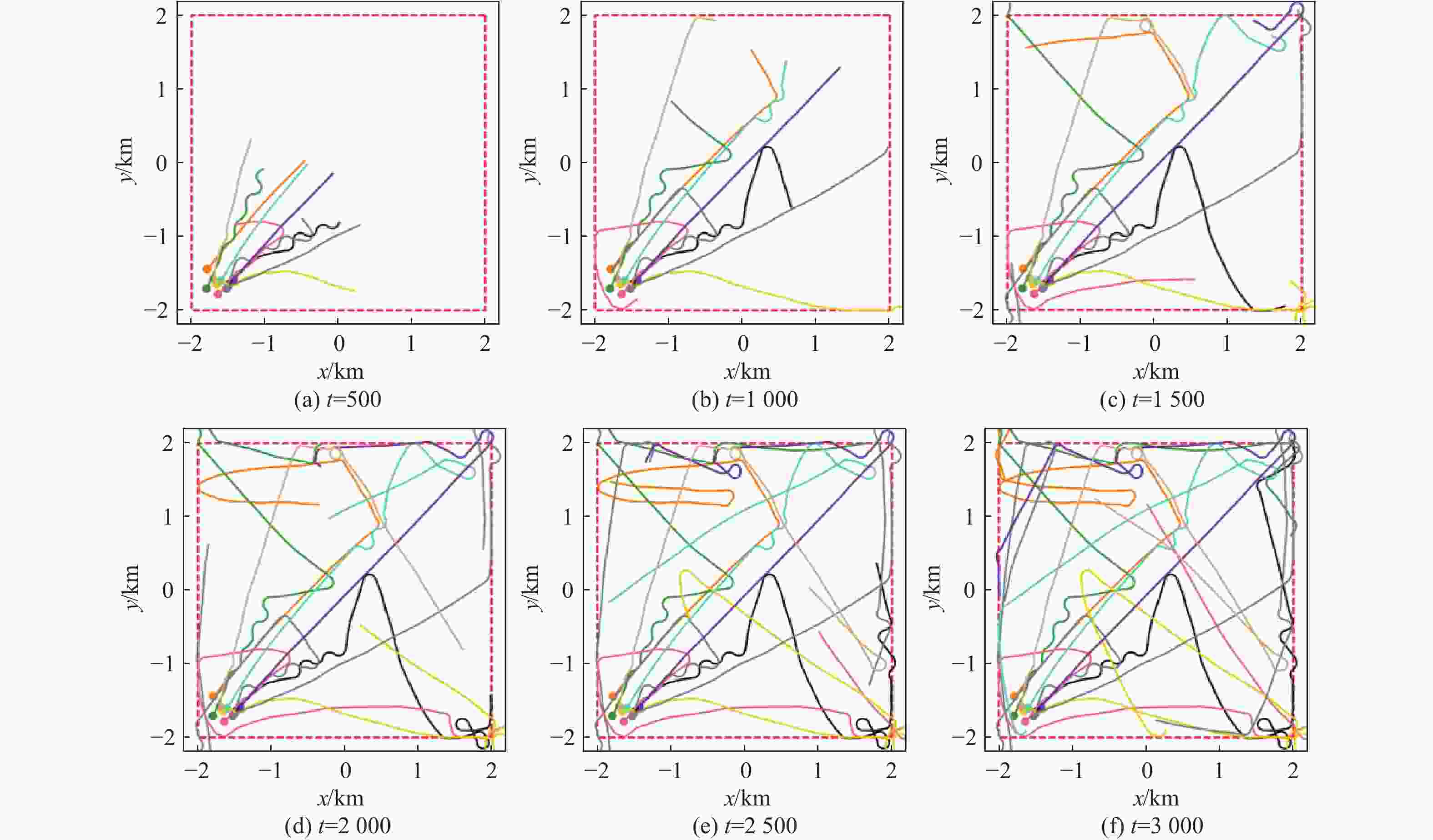参数 数值 无人机数量$ n $ 1,3,5,10,20 感知视场角$ \psi $/(°) 120 感知视场半径$ {r}_{1},{r}_{2} $/km 0.1,0.5 区域范围$ {E}_{x}\times {E}_{y} $/(km×km) 4×4 无人机初始位置${\boldsymbol{p}}$/km $ x,y\in \left[-1.8,-1.4\right] $ 无人机初始速度${\boldsymbol{v}}$/(k·m−1) $ {v}_{x},{v}_{y}\in \left[\mathrm{0,0.01}\right] $ 仿真步长$ {t}_{\max} $ 3000 -