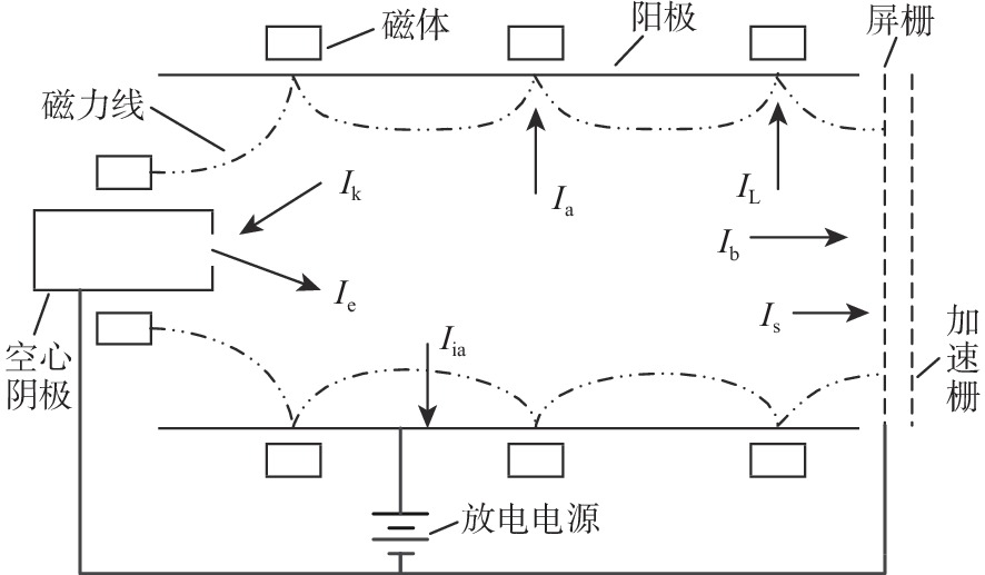 工作参数 电压/V 电流/A 阳极 40 2.8 主阴极触持极 10.5 0.8 励磁线圈 22 0.62 屏栅 1150 0.376 加速栅 −150 0.001 中和器触持极 17.2 1.4 表 2 20 mN 工况点下放电室等离子体特性参数(理论计算结果)