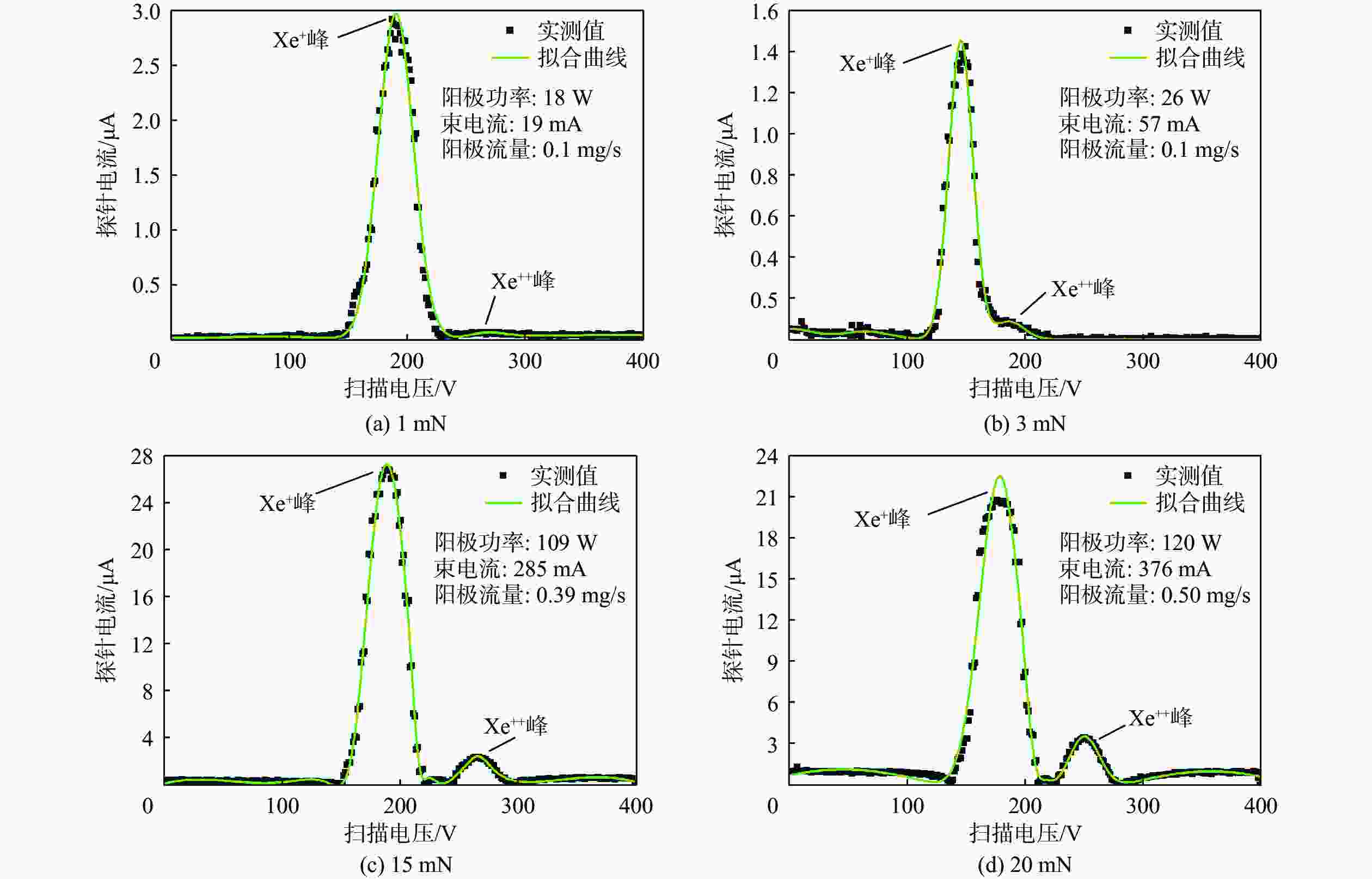 中性气体原子密度/m−3 原初电子密度/m−3 麦氏电子温度/eV 放电室产生离子电流/mA 原初电子与麦氏电子密度比 0.81×1018 0.85×1017 5.35 476 0.231 表 3 不同推力工况点下双荷离子比例数据对比