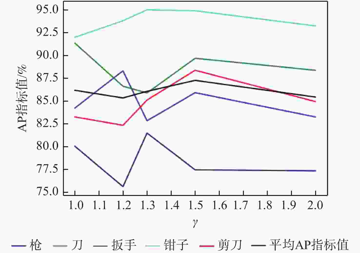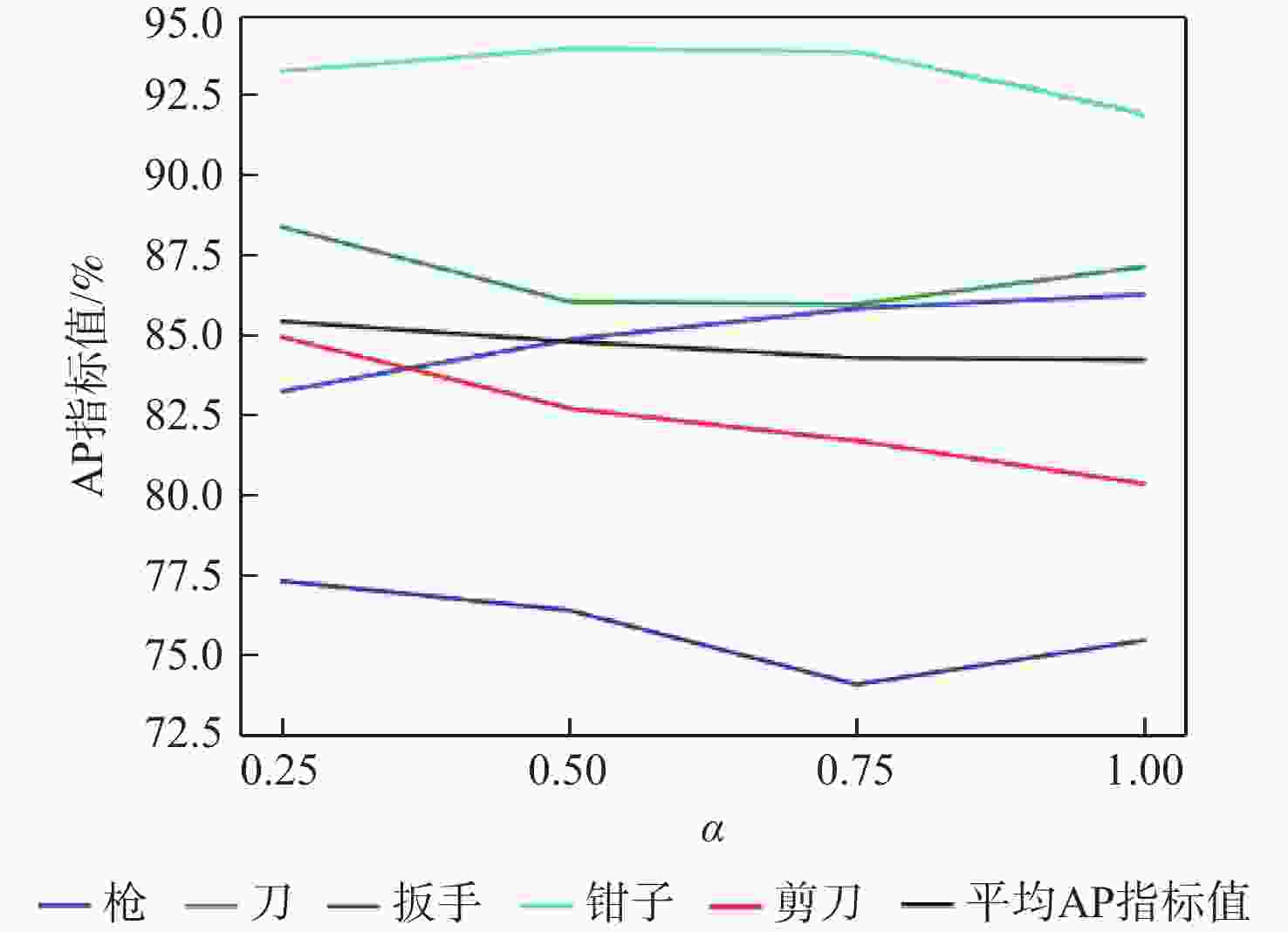 % 方法 AP指标值 平均AP指标值 刀 枪 扳手 钳子 剪刀 ResNet101 84.2 87.7 69.3 85.3 60.4 77.4 Inception-V3 83.8 90.1 68.1 84.5 58.7 77.0 RFBNet 72.9 90.5 64.9 77.3 68.6 74.8 ACMNet 80.2 91.5 83.6 85.9 80.3 84.3 Cascade R-CNN 80.4 87.4 82.4 86.4 86.3 84.6 ResNet101+CHR 87.2 85.5 71.2 88.3 64.7 79.4 本文 90.5 86.5 80.5 97.3 89.4 88.8 表 2 消融实验结果