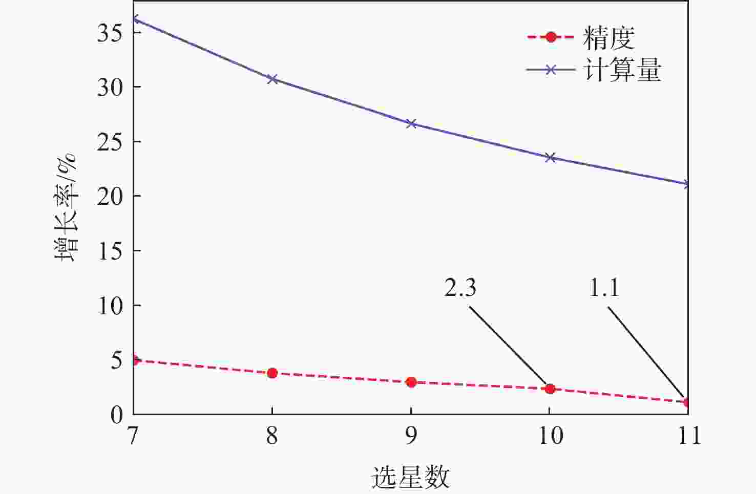 选星数 平均误差 平均方差 平均耗时/ms 遍历法平均耗时/ms 7 0.025 5 0.019 8 212 12 837 8 0.026 3 0.021 9 237 34 251 9 0.016 6 0.014 6 280 79 591 10 0.016 2 0.010 6 317 162 492 11 0.010 8 0.002 9 360 293 288 表 4 选星方法效果对比