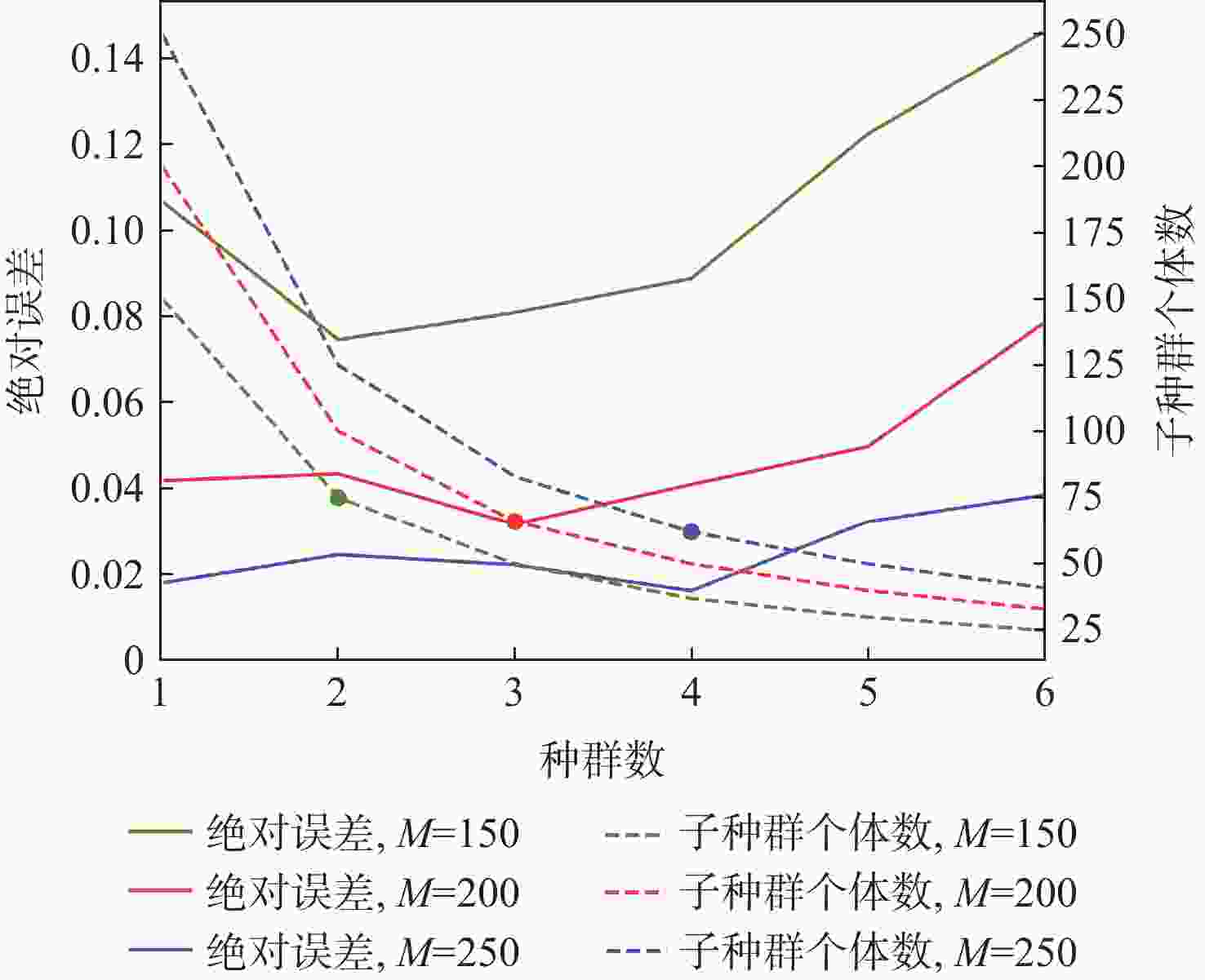 种群数 平均误差 平均方差 平均耗时/ms M=150 M=200 M=250 M=150 M=200 M=250 M=150 M=200 M=250 1 0.1071 0.0962 670 0.0419 0.0436 879 0.0180 0.0185 1104 2 0.0748 0.0685 355 0.0435 0.0412 466 0.0246 0.0174 576 3 0.0811 0.0747 253 0.0317 0.0197 322 0.0222 0.0172 409 4 0.0890 0.0798 187 0.0410 0.0339 256 0.0162 0.0106 317 5 0.1227 0.1340 161 0.0498 0.0429 222 0.0323 0.0231 265 6 0.1467 0.1467 149 0.0787 0.0787 195 0.0385 0.0385 243 表 3 不同选星数下方法性能