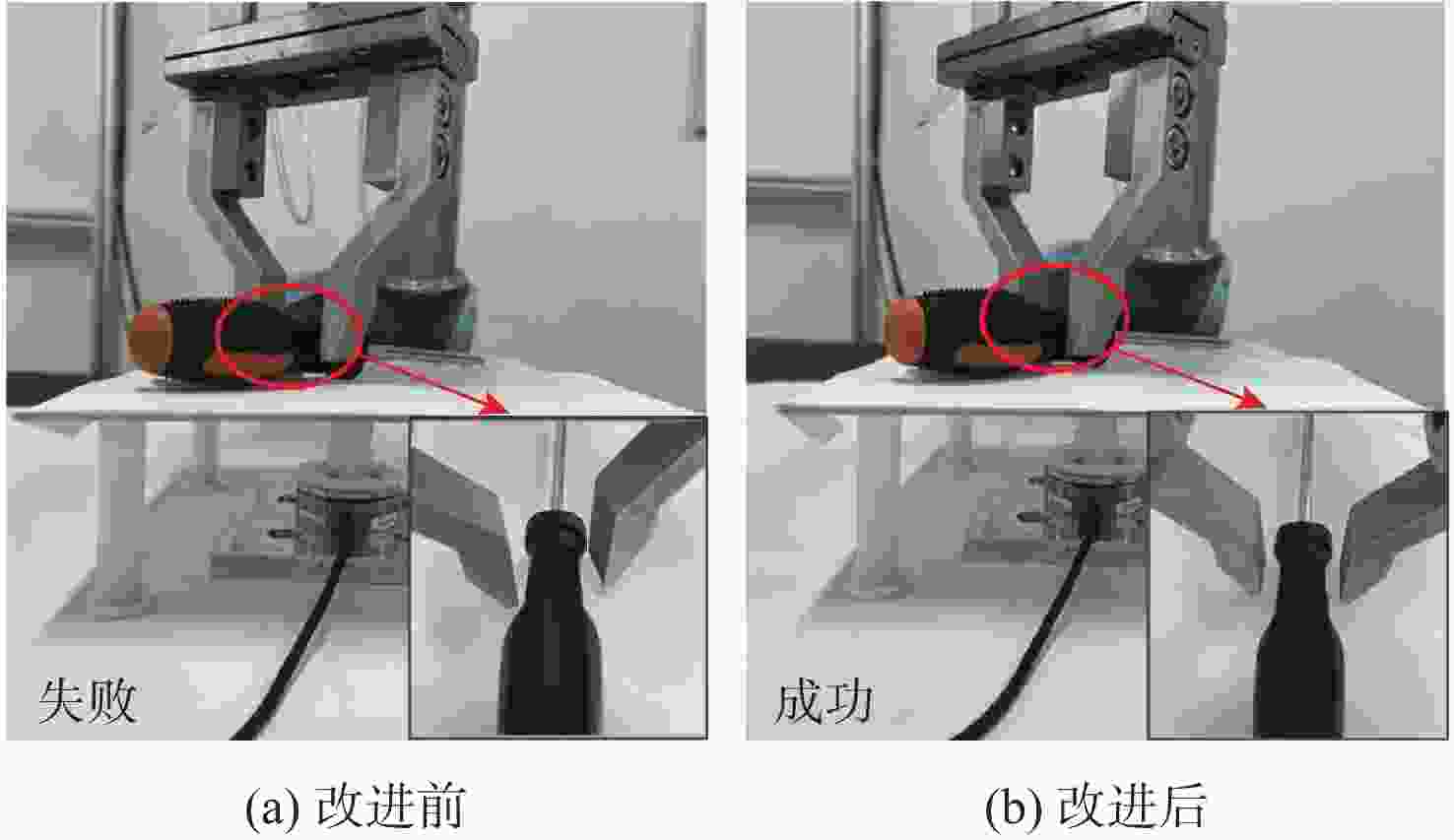 编号 目标抓取点(x, y, z)/mm 目标抓取角度/(°) 目标实际角度/(°) 抓取扭矩/(N·mm) 改进前 改进后 改进前 改进后 改进前 改进后 实验1 (153.41, −675.29, 102.35) (153.41, −675.29, 102.35) 50 52 53 4.0 2.3 实验2 (13122, −603.70, 99.16) (13122, −603.70, 99.16) 50 58 58 9.5 0.3 实验3 (161.96, −558.44, 102.71) (161.96, −558.44, 102.71) 140 157 156 15.0 2.6 实验4 (111.15, −574.50, 98.79) (111.15, −574.50, 98.79) 10 21 19 8.0 5.0 实验5 (114.63, −732.19, 96.96) (114.63, −732.19, 96.96) 30 39 47 19.0 11.0 实验6 (102.68, −657.68, 100.41) (102.68, −657.68, 100.41) 40 51 50 10.6 2.5 实验7 (127.41, −675.63, 100.53) (127.41, −675.63, 100.53) 40 46 45 4.0 1.5 实验8 (155.39, −597.67, 105.50) (155.39, −597.67, 105.50) 50 53 55 8.0 3.8 实验9 (176.65, −690.90, 103.57) (176.65, −690.90, 103.57) 90 111 113 17.5 4.0 实验10 (131.77, −739.27, 100.34) (131.77, −739.27, 100.34) 100 112 112 12.5 0 实验11 (194.20, −687.68, 101.49) (194.20, −687.68, 101.49) 30 36 35 5.0 2.5 实验12 (127.47, −590.49, 100.38) (127.47, −590.49, 100.38) 30 63 63 25.0 0 -