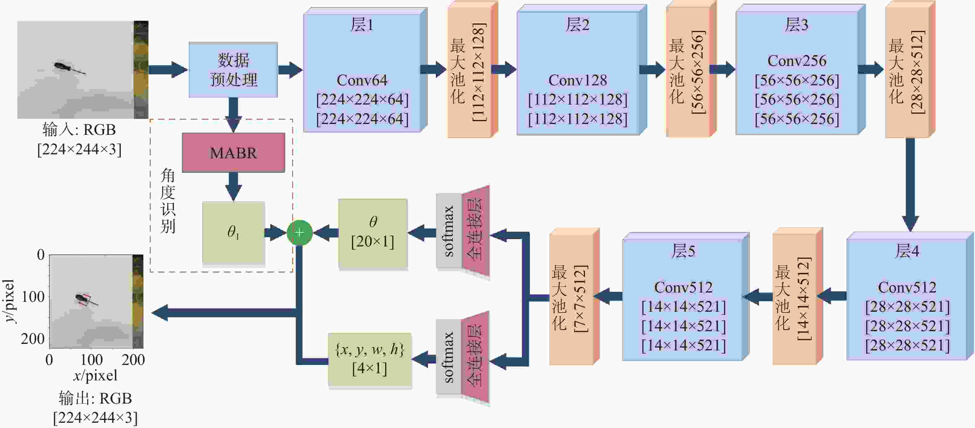 针对现有机器人抓取系统对硬件设备要求高、难以适应不同物体及抓取过程产生较大有害扭矩等问题,提出一种基于深度学习的视觉检测及抓取方法。采用通道注意力机制对YOLO-V3进行改进,增强网络对图像特征提取的能力,提升复杂环境中目标检测的效果,平均识别率较改进前增加0.32%。针对目前姿态估计角度存在离散性的问题,提出一种基于视觉几何组-16(VGG-16)主干网络嵌入最小面积外接矩形(MABR)算法,进行抓取位姿估计和角度优化。改进后的抓取角度与目标实际角度平均误差小于2.47°,大大降低两指机械手在抓取过程中对物体所额外施加的有害扭矩。利用UR5机械臂、气动两指机械手、Realsense D435相机及ATI-Mini45六维力传感器等设备搭建了一套视觉抓取系统,实验表明:所提方法可以有效地对不同物体进行抓取分类操作、对硬件的要求较低、并且将有害扭矩降低约75%,从而减小对物体的损害,具有很好的应用前景。