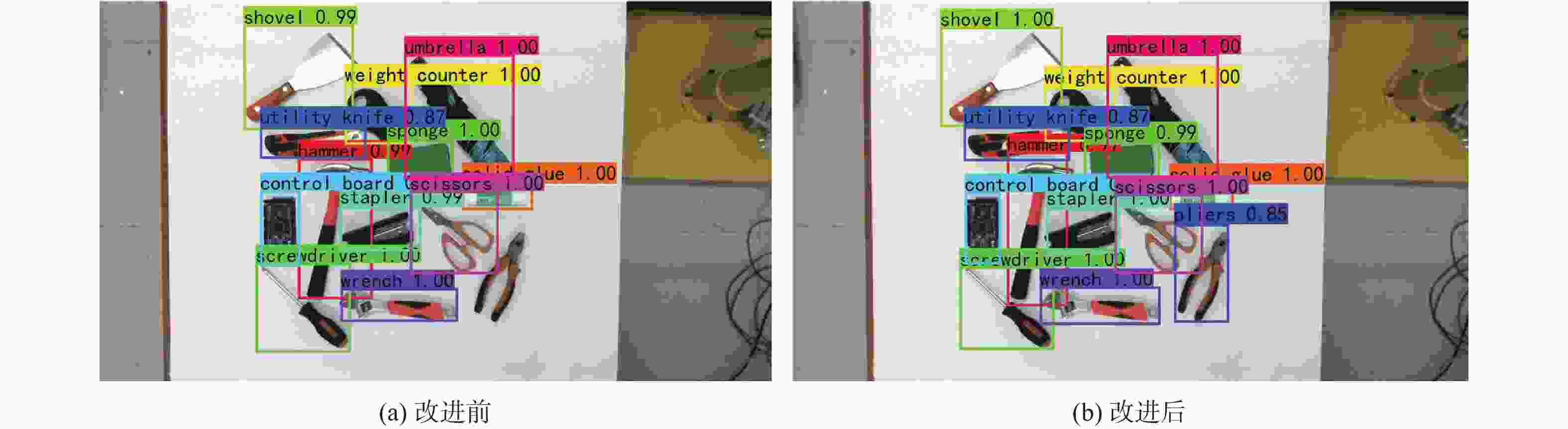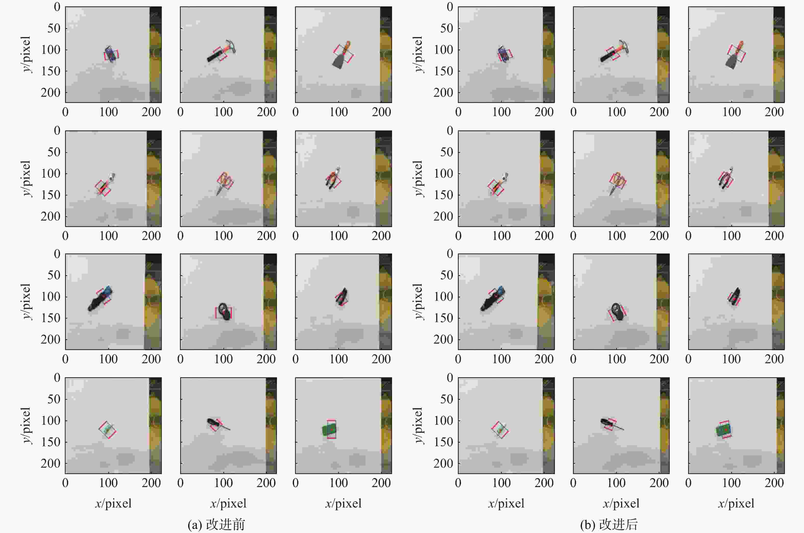 目标 目标抓取点(u, v)/像素 目标抓取角度/(°) 目标实际角度/(°) 改进前 改进后 改进前 改进后 control board (107, 112.2) (107, 112.2) 100 124 123 hammer (92.3, 109.3) (92.3, 109.3) 30 18 23 shovel (111.3, 108.5) (111.3, 108.5) 50 62 59 wrench (87.5, 132.5) (87.5, 132.5) 40 46 44 scissors (104.5, 118.3) (104.5, 118.3) 50 53 54 pliers (88.1, 114.5) (88.1, 114.5) 40 48 52 umbrella (88.5, 98.4) (88.5, 98.4) 30 35 35 weight counter (100.5, 136.2) (100.5, 136.2) 90 135 127 stapler (106.9, 104.7) (106.9, 104.7) 30 46 48 solid glue (98.2, 120.9) (98.2, 120.9) 40 45 45 screwdriver (83.6, 110.2) (83.6, 110.2) 130 161 162 sponge (84.6, 118.7) (84.6, 118.7) 180 13 14 表 3 抓取实验数据