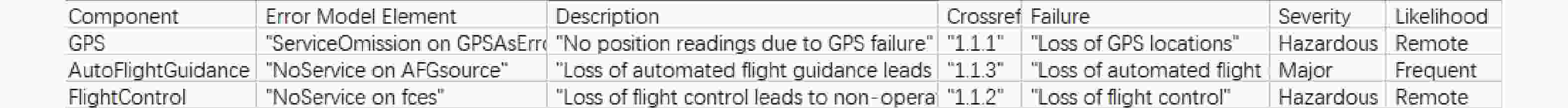 故障产生的根源 故障类型 概率 AutoPilot组件 服务缺失 6.5×10−5 FlightGuidance组件 服务缺失 4.5×10−5 AutoFlightGuidance组件