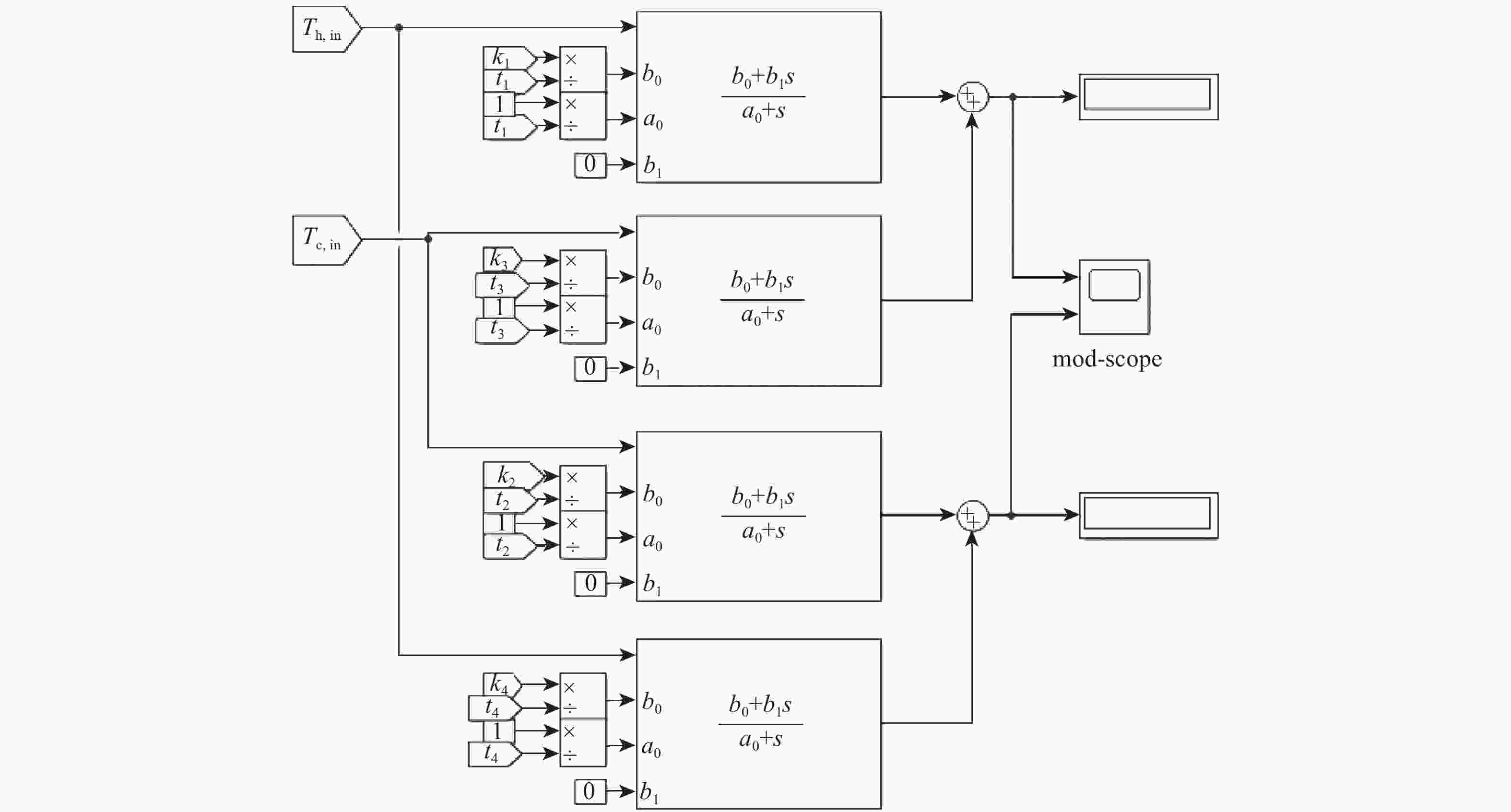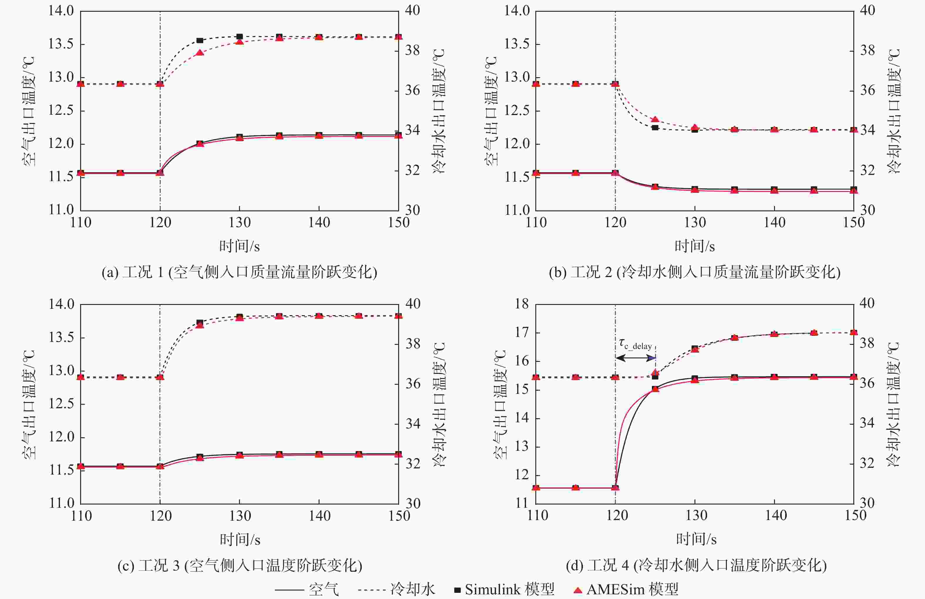 工况 质量流量/(kg·s−1) 入口温度/℃ 空气侧 冷却水侧 空气侧 冷却水侧 平衡 1.5 0.8 70 10 工况1 阶跃至1.65 0.8 70 10 工况2 1.5 阶跃至0.88 70 10 工况3 1.5 0.8 阶跃至77 10 工况4 1.5 0.8 70 阶跃至14 表 4 2种仿真模型所得出口温度对比
