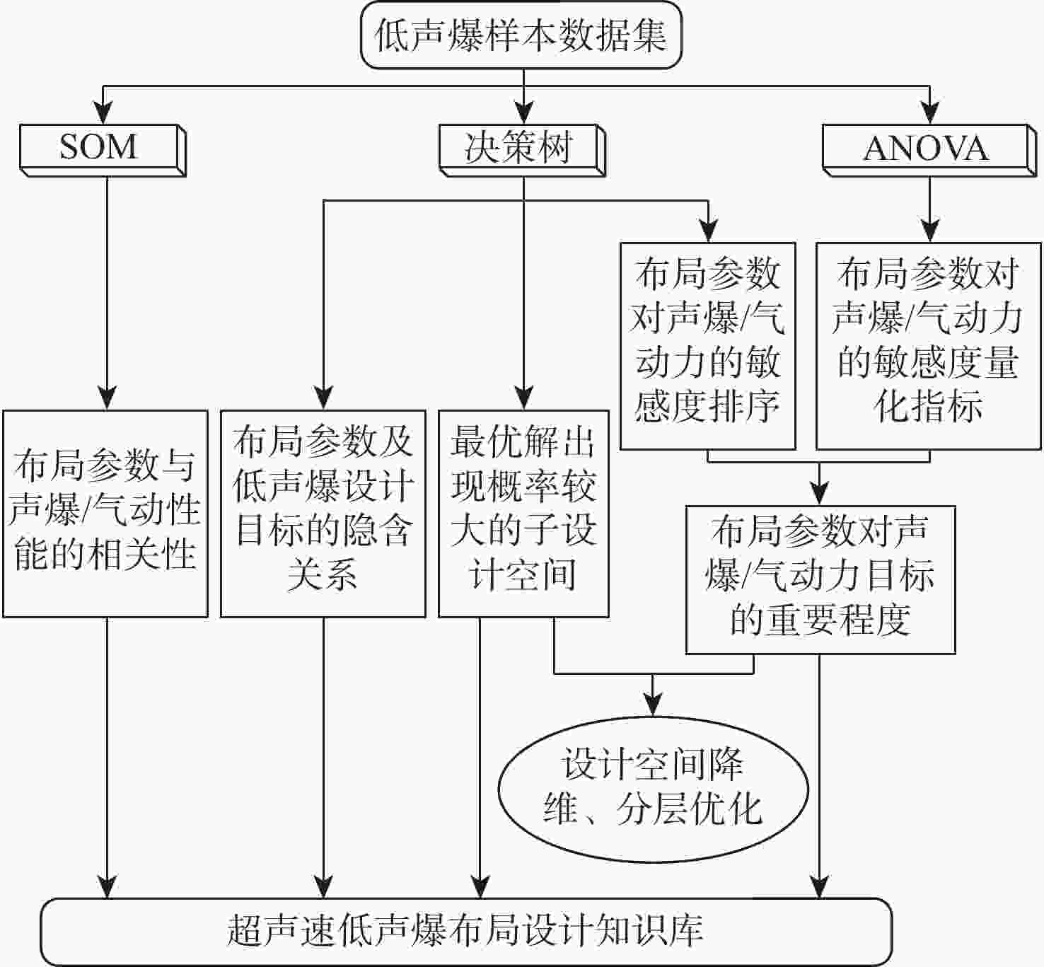 声爆抑制是发展新一代超声速民机必须突破的关键技术。飞行器总体布局参数对其声爆特性有重要影响。数据挖掘(DM)可以从大量的数据中通过算法搜索隐藏的信息,是飞行器设计知识提取的有力工具。选取后掠角、展弦比、梢根比、上反角、机身长细比5个总体布局参数作为设计变量,目标函数定义为远场感知噪声级,同时计算升、阻力系数作为气动力衡量指标。基于总变差分析(ANOVA)、决策树算法、自组织映射(SOM)网络组成的数据挖掘体系提取低声爆设计知识库。获得所选设计变量与声爆/气动力的相关度,并实现对设计变量的分层与降维。后掠角有最高设计优先级,长细比、上反角重要程度次之,展弦比与梢根比为低敏感变量。对于算例中的飞行器,在合理区间内选择较大的后掠角、上反角能够使声爆最小化的同时,设计适于超声速巡航的小展弦比布局。