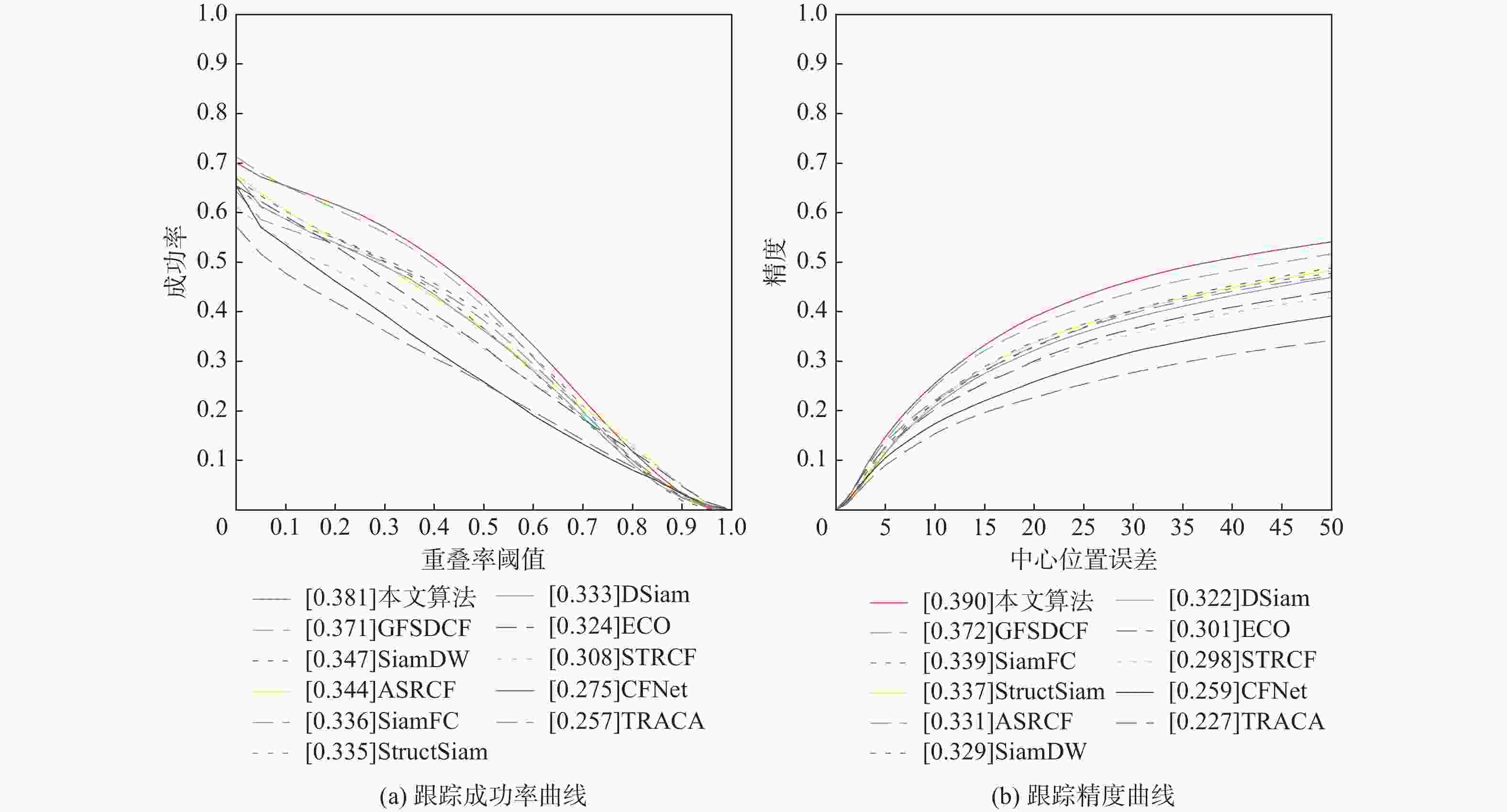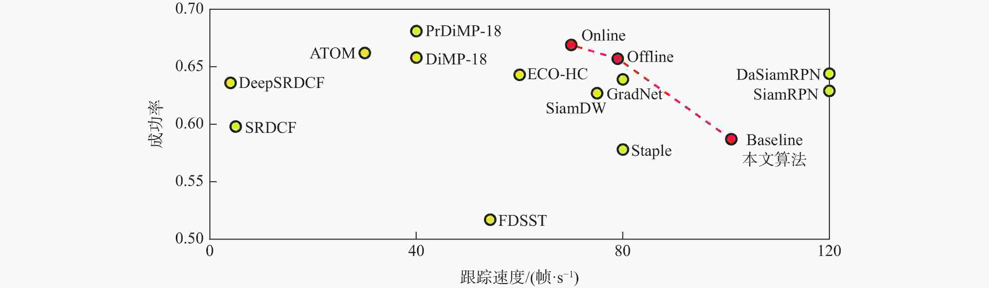 $\alpha $ 成功率 精度 0.50 0.655 0.870 0.55 0.669 0.890 0.60 0.651 0.869 0.65 0.658 0.878 0.70 0.659 0.876 0.75 0.660 0.870 0.80 0.655 0.875 0.85 0.659 0.875 0.90 0.659 0.880 0.95 0.653 0.866 表 2 不同算法在VOT2018数据集上的实验结果