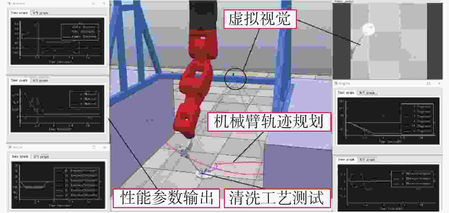 机场助航灯具清洗设备工作时需要远程实时监测设备状态和清洗质量。数字孪生通过虚拟平台映射清洗设备的工作情况,而目前虚拟环境的建立仍大量依赖于数据驱动,自身缺乏感知进化和虚拟仿真的能力,且对被执行件的关注较少。针对以上问题,提出基于多物理引擎的数字孪生模型。该系统利用CoppeliaSim构建数据和脚本双驱动的虚拟空间,融合了虚拟传感和视觉检测,并通过BlueZero实现实时通信。为解决通信延迟造成的数据流阶梯跳跃的问题,提出一种基于改进均值滤波的运动同步性增强算法,内嵌在Qt建立的数据集成子系统中。实验结果表明:经运动增强后,所提系统的虚实同步误差为74 ms,满足同步性要求;清洗机械臂关节角度跟踪的均方误差为0.827°,末端空间位置跟踪误差不超过2.775 mm,满足跟踪精度要求;所提模型能够动态呈现灯具被清洗时的污斑状况,证明了所提模型的合理性,满足助航灯具清洗过程的应用需求。