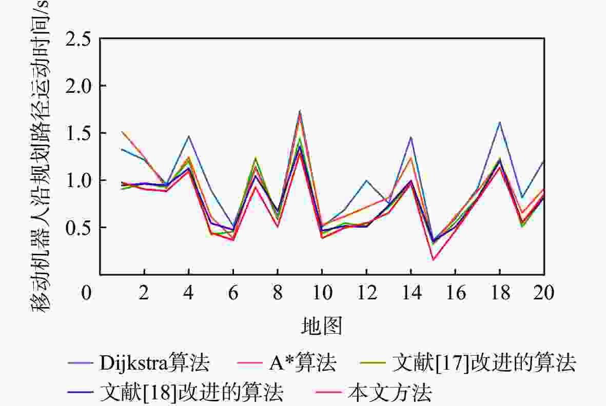 移动机器人在复杂环境下沿Dijkstra算法规划的路径运动时,由于所规划的路径存在转折点多、部分转折角度小等问题,导致移动机器人不得不频繁转向,甚至要暂停才能完成转向,严重影响机器人的工作效率。利用几何拓扑学方法,结合实际场景信息,提出一种基于Dijkstra算法的平滑路径规划方法。根据应用场景获取连续化地图,将连续化地图离散化后随机生成离散点阵,计算各点之间的欧氏距离,选取与各离散点距离较近、且连线不跨越障碍的多个点,将其连接并生成离散图。在离散图中利用Dijkstra算法搜索最优路径作为引导路径。当移动机器人沿引导路径运动时,结合实际场景信息,采用几何拓扑学计算出移动机器人每一时刻应该采取的最佳动作和运行路线。实验结果表明:所提方法能够有效减少移动机器人运动中的累计转弯角度,增大最小平均转折角度,提高所规划路径的平滑度,从而缩短移动机器人的运动时间,提升机器人的工作效率。