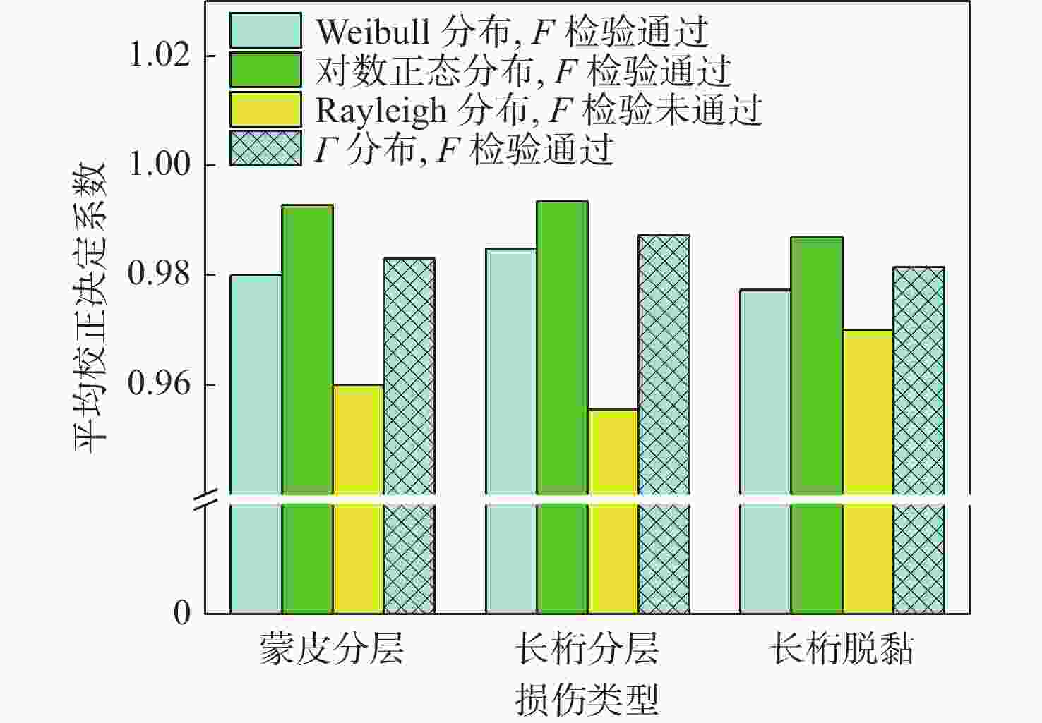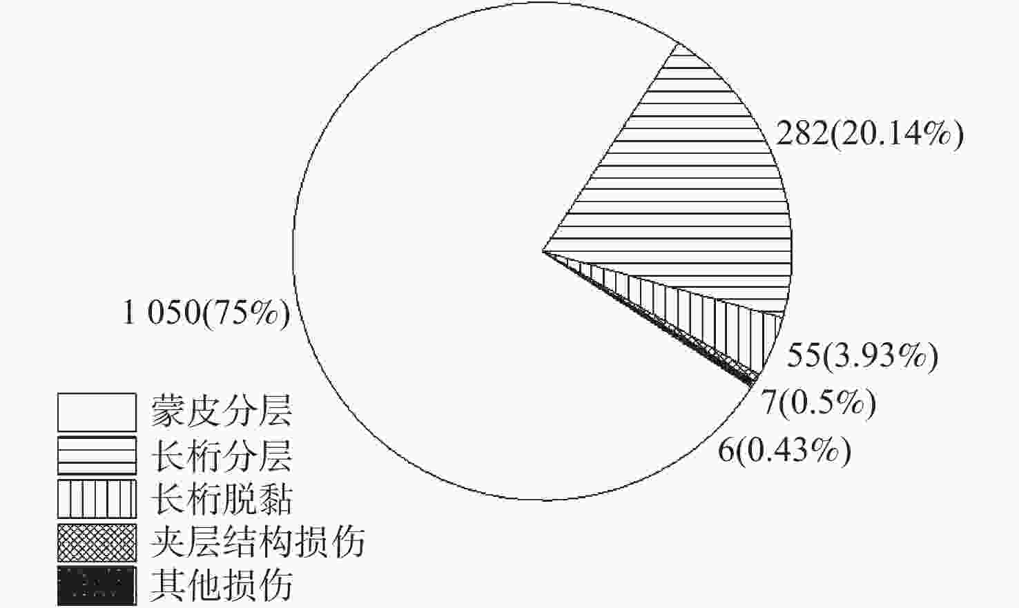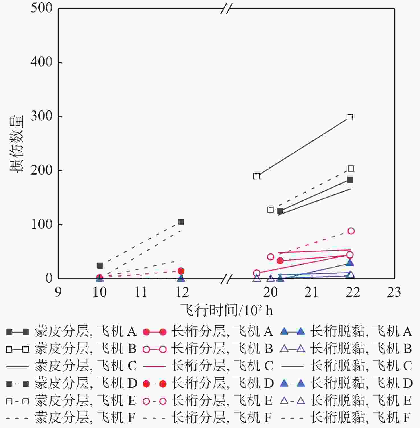 损伤类型 几何参数 假设:fq(x)=ffleet(x) A B C D E F 蒙皮分层 L √ √ √ √ √ √ W √ √ √ √ √ √ LW √ √ √ √ √ * L/W √ * √ * √ √ 长桁分层 L * √ × √ * × W √ √ × * √ × LW √ √ × * √ × L/W √ √ × √ × × 长桁脱粘 L √ × √ — √ — W √ * × √ LW √ √ √ √ L/W √ × * √ 注:√表示接受假设,即认为2个损伤几何参数分布函数一致;*表示在α=0.05时拒绝假设,但在α=0.01时接受假设,可以认为2个分布相近;×表示拒绝假设,即认为2个损伤几何参数分布函数不一致;—表示当前时刻损伤未检出或极少,无法进行假设检验。 -