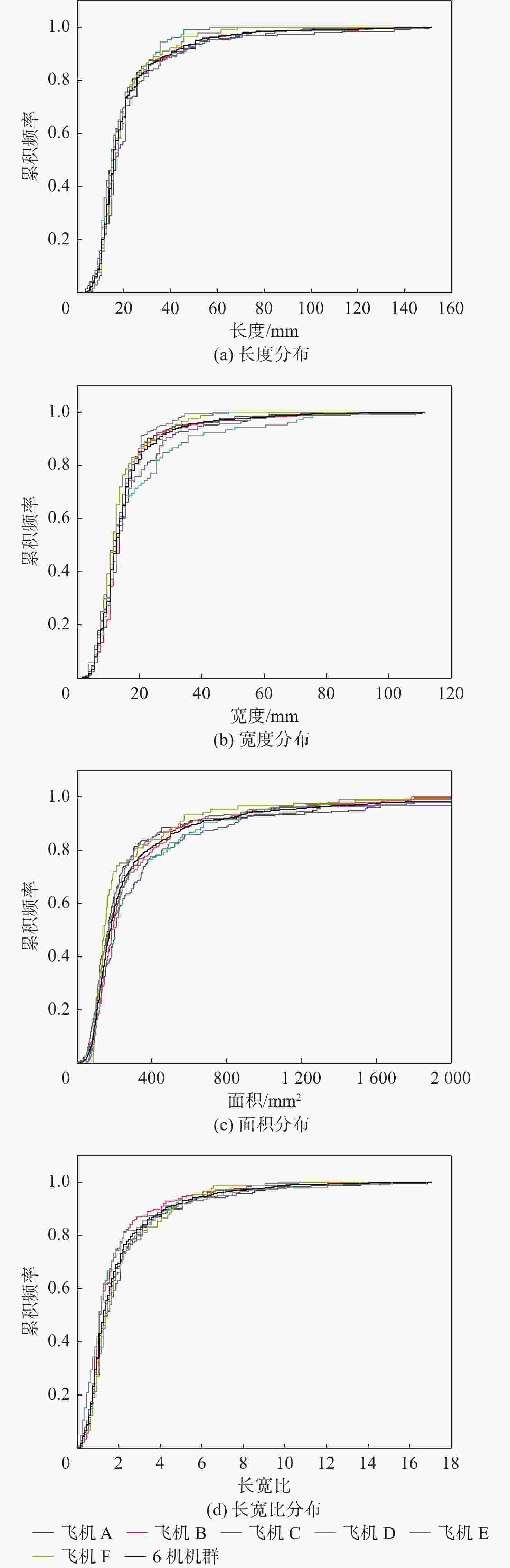 损伤类型 几何参数 假设 A B C D E F 蒙皮分层 L fq(x)=fB(x ) √ 基准 √ √ √ √ W √ √ √ √ * LW * √ √ √ × L/W √ √ √ × √ 长桁分层 L fq(x)=fE(x ) × * × √ 基准 * W √ √ × * × LW √ √ × √ × L/W × × × √ √ 长桁脱粘 L fq(x)=fA(x ) 基准 × √ — √ — W * × √ LW × √ √ L/W × × √ 注:√表示接受假设,即认为2个损伤几何参数分布函数一致;*表示在α=0.05时拒绝假设,但在α=0.01时接受假设,可以认为2个分布相近;×表示拒绝假设,即认为2个损伤几何参数分布函数不一致;—表示当前时刻损伤未检出或极少,无法进行假设检验。 表 5 单架飞机与机群的损伤几何参数(K-S检验,α=0.05)