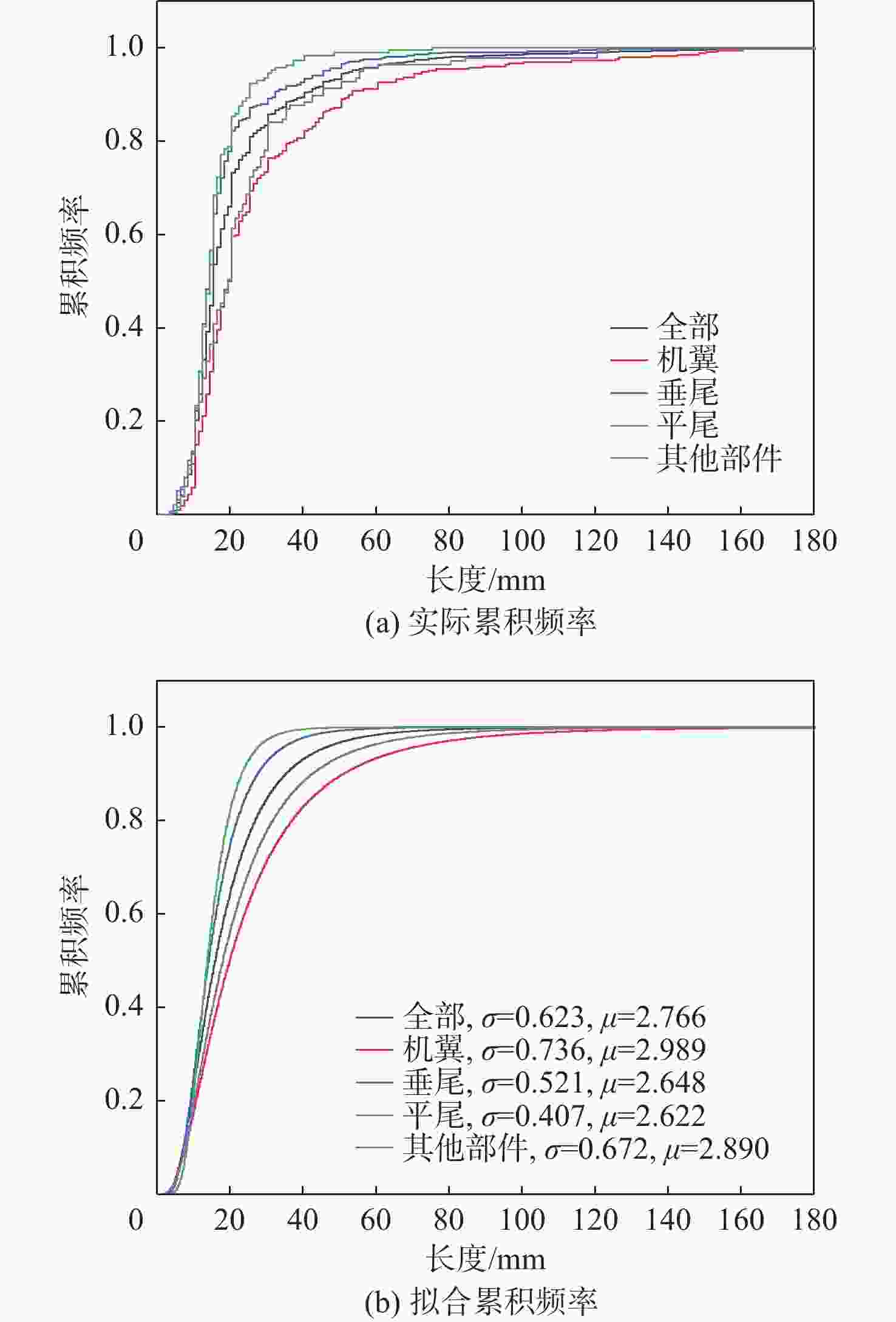 拟合对象 几何参数 ${\sigma _{{t_1}}} $ ${\mu _{{t_1}}} $ ${\sigma _{{t_2}}} $ ${\mu _{{t_2}}} $ 飞机A L 0.685 2.762 0.664 2.699 W 0.551 2.404 0.584 2.414 LW 1.007 5.153 0.996 5.085 L/W 0.948 0.330 0.911 0.271 飞机B L 0.707 2.832 0.607 2.757 W 0.580 2.567 0.504 2.541 LW 1.048 5.423 0.951 5.293 L/W 0.894 0.179 0.829 0.149 飞机C L 0.643 2.936 0.622 2.858 W 0.744 2.551 0.671 2.512 LW 1.057 5.491 1.045 5.346 L/W 0.869 0.382 0.876 0.321 飞机D L 0.532 2.692 0.504 2.631 W 1.073 2.685 0.765 2.527 LW 1.316 5.387 0.960 5.210 L/W 1.088 −0.079 0.884 −0.054 飞机E L 0.588 2.889 0.657 2.794 W 0.477 2.434 0.455 2.462 LW 0.888 5.281 0.816 5.198 L/W 0.740 0.453 0.879 0.336 飞机F L 0.536 2.770 W 0.541 2.380 LW 0.813 5.093 L/W 0.833 0.354 注:空白处为仅检出1处损伤因此不予拟合。 表 3 不同飞行时长的损伤分布K-S检验(α=0.05)