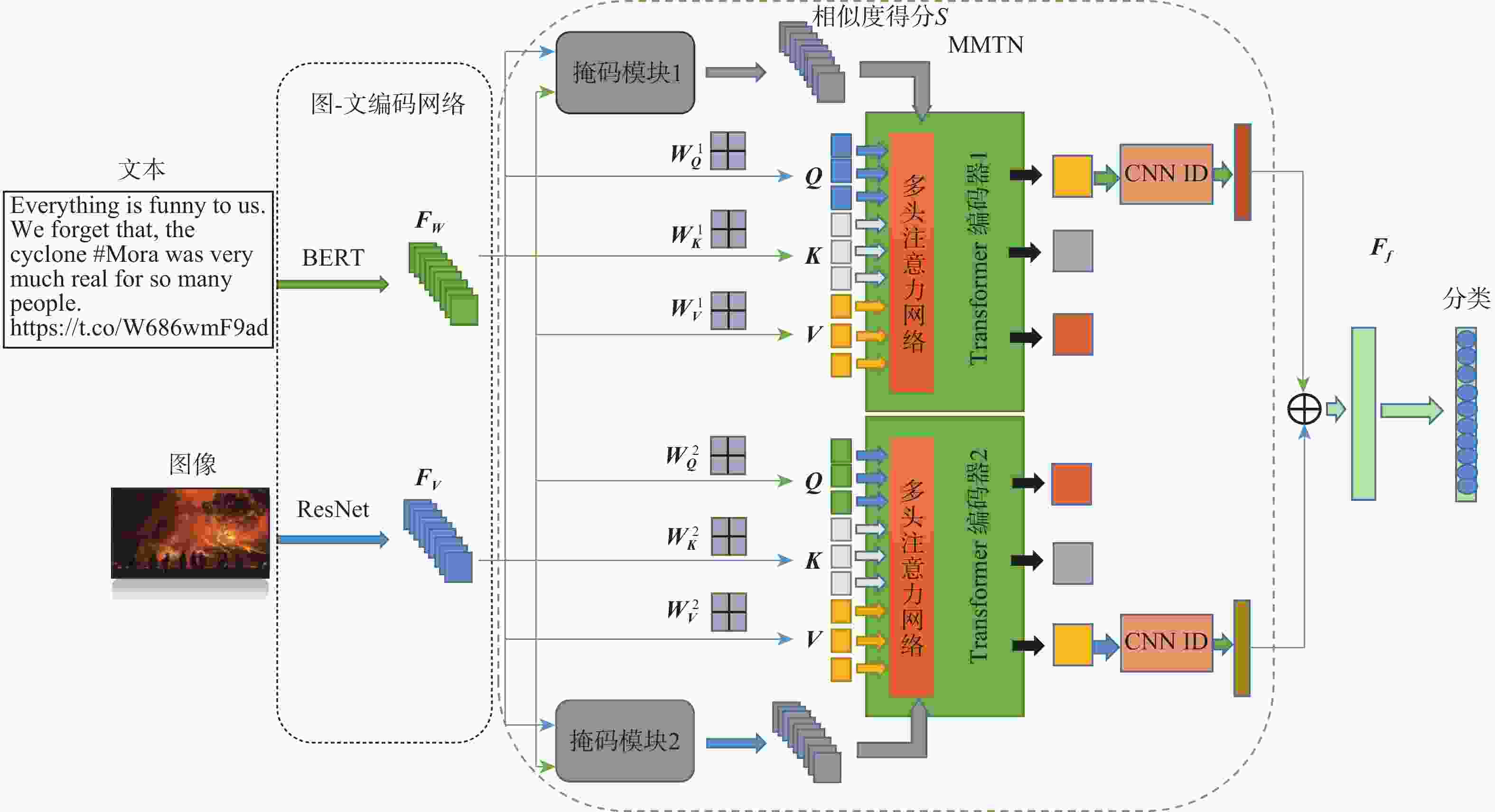 多模态社会事件分类的关键是充分且准确地利用图像和文字2种模态的特征。然而,现有的大多数方法存在以下局限性:简单地将事件的图像特征和文本特征连接起来,不同模态之间存在不相关的上下文信息导致相互干扰。因此,仅仅考虑多模态数据模态间的关系是不够的,还要考虑模态之间不相关的上下文信息(即区域或单词)。为克服这些局限性,提出一种新颖的基于多模态掩码Transformer网络(MMTN)模型的社会事件分类方法。通过图-文编码网络来学习文本和图像的更好的表示。将获得的图像和文本表示输入多模态掩码Transformer网络来融合多模态信息,并通过计算多模态信息之间的相似性,对多模态信息的模态间的关系进行建模,掩盖模态之间的不相关上下文。在2个基准数据集上的大量实验表明:所提模型达到了最先进的性能。