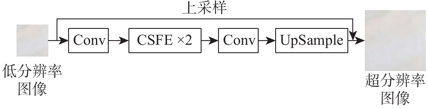 方法 PSNR/dB SSIM 时延/ms s=2 s=4 s=2 s=4 s=2 s=4 Bicubic 30.56 26.74 0.91 0.81 0.2 0.2 SRCNN[5] 33.21 28.86 0.95 0.91 15 19 FSRCNN[21] 34.12 29.93 0.96 0.92 72 92 EDSR[6] 35.31 32.96 0.97 0.94 151 177 SplitSR[22] 35.05 31.46 0.96 0.93 48 56 ESPCN[23] 34.54 31.11 0.95 0.92 88 94 本文 35.13 32.94 0.97 0.94 18 21 -