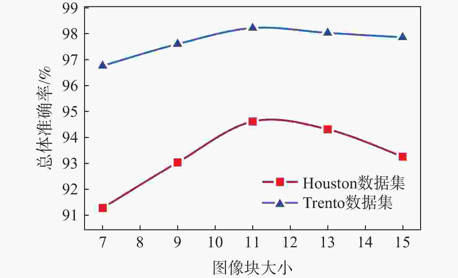 数据集 特征${\boldsymbol{X}}$ 特征${\boldsymbol{Y}}$ 总体准确率/% Houston 无 无 90.20 LiDAR 高光谱 92.56 高光谱 LiDAR 94.60 Trento 无 无 97.25 LiDAR 高光谱 98.06 高光谱 LiDAR 98.21 表 3 Houston数据集上不同分类方法的准确率