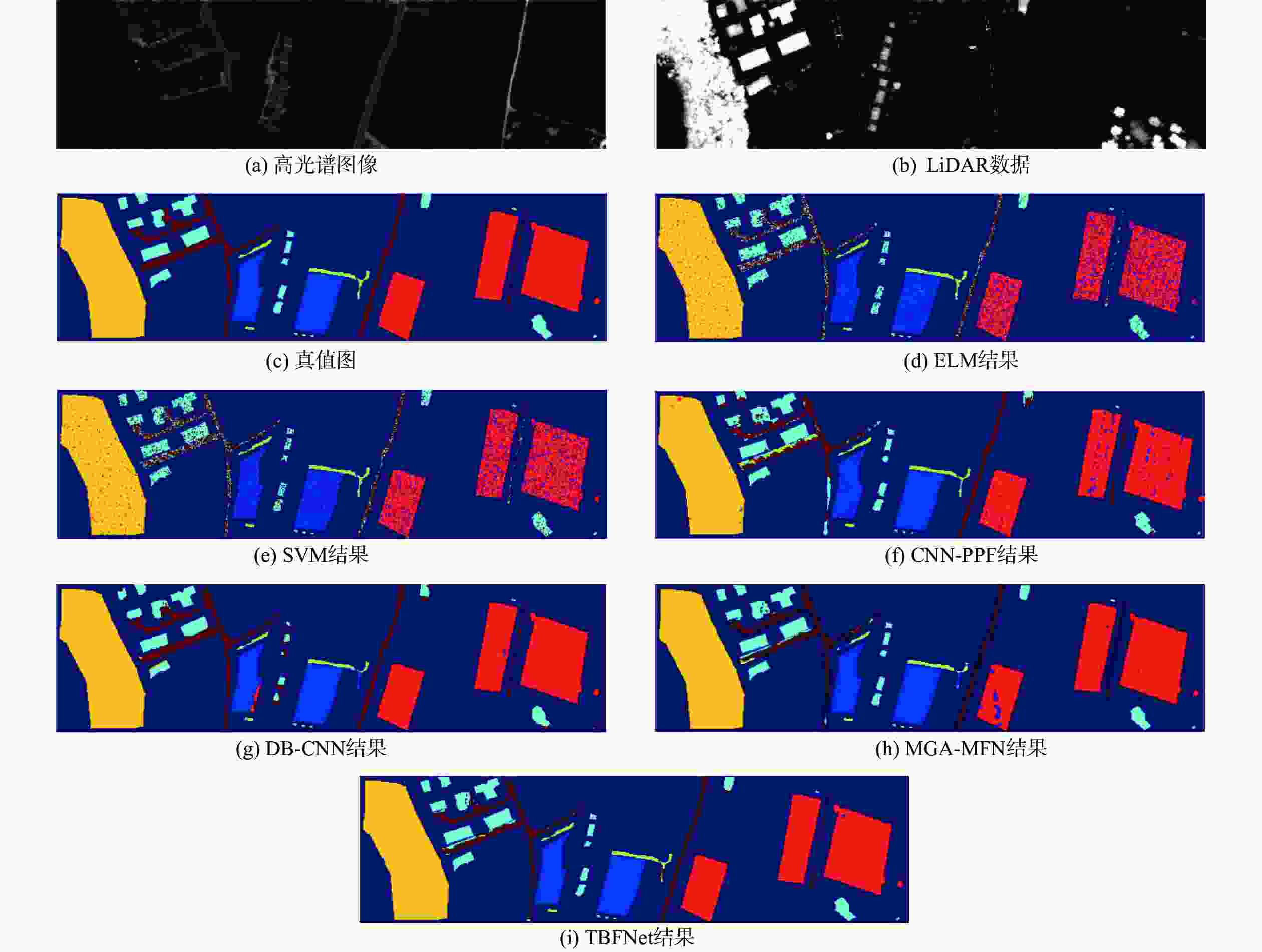 (187/473)ELM 84.80 49.13 80.27 79.06 71.58 99.60 98.52 SVM 77.53 60.04 81.02 85.49 75.09 100.0 98.31 CNN-PPF 71.20 57.12 80.55 62.82 63.86 100.0 98.10 DB-CNN 84.70 65.44 88.24 89.53 92.28 96.76 99.79 MGA-MFN 85.84 81.27 96.20 97.50 92.88 100.0 100.0 TBFNet 95.35 93.90 95.31 95.73 97.35 99.60 99.58 注:类别后括号中数字表示训练样本数和测试样本数。 表 4 Houston数据集上不同分类方法的性能比较