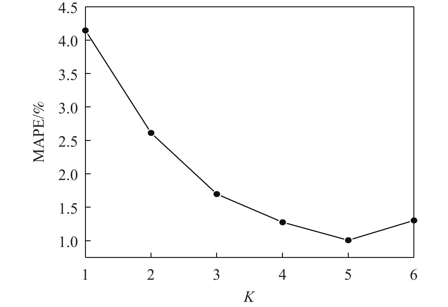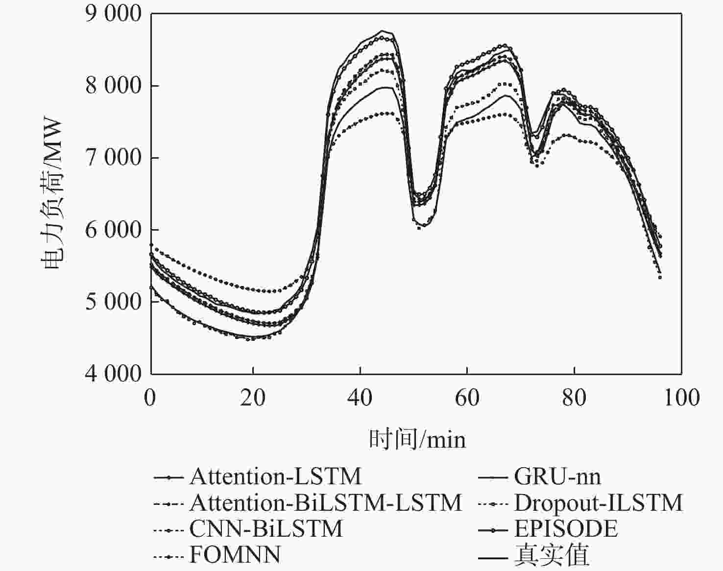 方法 MAPE/% RMSE/MW 时间/s EPISODE 1.0115 81.2460 0.2953 Attention-LSTM 2.7877 233.0022 0.7178 FOMNN 2.1967 194.7047 0.3050 GRU-NN 6.2449 472.8429 0.7624 Dropout-ILSTM 5.5497 392.0774 0.9222 Attention-BiLSTM-LSTM 2.1984 194.7577 1.5094 CNN-BiLSTM 4.1792 422.5311 2.7181 表 3 EPISODE与衍生模型的预测精度对比