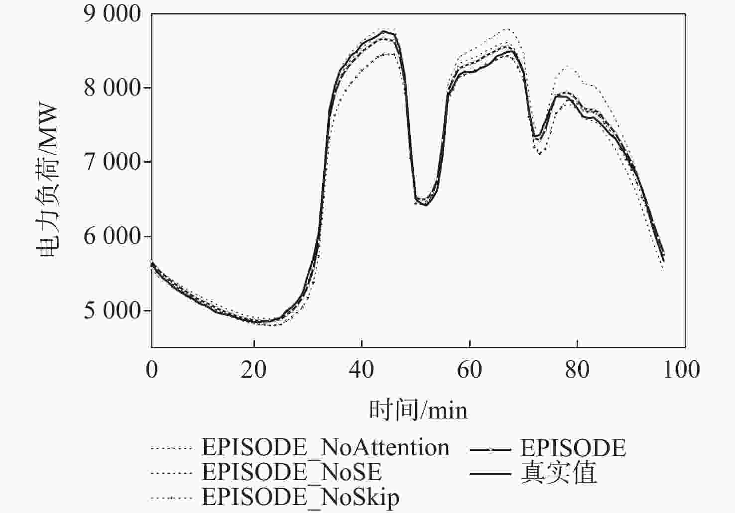 模型 MAPE/% RMSE/MW EPISODE 1.0115 81.2460 EPISODE_ NoSE 1.4542 123.2089 EPISODE_NoGRU_Skip 1.6223 168.6200 EPISODE_NoAttention 1.6427 188.6485 -