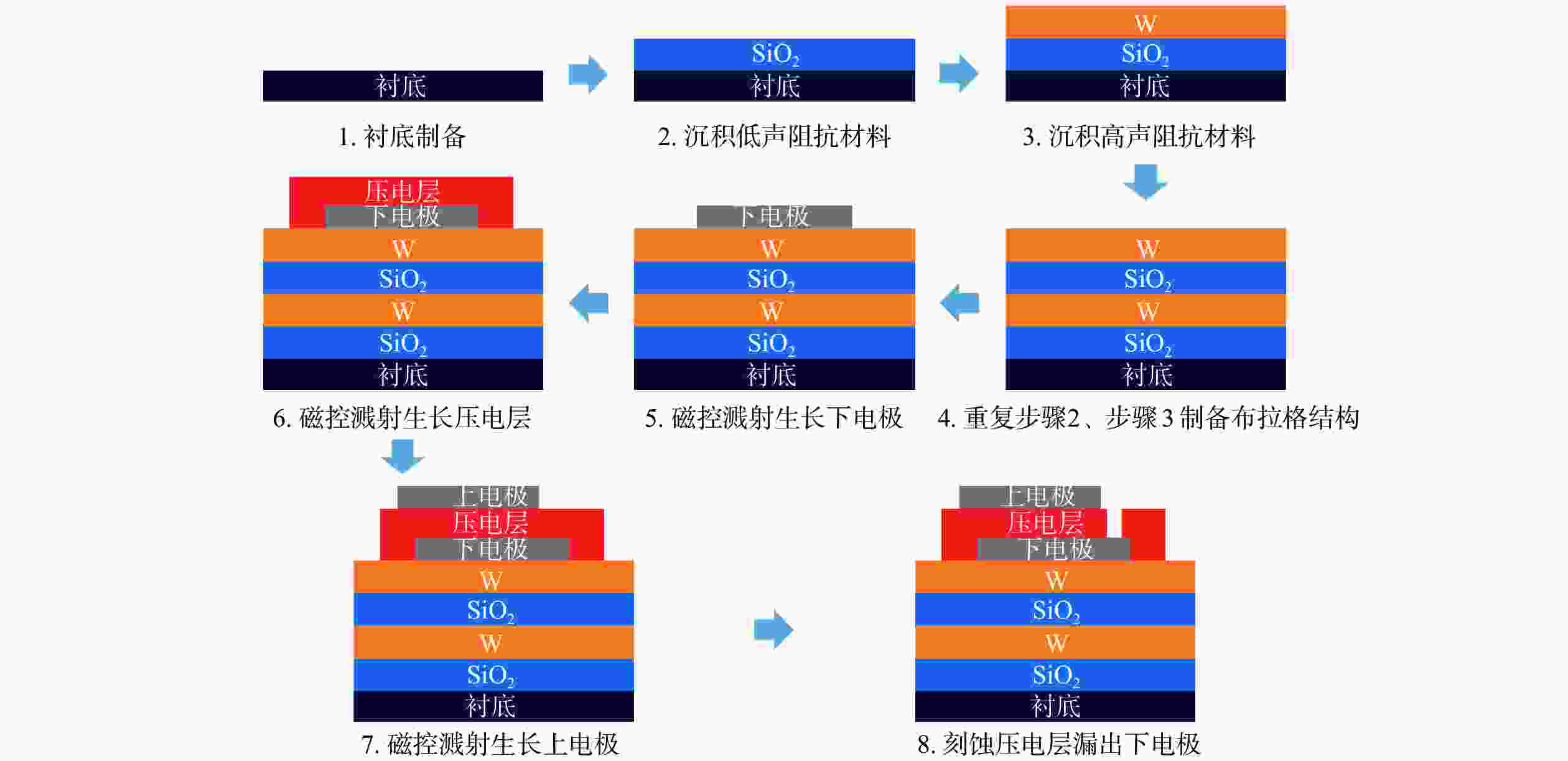 体声波谐振器的有效耦合系数和品质因数决定了体声波滤波器的整体性能。有效耦合系数依赖于叠层结构和压电材料。而品质因数高度依赖于损耗机制,主要为电学损耗和声学损耗。对于固态装配型谐振器(SMR),声学损耗主要为透过衬底的能量泄漏。为提高SMR的品质因数,改进了布拉格堆叠结构,使纵波和剪切波同时被约束在压电堆叠结构中,以减少声能对衬底的泄漏。同时,为抑制谐振腔的杂散模式,优化了布拉格结构顶层薄膜厚度,器件色散特性由Ⅱ型变为Ⅰ型。通过仿真和实验表明:基于优化布拉格结构的SMR性能得到了明显改善。