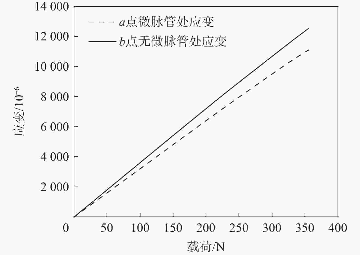组别 微脉管直径/mm 拉伸强度/MPa 相对误差/% 试验 有限元 2 0.255 1852.09 1803.7 −2.6 3 0.4 1424.59 1430.0 0.38 表 11 第2组试验件2处刚度有限元和试验结果对比