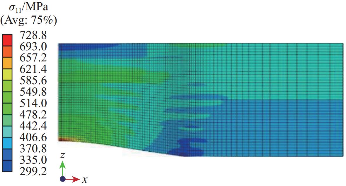 ($ {\sigma _{11}} < 0 $)$ {\left(\dfrac{{\sigma }_{11}}{{X}_{\text{C}}}\right)}^{2}\geqslant 1 $ 基体拉伸失效