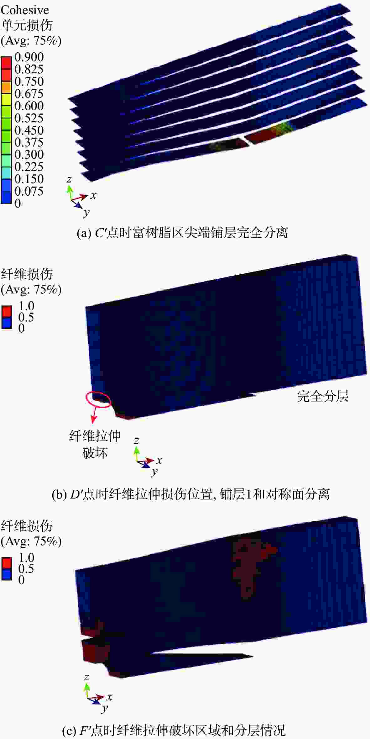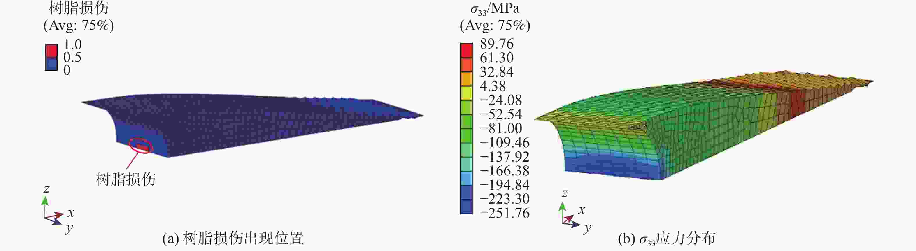 失效模式 退化系数 纤维拉伸失效 $ {E_{11}} = 0.07{E_{11}},{G_{12}} = 0.07{G_{12}},{\mu _{12}} = 0.07{\mu _{12}} $ 纤维压缩失效 $ {E_{11}} = 0.14{E_{11}},{G_{12}} = 0.14{G_{12}},{\mu _{12}} = 0.14{\mu _{12}} $ 基体拉伸失效 ${E_{22}} = 0.2{E_{22}},{G_{12}} = 0.2{G_{12}},{G_{23}} = 0.2{G_{23}},$ ${\mu _{12}} = 0.2{\mu _{12}},{\mu _{23}} = 0.2{\mu _{23}}$ 基体压缩失效 $ {E}_{22}=0.4{E}_{22},{G}_{12}=0.4{G}_{12},{G}_{23}=0.4{G}_{23}, $ ${\mu _{12}} = 0.4{\mu _{12}},{\mu _{23}} = 0.4{\mu _{23}}$ 表 7 富树脂区长度和各铺层厚度实际测量尺寸